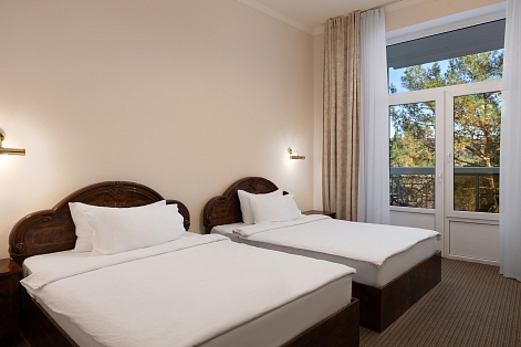В номере: вешалка, зеркало, кровати полутороспальные, прикроватные тумбочки, столик журнальный, шкаф, сейф, система общего кондиционирования, телевизор ЖК, телефон, холодильник, чайная станция, чайный набор посуды