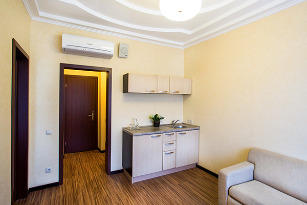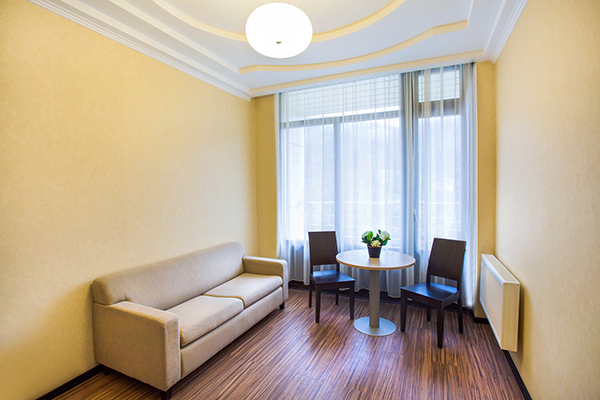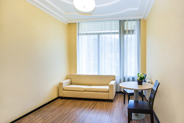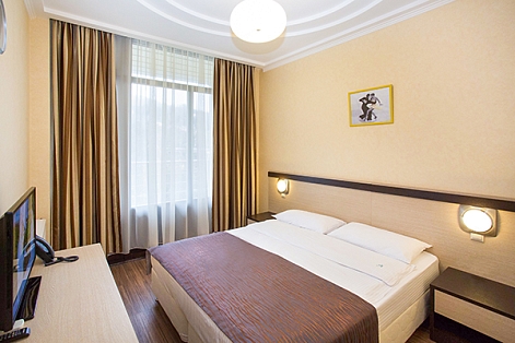 В номере: вешалка, диван, зеркало, кровати односпальные /одна двуспальная кровать, прикроватные тумбочки, стол, столик журнальный, стулья, шкаф-купе, система общего кондиционирования, телевизор, телефон