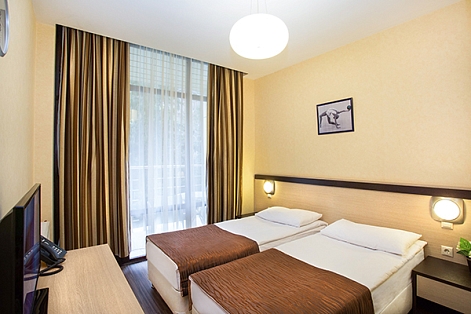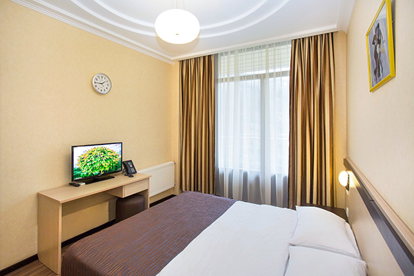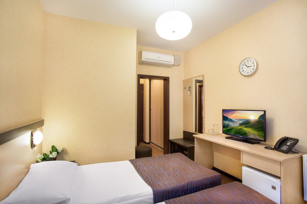 В номере: вешалка, зеркало, кровати односпальные, прикроватные тумбочки, пуфик, стол, шкаф-купе, сейф, система общего кондиционирования, телевизор, телефон, холодильник
