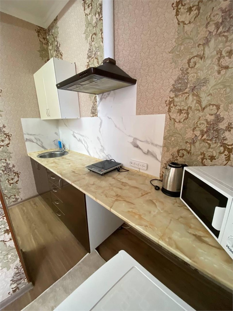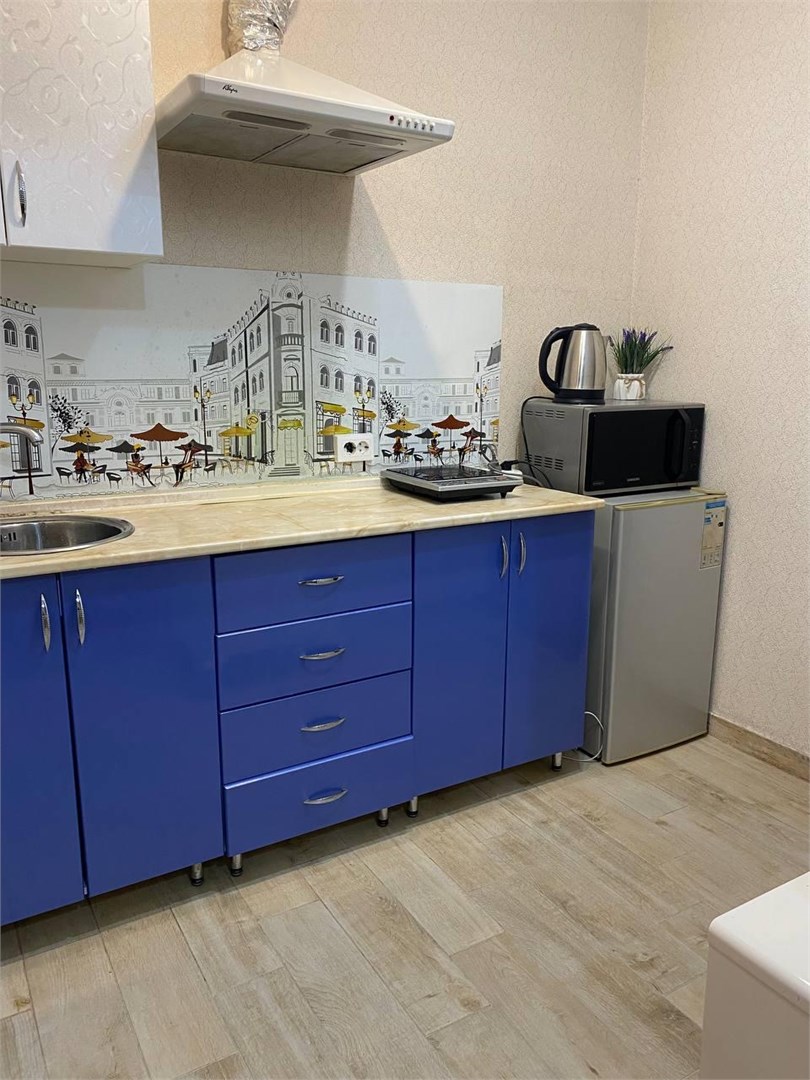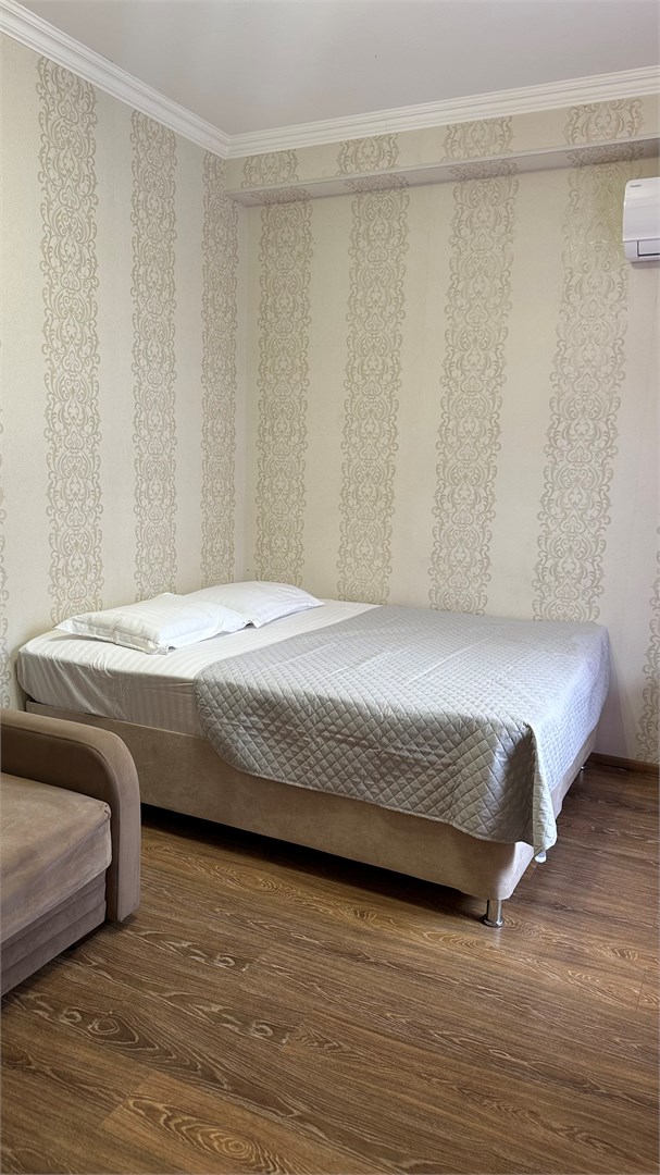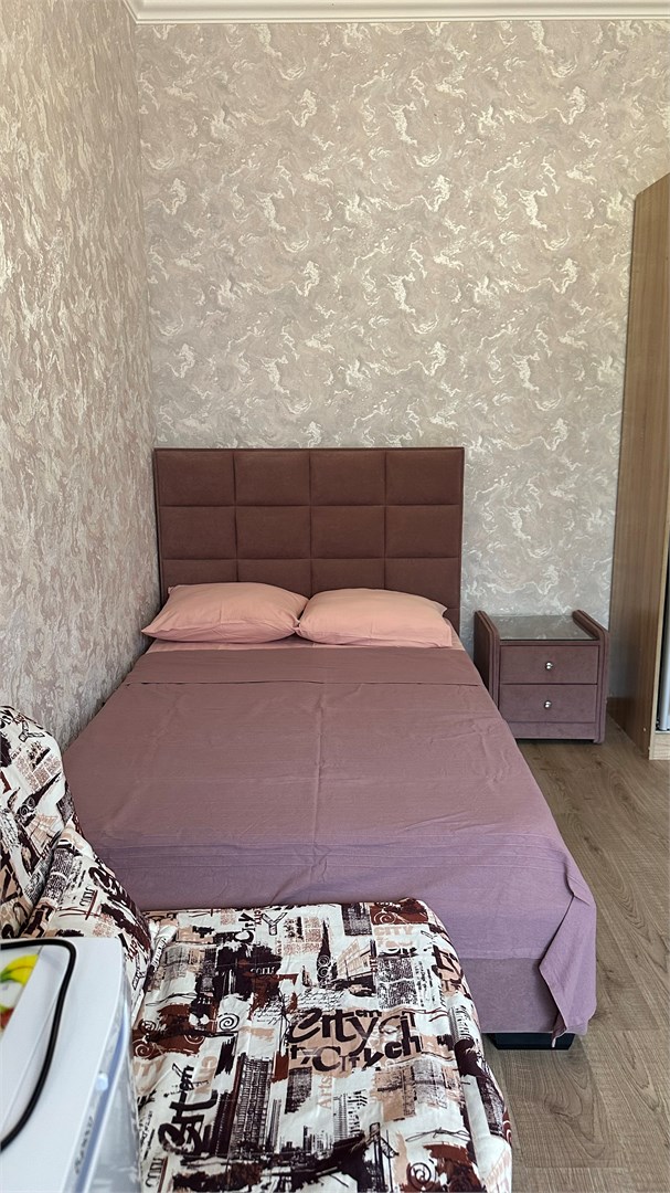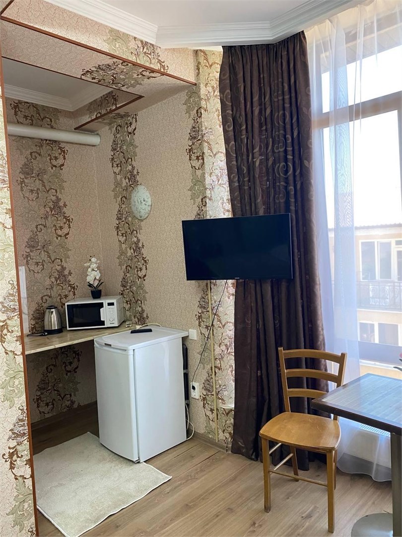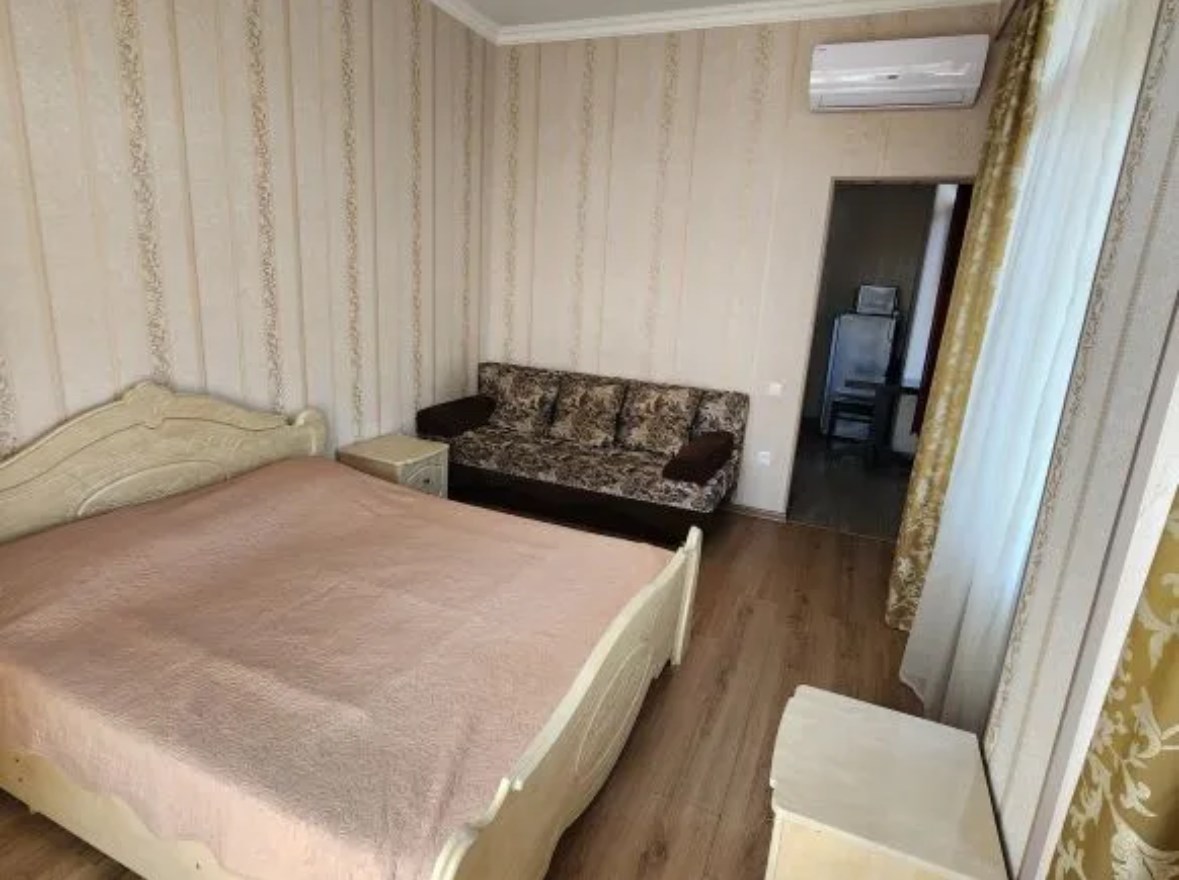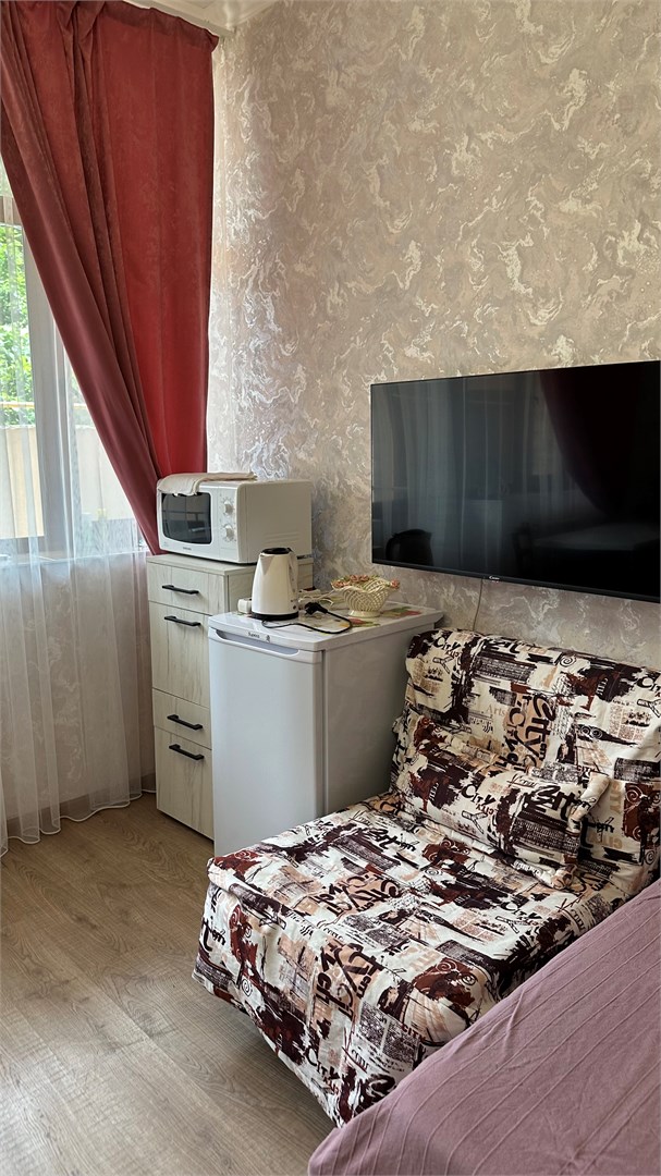 В номере: вешалка, диван раскладной, кровать двуспальная, стол, стулья, тумба, шкаф, кондиционер, микроволновая печь, мини-холодильник, набор посуды, плита электрическая, телевизор, холодильник, чайник