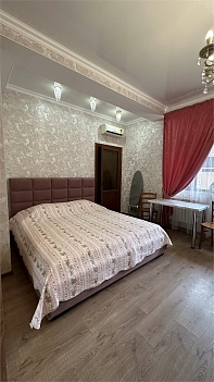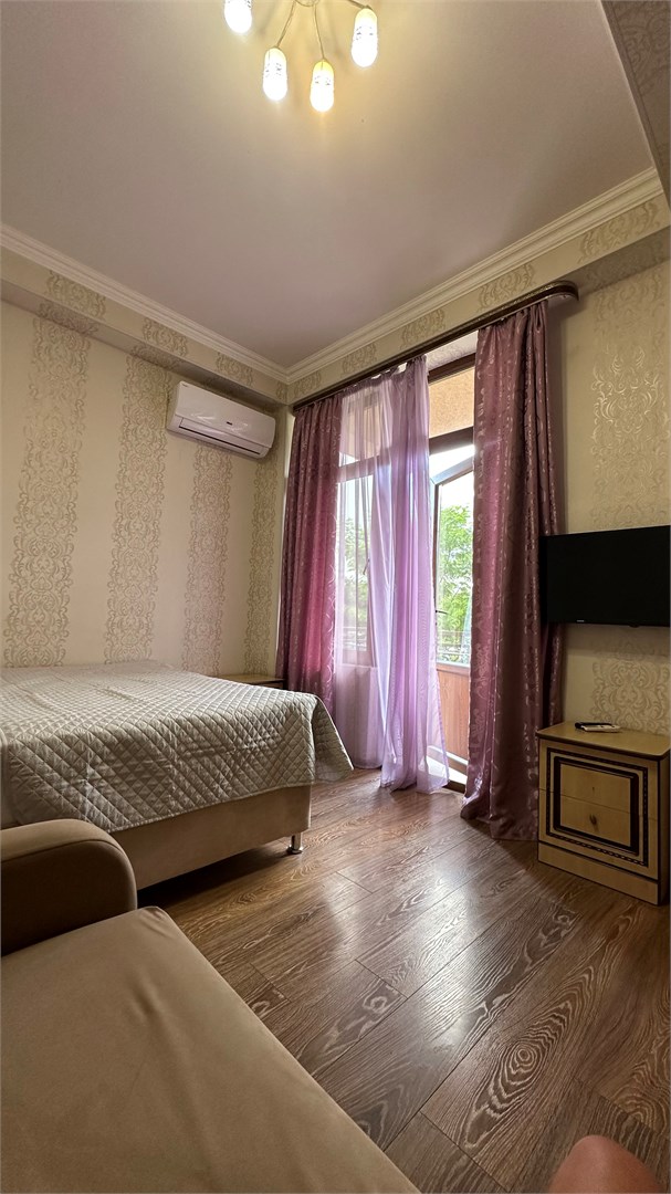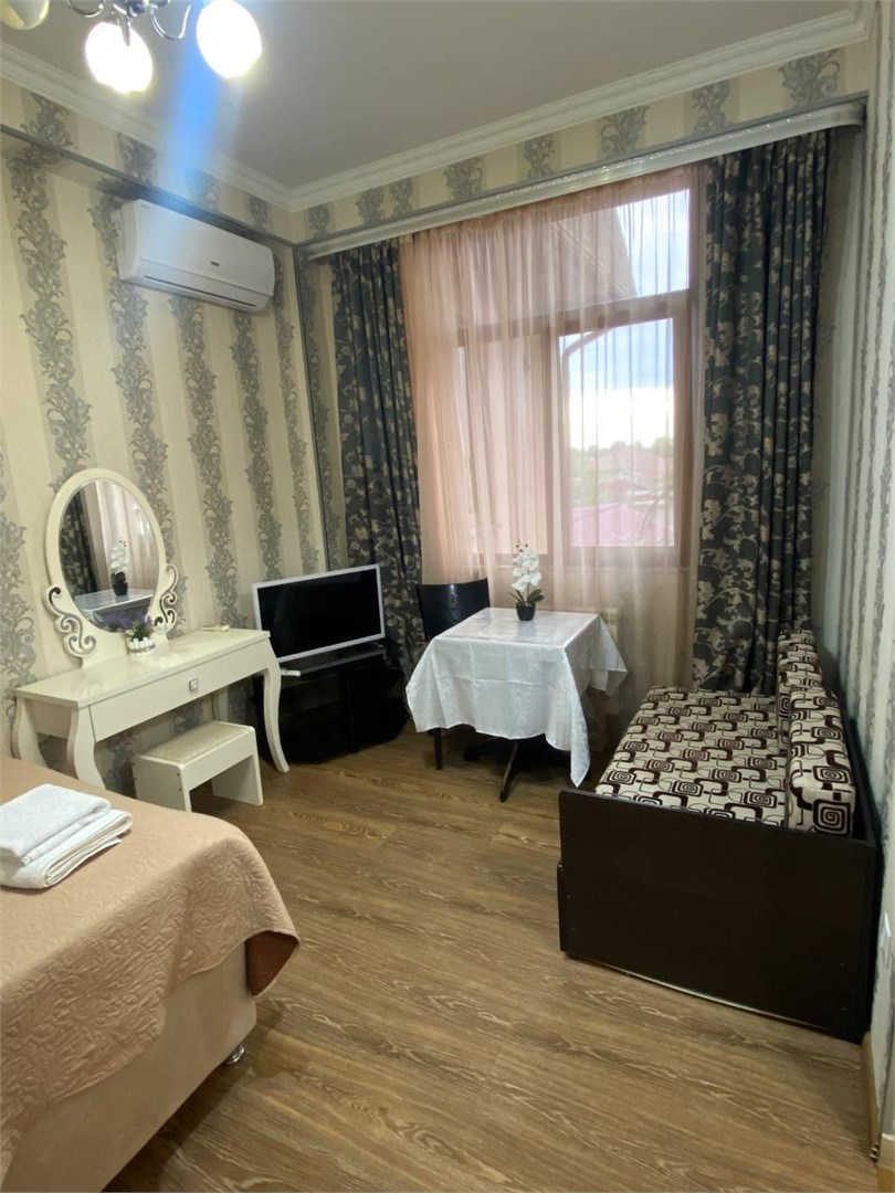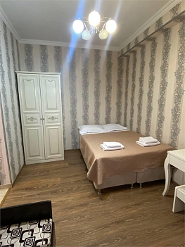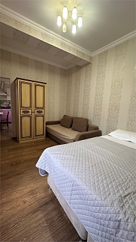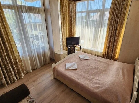 В номере: вешалка, диван раскладной, кровать двуспальная, стол, стулья, тумба, шкаф, кондиционер, микроволновая печь, мини-холодильник, набор посуды, телевизор, чайник