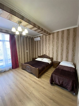 В номере: вешалка, диван раскладной, кровать двуспальная, кровать односпальная, стол обеденный, стулья, шкаф, кондиционер, микроволновая печь, набор посуды, сушилка для белья, телевизор, холодильник