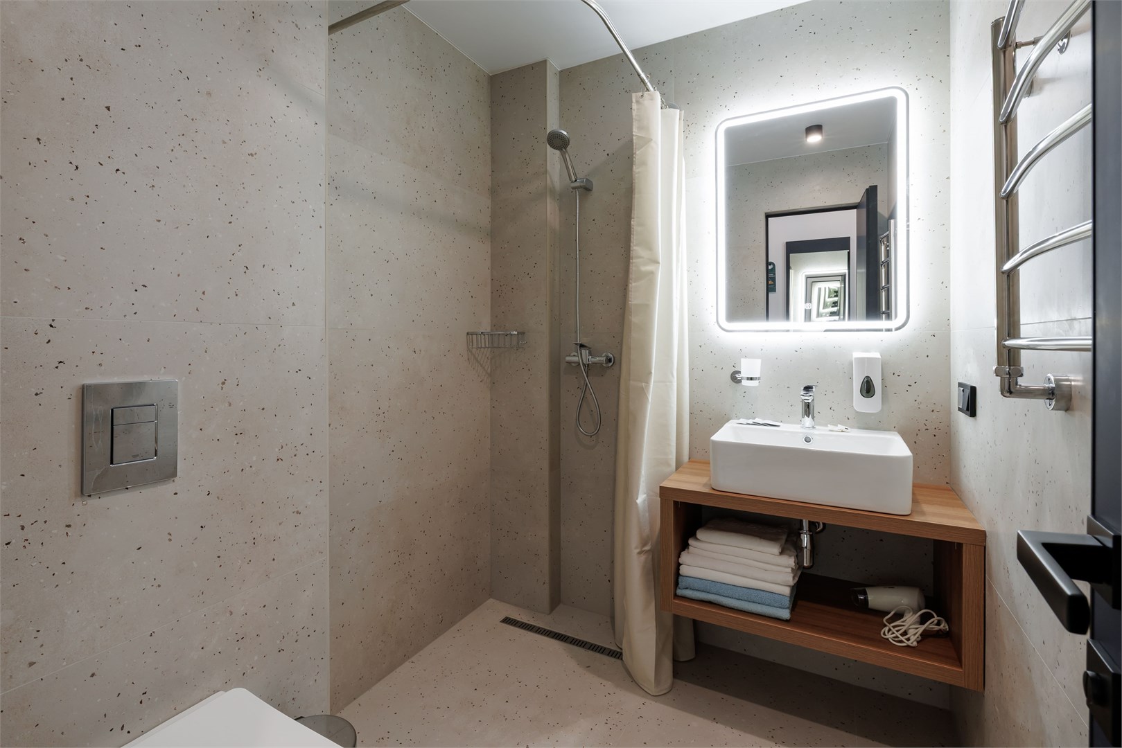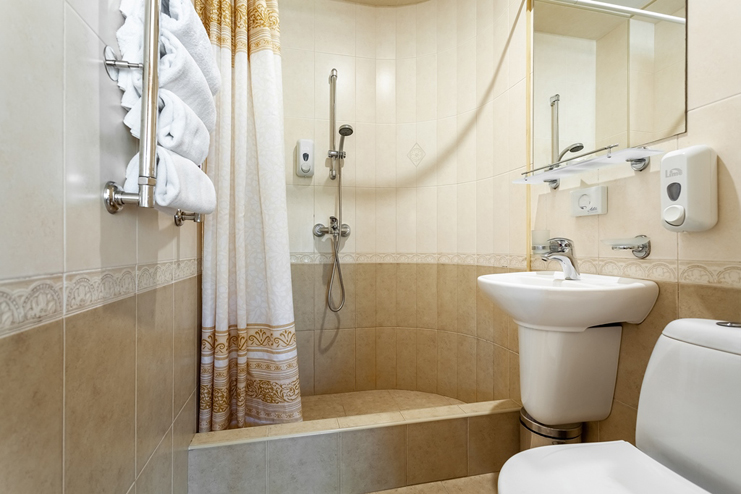 Санузел: с душем, тапочки, туалетные принадлежности, фен