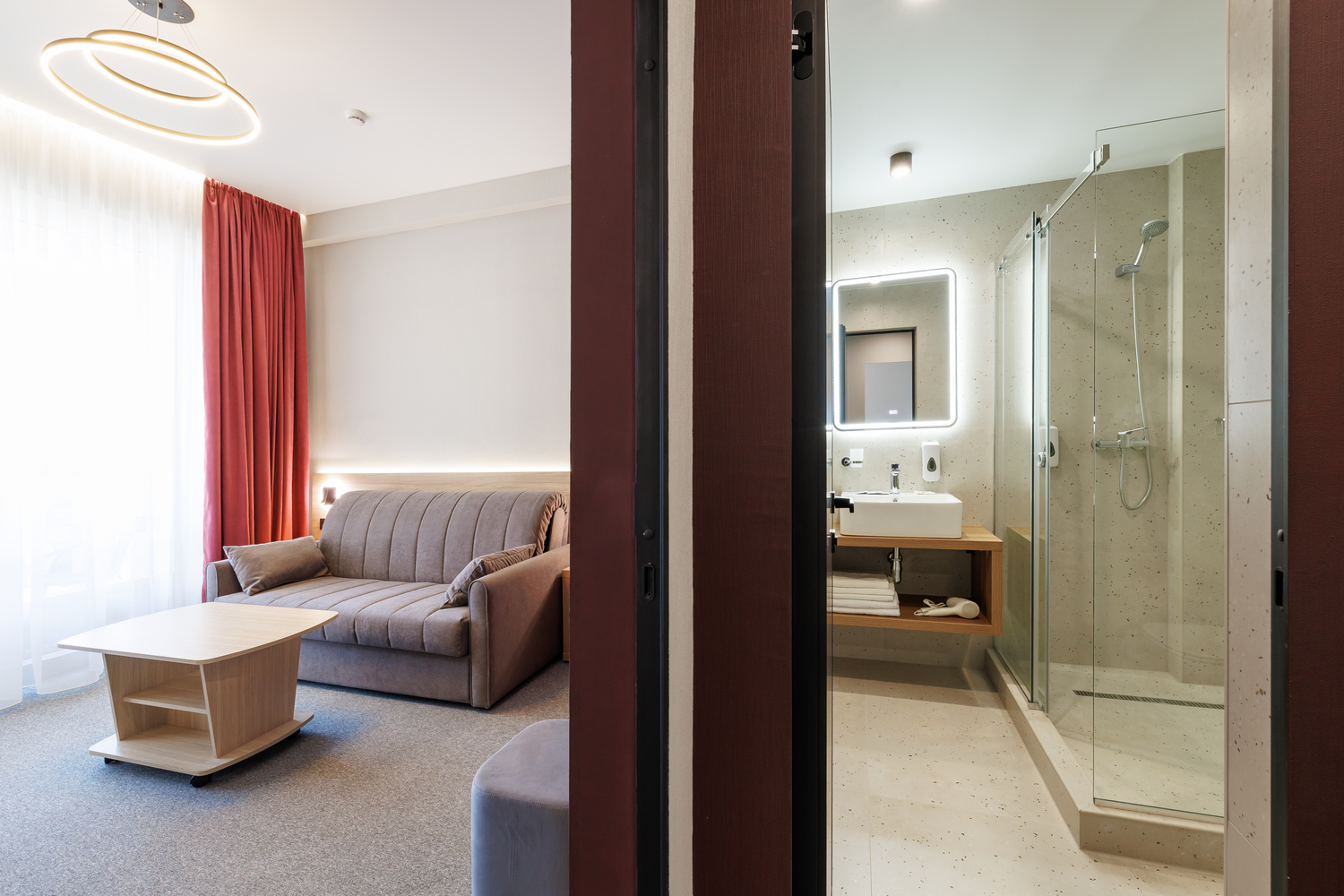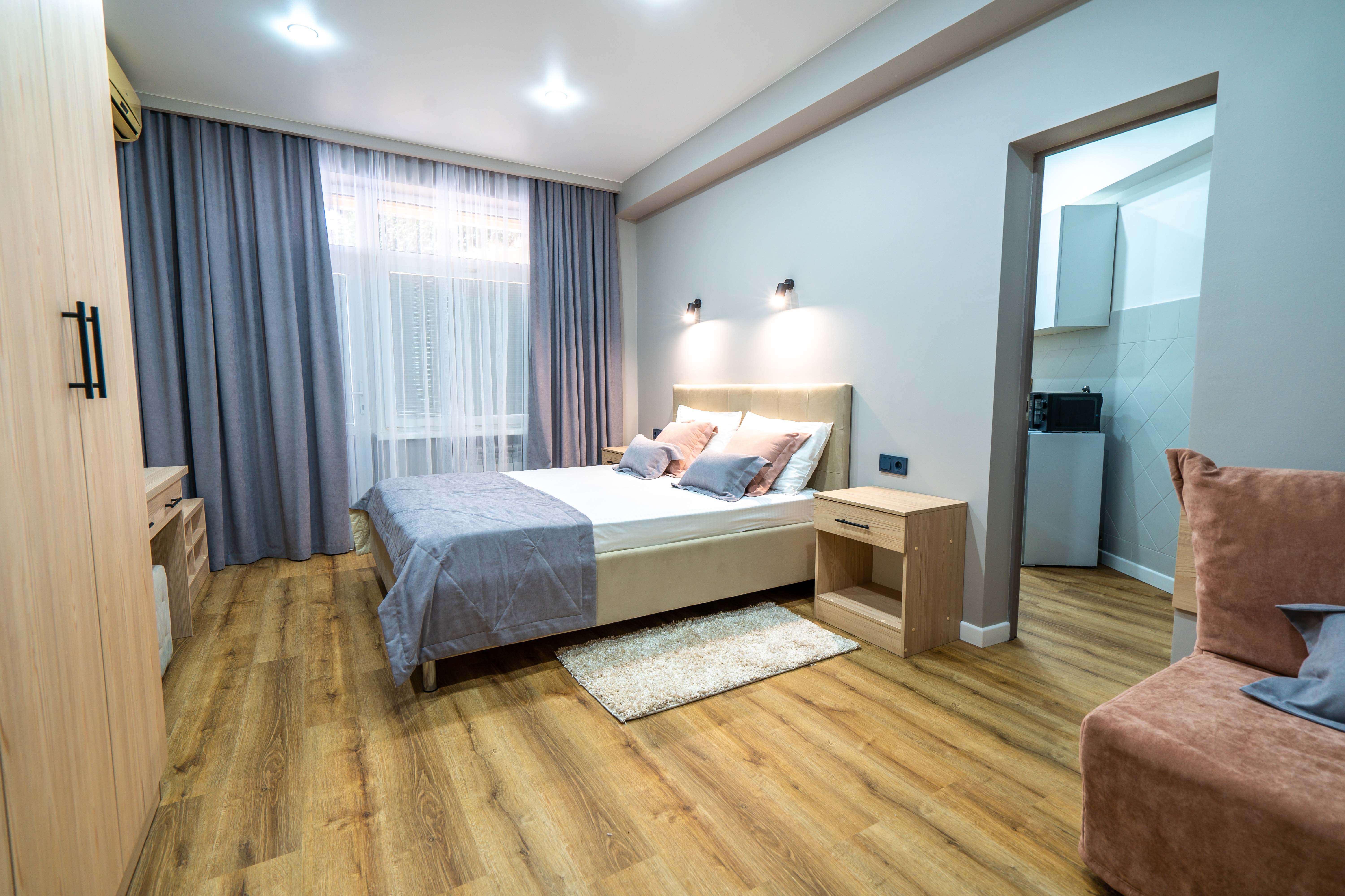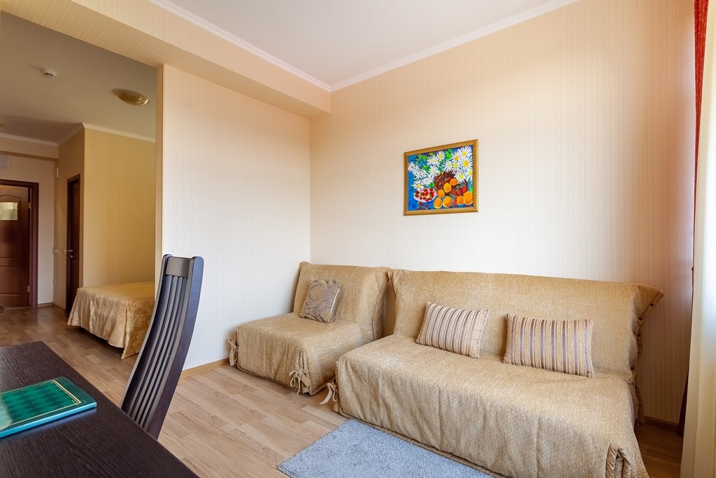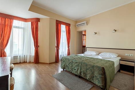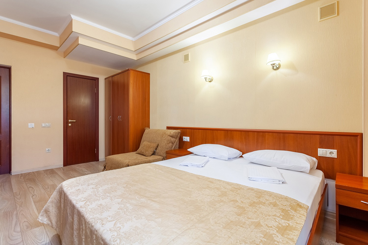 В номере: диван раскладной, кресло, кровать двуспальная, прикроватные тумбочки, столик журнальный, шкаф, набор посуды, сплит-система, телевизор ЖК, холодильник