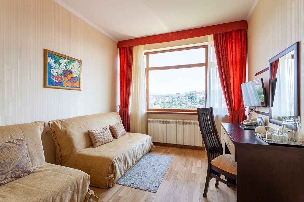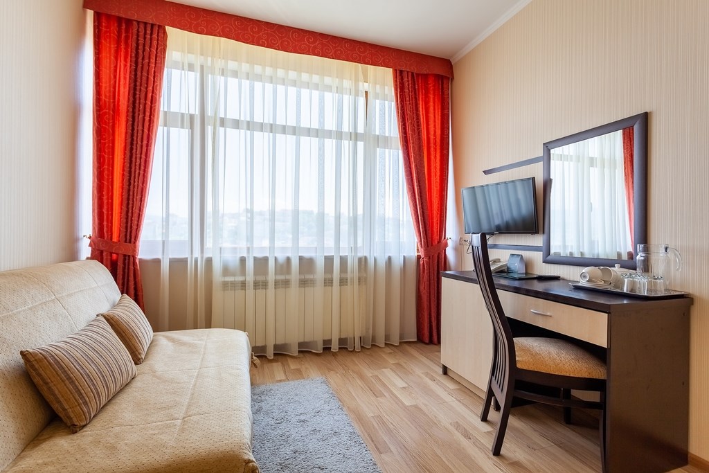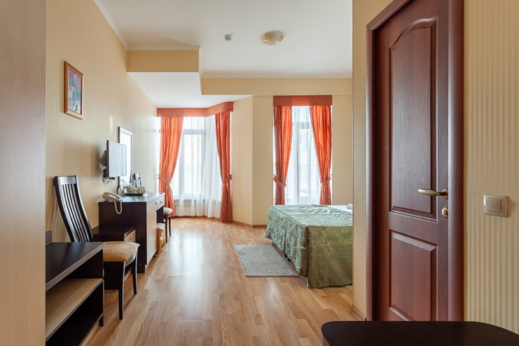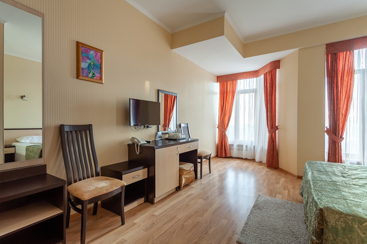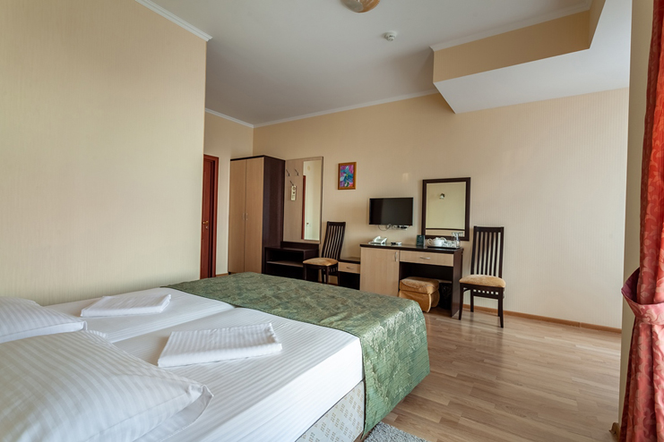 В номере: диван раскладной, зеркало, кресло, кровать двуспальная, прикроватные тумбочки, стол, столик журнальный, стулья, шкаф, гладильная доска, микроволновая печь, набор посуды, сплит-система, телевизор, телефон, утюг, холодильник, электрочайник