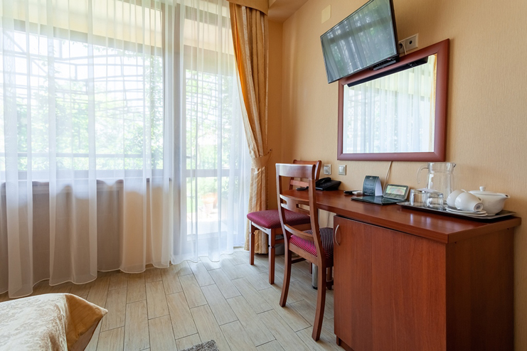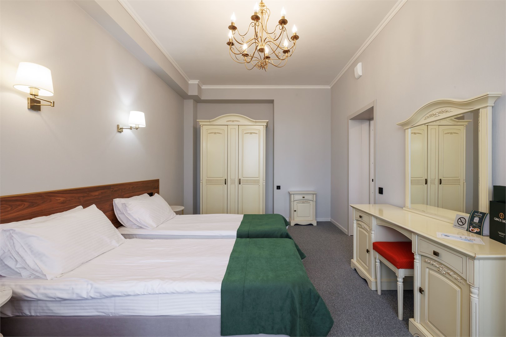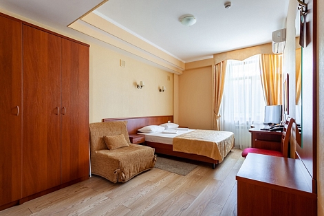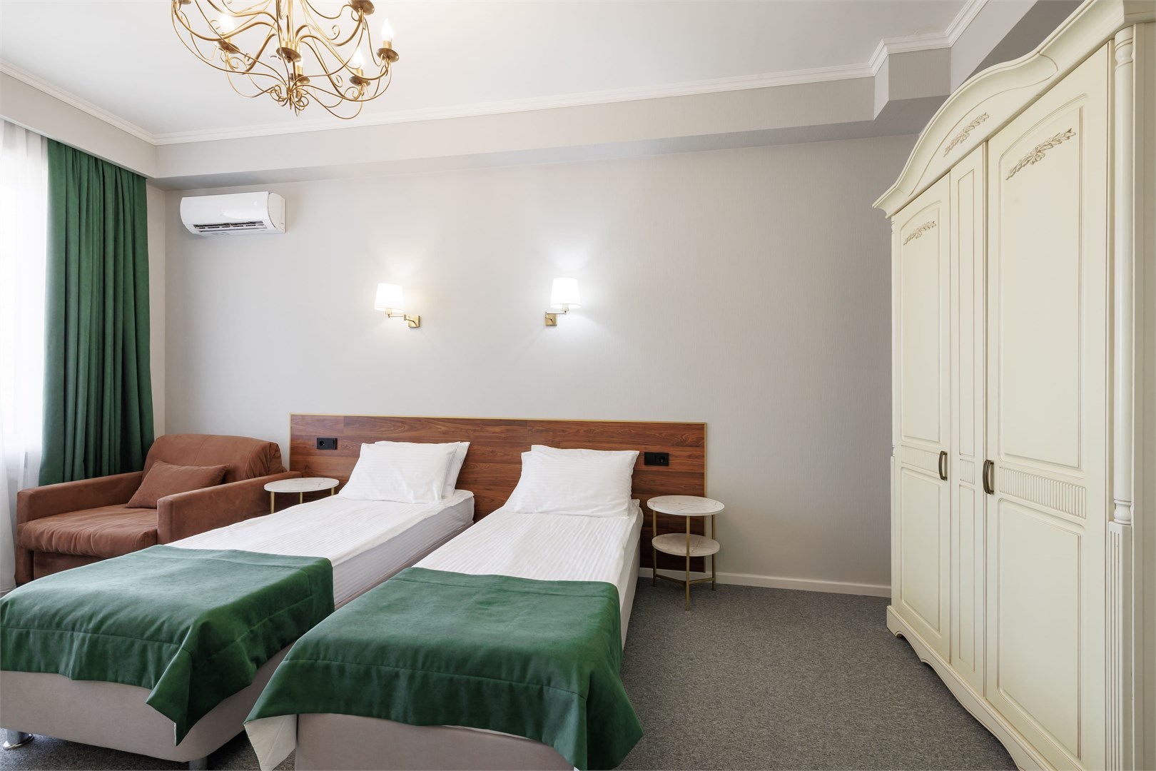 В номере: вешалка, зеркало, кресло-кровать, кровати односпальные /одна двуспальная кровать, прикроватные тумбочки, стол, стулья, шкаф, сплит-система, телевизор, телефон, холодильник