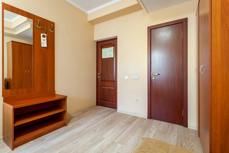 В номере: вешалка, диван раскладной, зеркало, кровать двуспальная/ две полутороспальные кровати, прикроватные тумбочки, шкаф, набор посуды, сплит-система, телевизор, телефон, холодильник