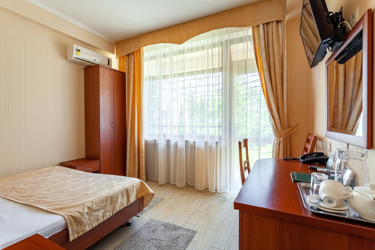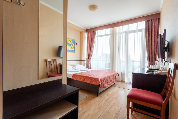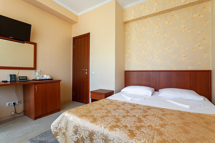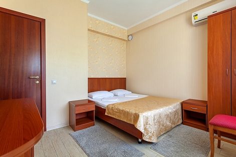 В номере: вешалка, зеркало, кресло-кровать, кровати односпальные /одна двуспальная кровать, прикроватная тумбочка, шкаф, набор посуды, сплит-система, телевизор, телефон, холодильник