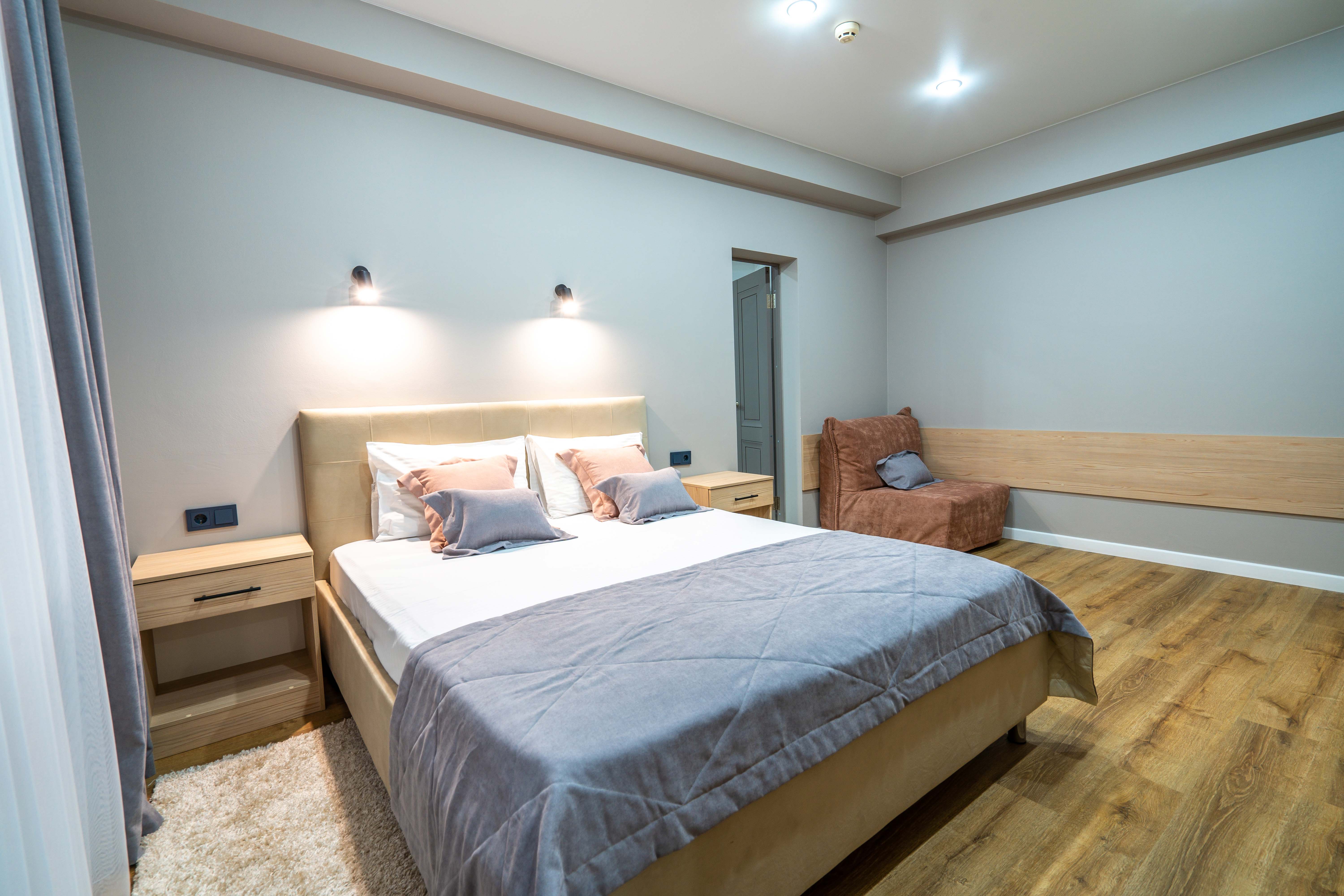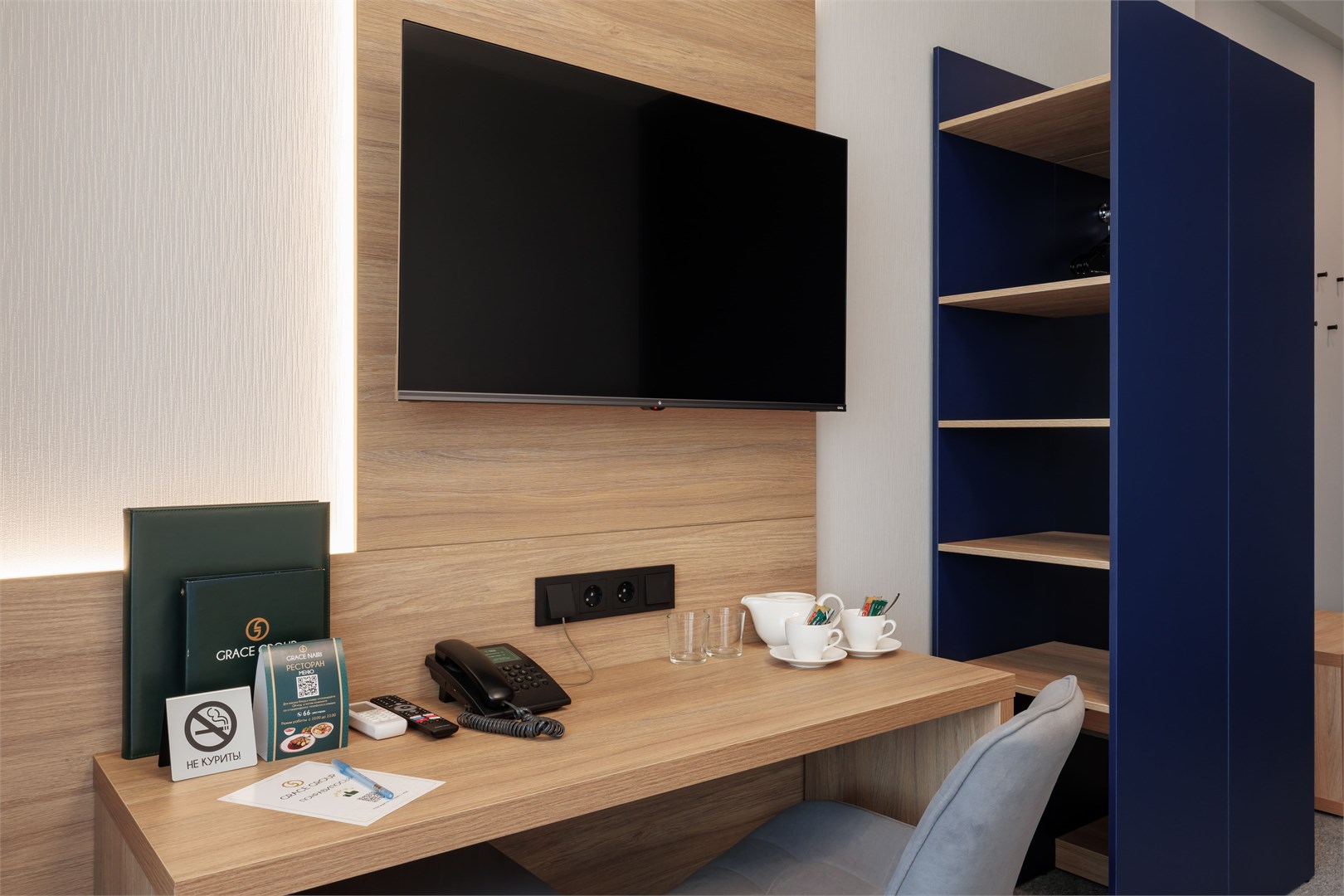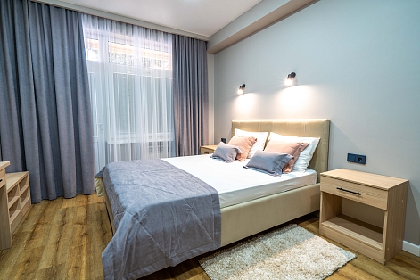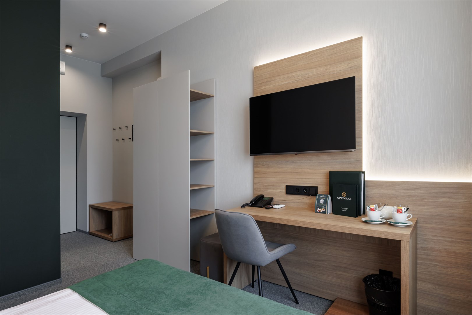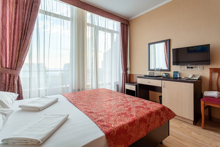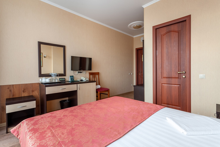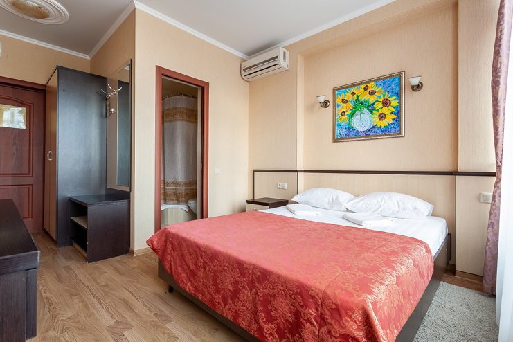 В номере: вешалка, зеркало, кресло-кровать, кровать двуспальная, прикроватные тумбочки, шкаф, набор посуды, сплит-система, телевизор, телефон, холодильник