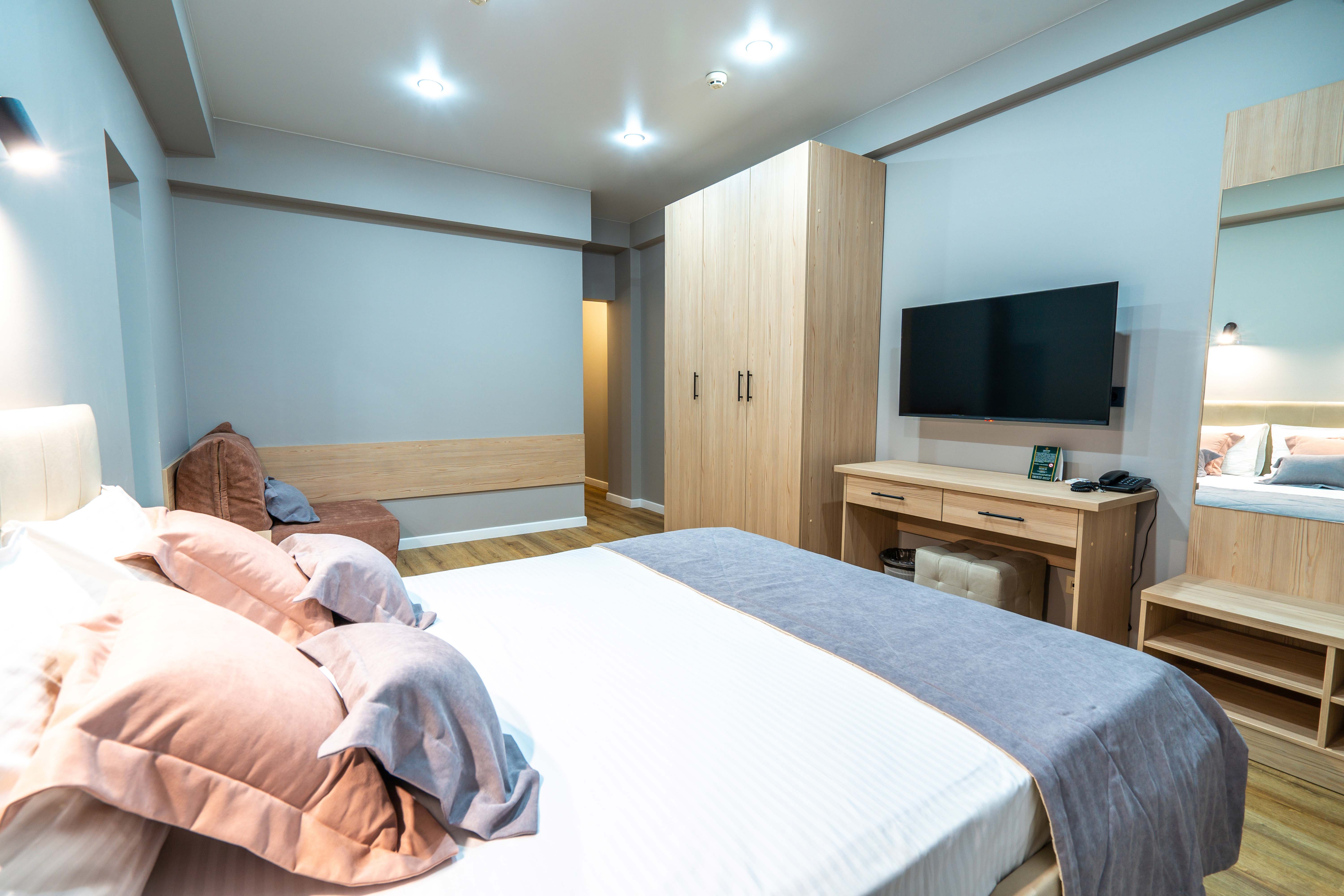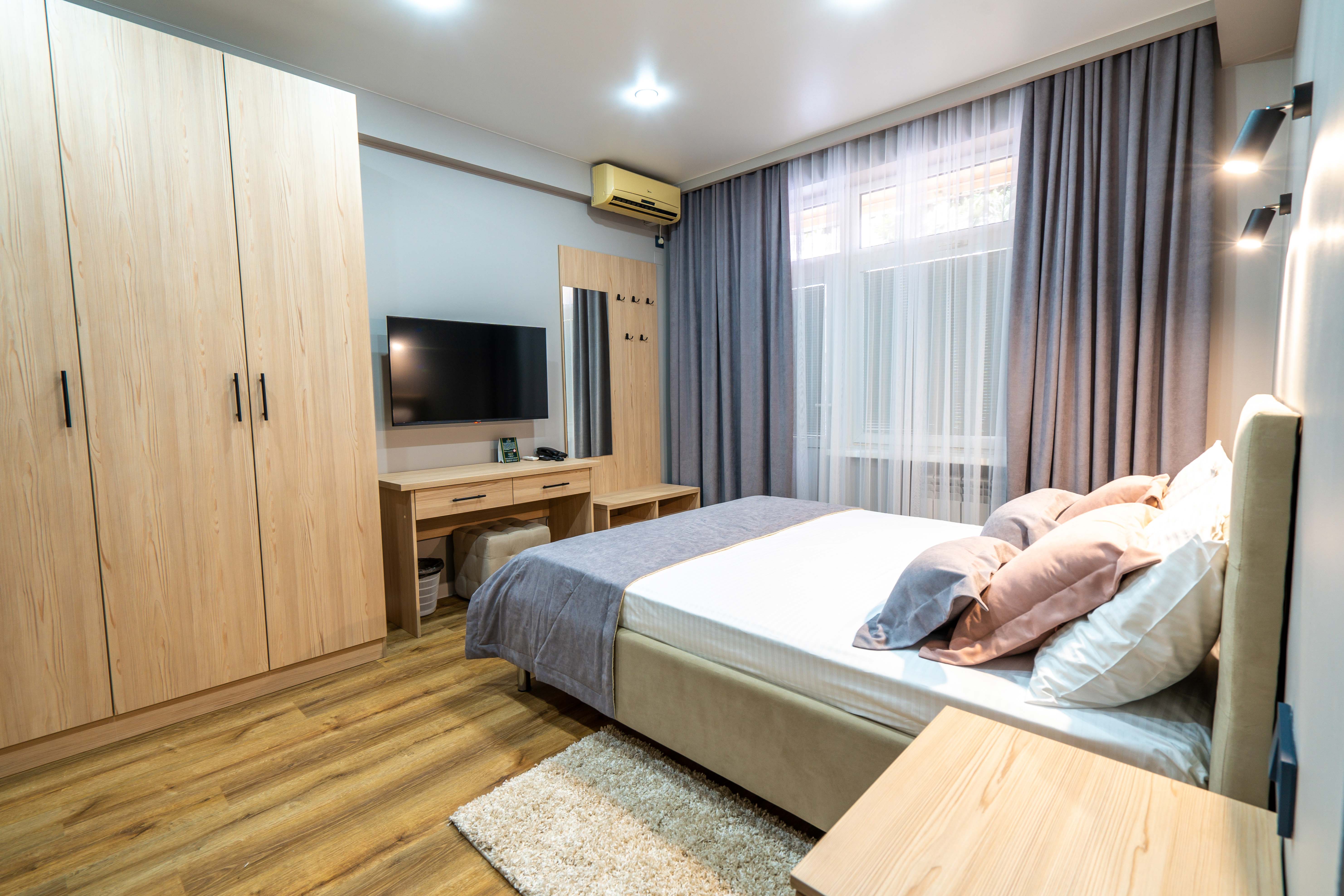 В номере: диван раскладной, зеркало, кровать двуспальная, прикроватные тумбочки, столик журнальный, шкаф, набор посуды, сплит-система, телевизор, холодильник