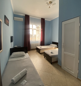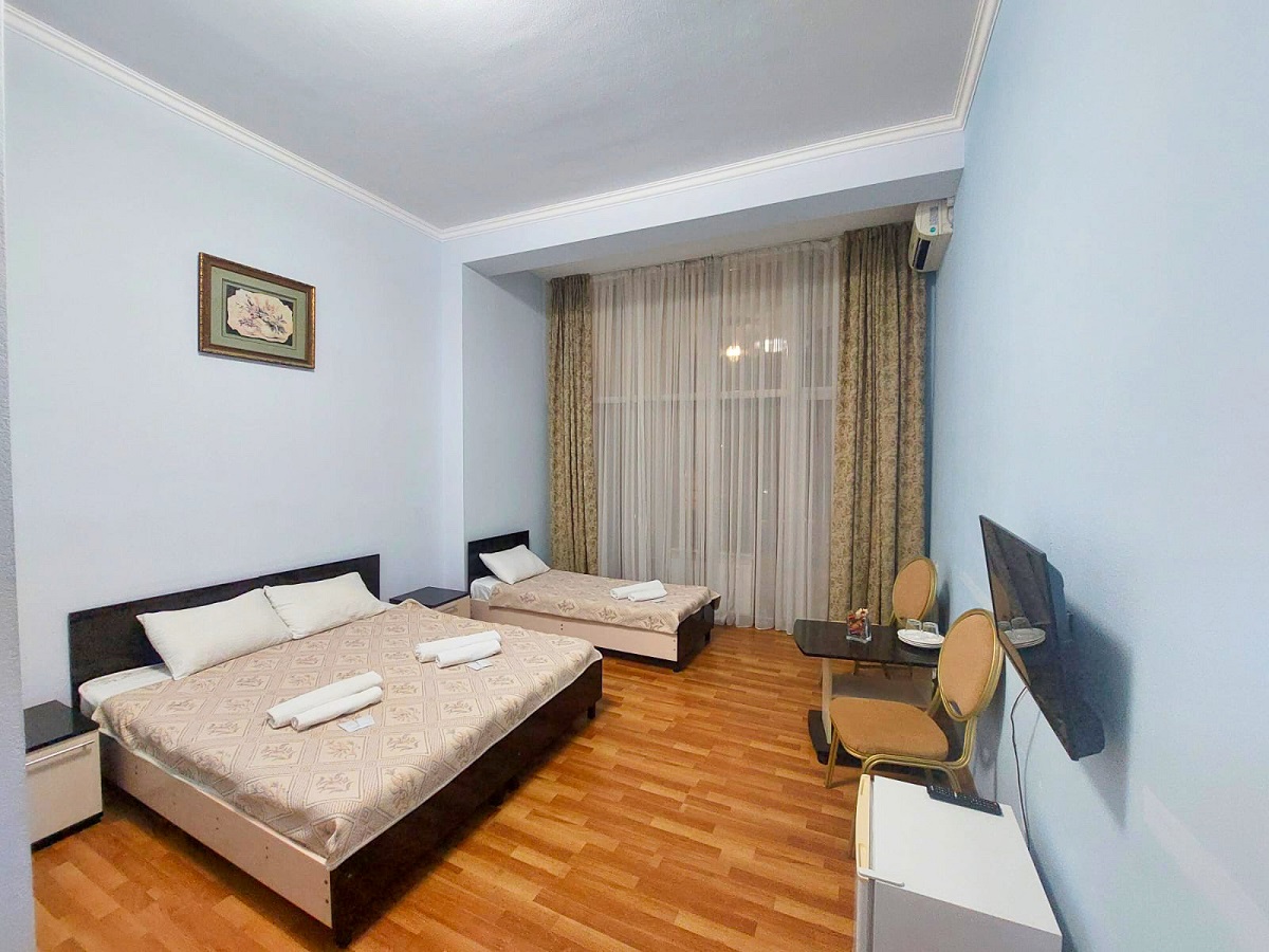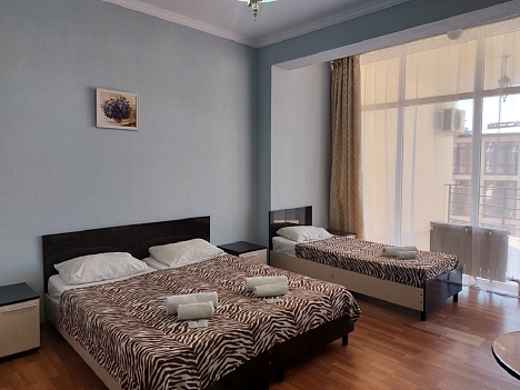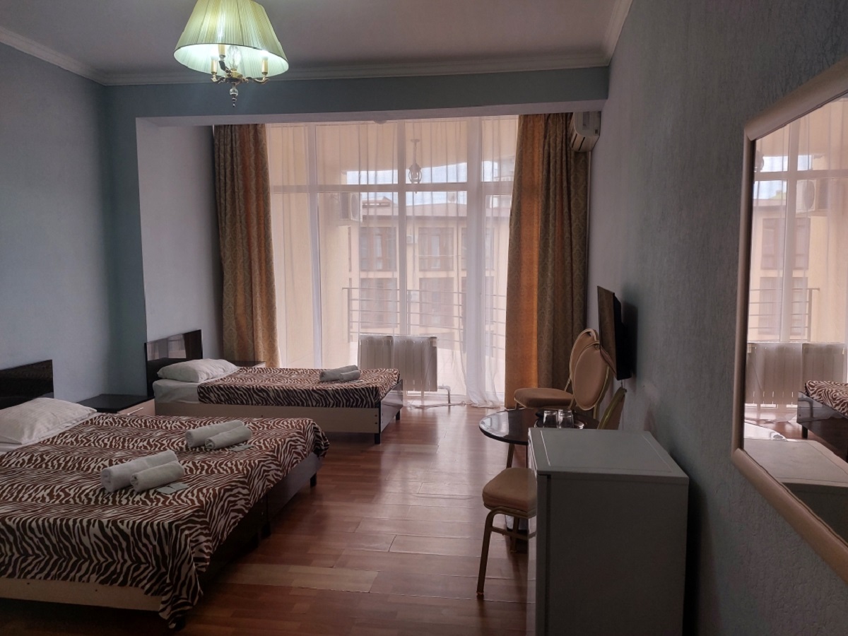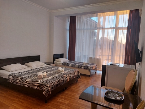 В номере: зеркало, кровати односпальные, кровать двуспальная, прикроватные тумбочки, столик журнальный, стулья, шкаф, кондиционер, набор посуды, телевизор ЖК, холодильник