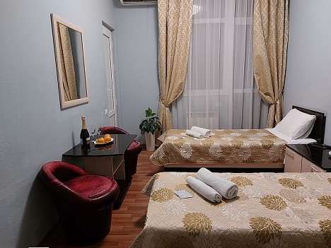В номере: зеркало, кровати односпальные /одна двуспальная кровать, прикроватные тумбочки, столик журнальный, стулья, шкаф, кондиционер, набор посуды, телевизор ЖК, холодильник