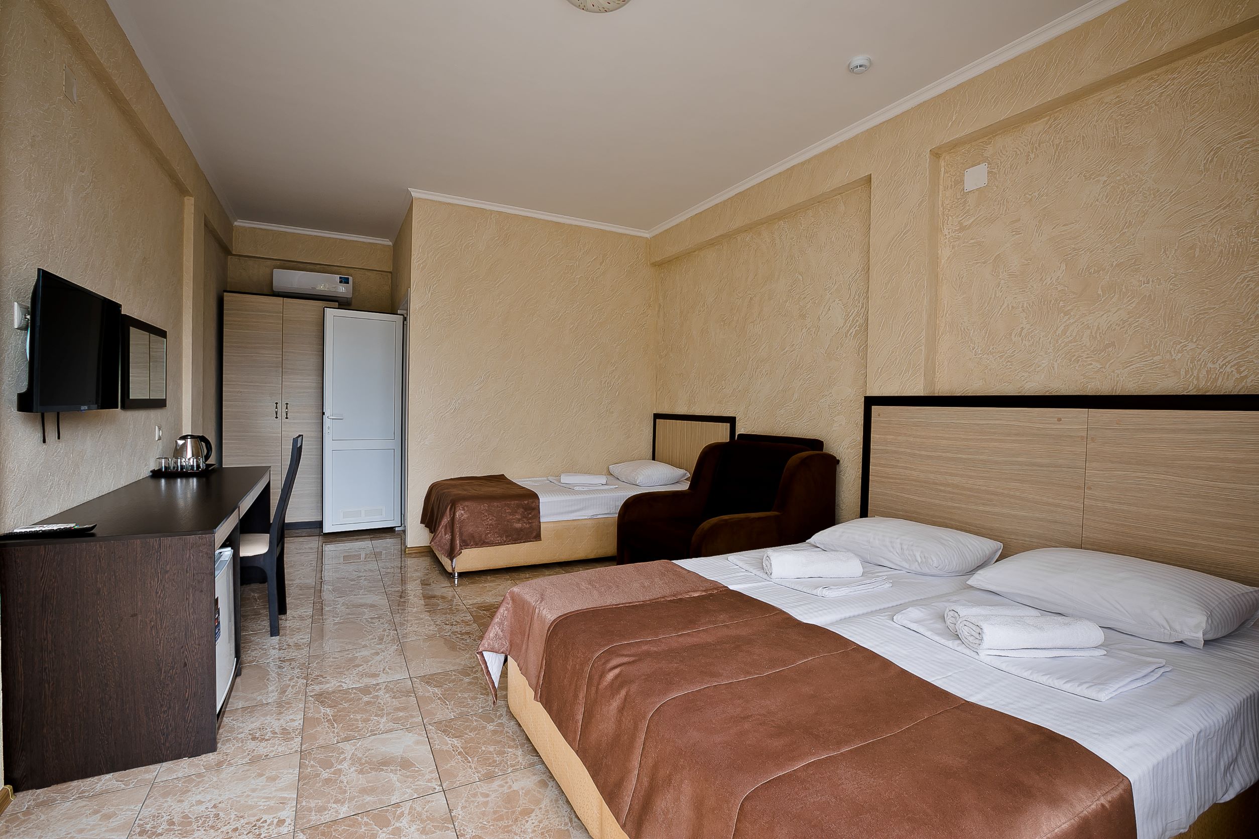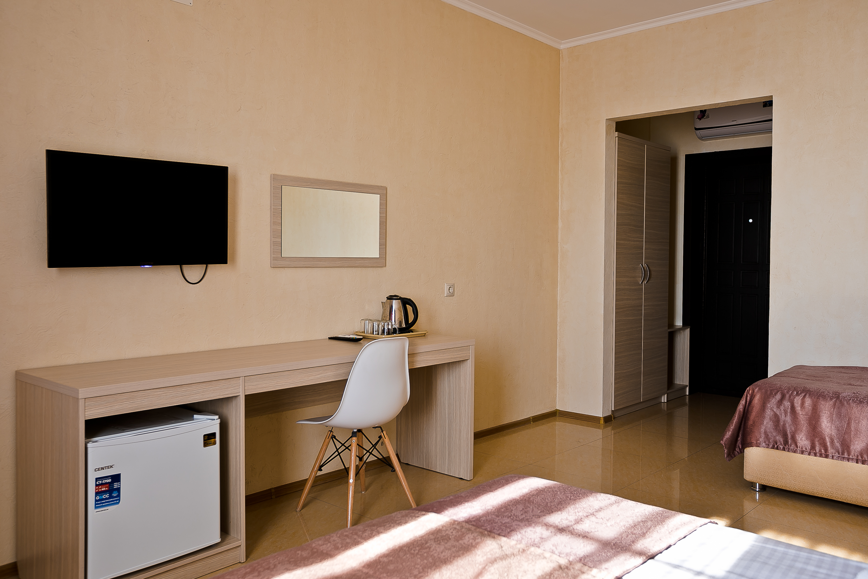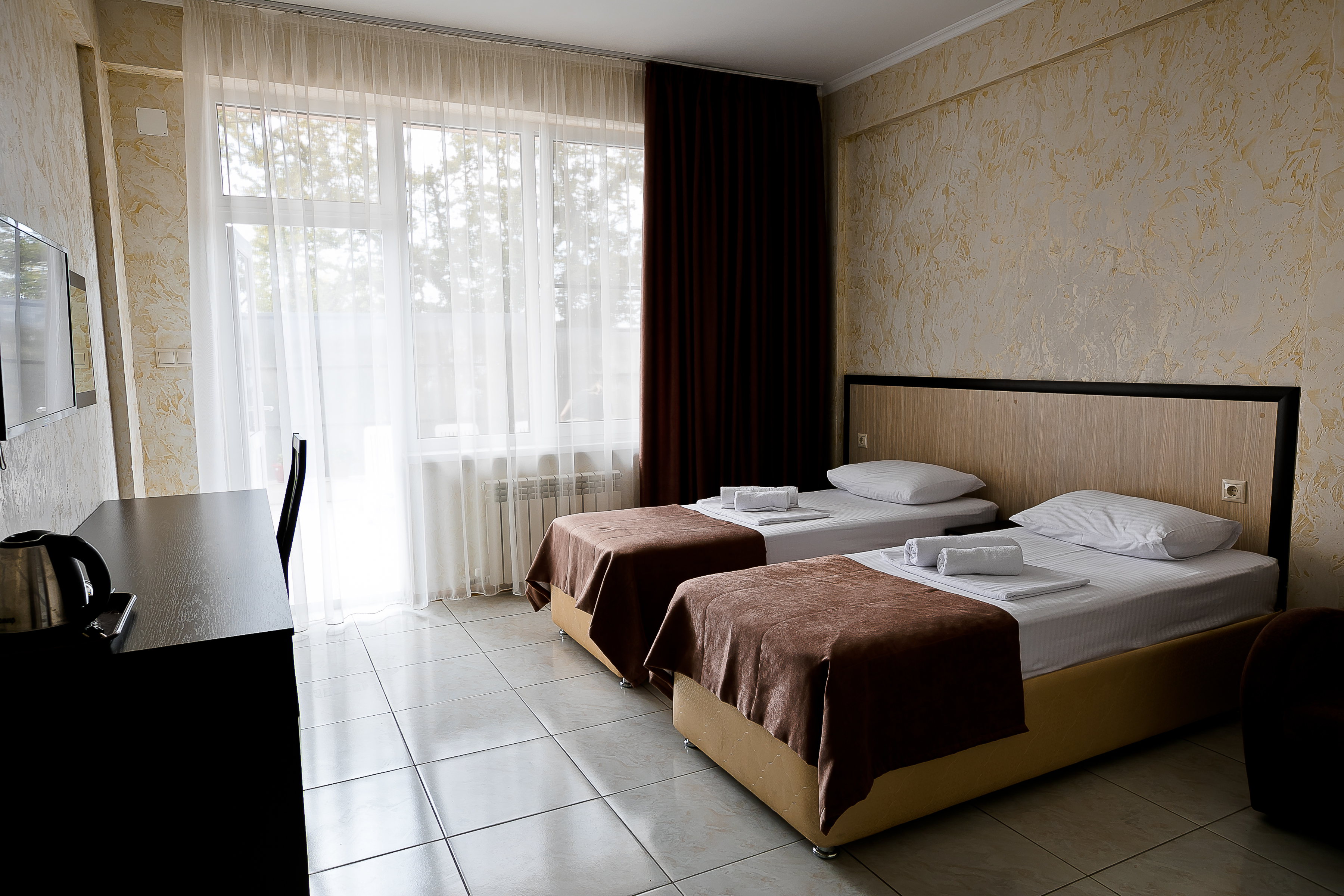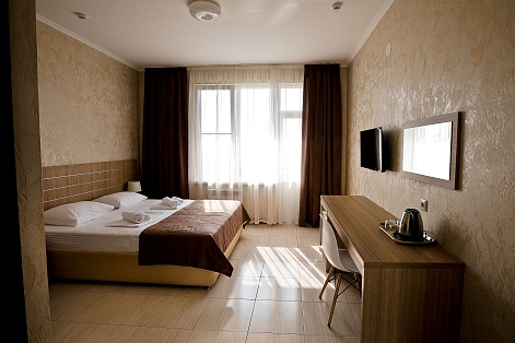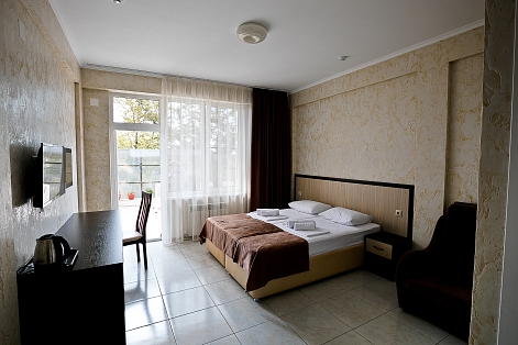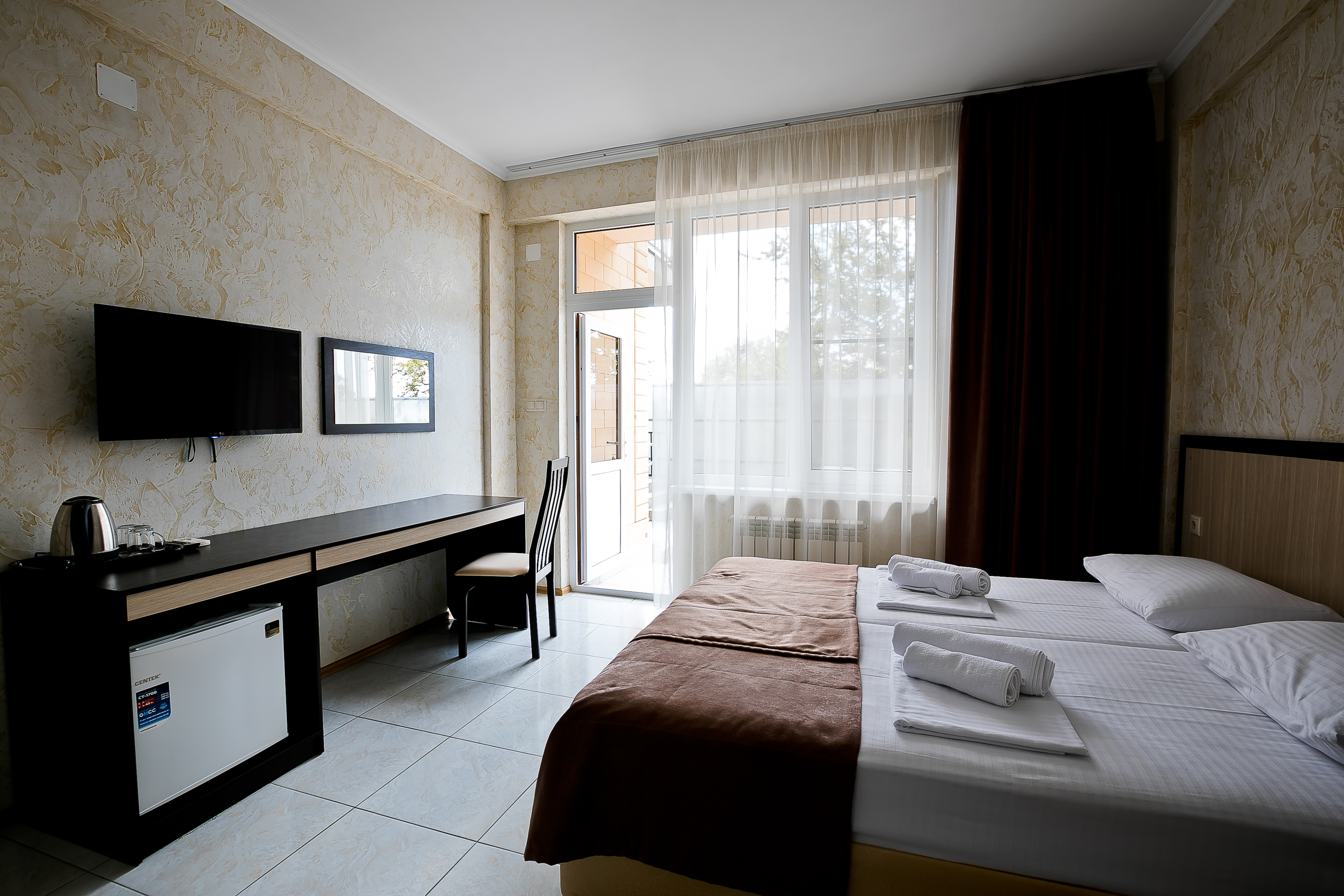 Гостей ожидают двух- и трехместные номера Люкс. Интерьер комнаты выдержаны в приятных пастельных оттенках, каждый номер оснащен отдельным санузлом, кондиционером и бытовой техникой — есть телевизор, фен, электрочайник, холодильник. В отеле работает столовая, где гости могут заказать комплексное питание. К услугам отдыхающих открытый бассейн и небольшая зона отдыха с шезлонгами рядом. Для детей организована игровая площадка.В 400 метрах находится поселковый мелкогалечный пляж. Вдоль побережья установлены раздевалки, есть навесы, доступен прокат зонтиков и шезлонгов.