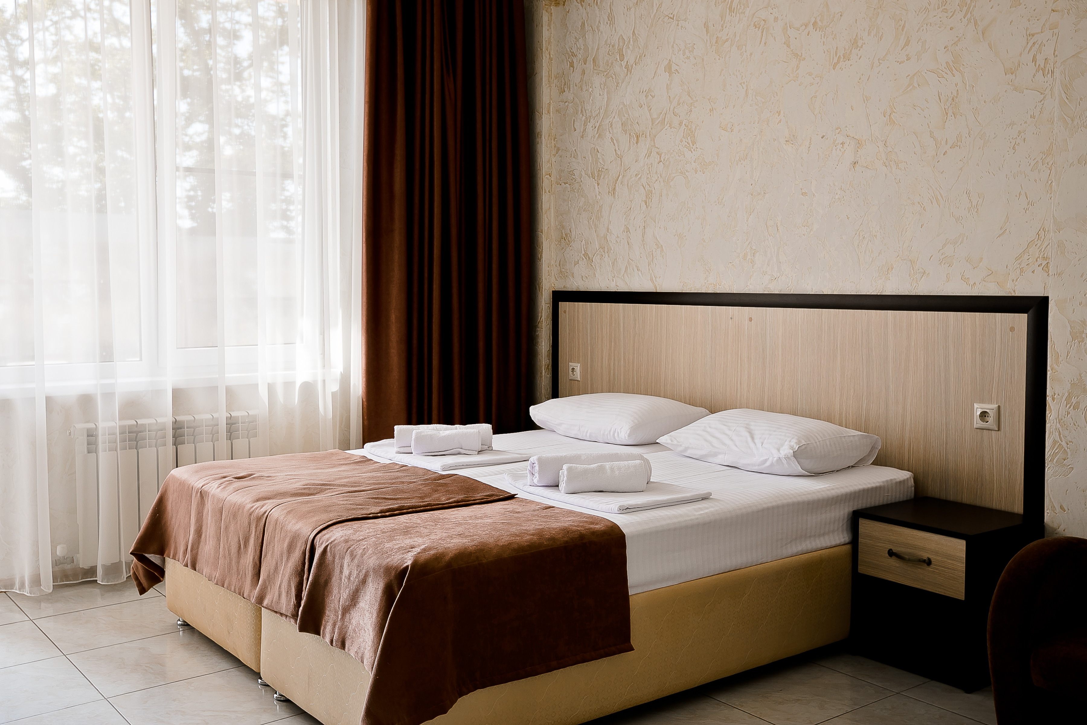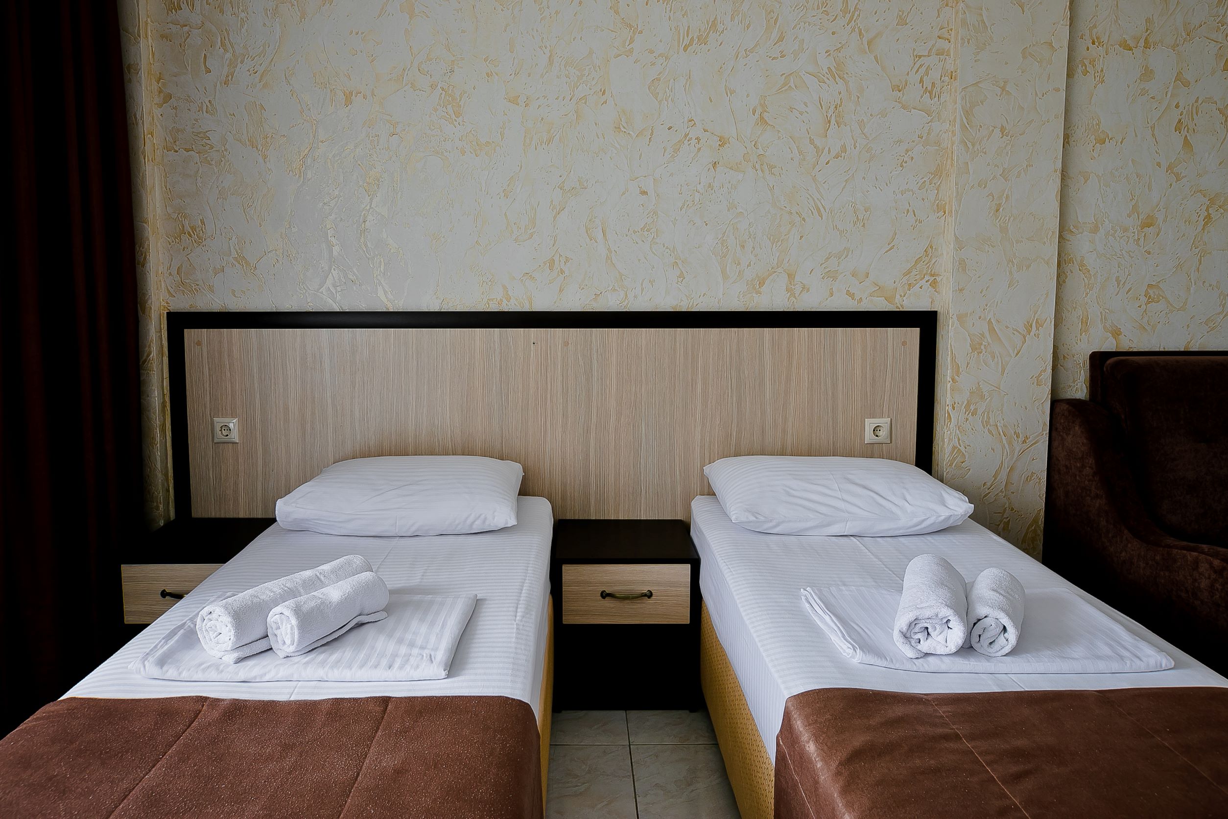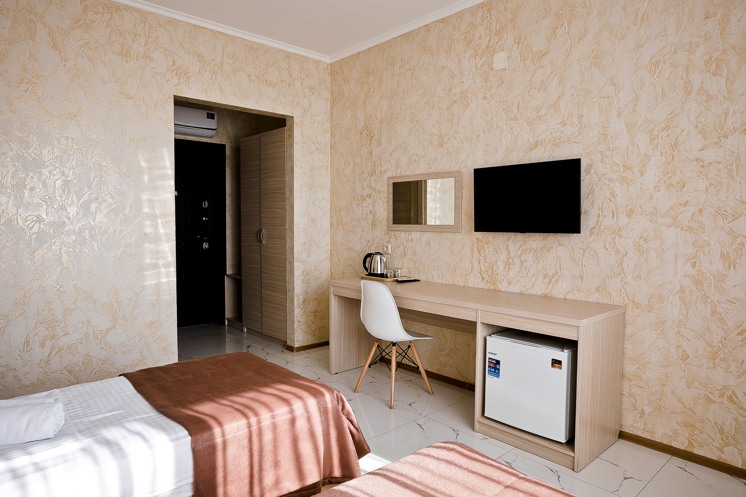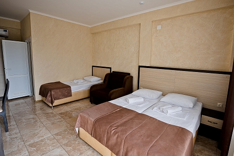 Гостей ожидают двух- и трехместные номера Люкс. Интерьер комнаты выдержаны в приятных пастельных оттенках, каждый номер оснащен отдельным санузлом, кондиционером и бытовой техникой — есть телевизор, фен, электрочайник, холодильник. В отеле работает столовая, где гости могут заказать комплексное питание. К услугам отдыхающих открытый бассейн и небольшая зона отдыха с шезлонгами рядом. Для детей организована игровая площадка.В 400 метрах находится поселковый мелкогалечный пляж. Вдоль побережья установлены раздевалки, есть навесы, доступен прокат зонтиков и шезлонгов.