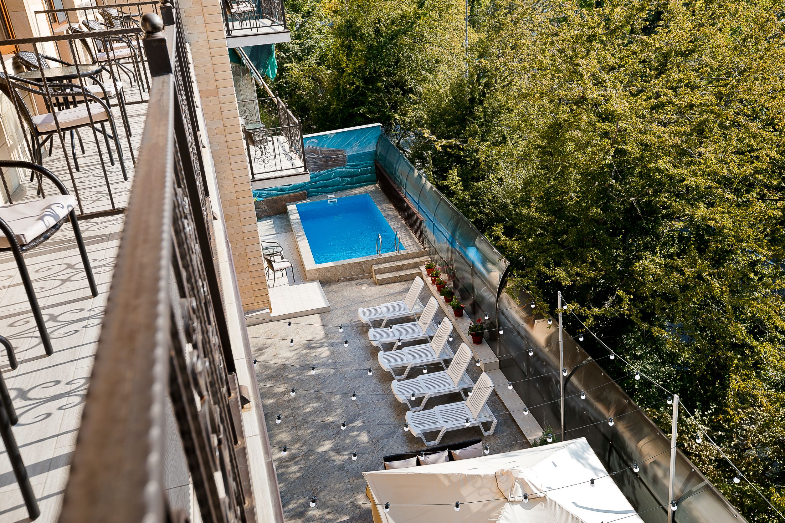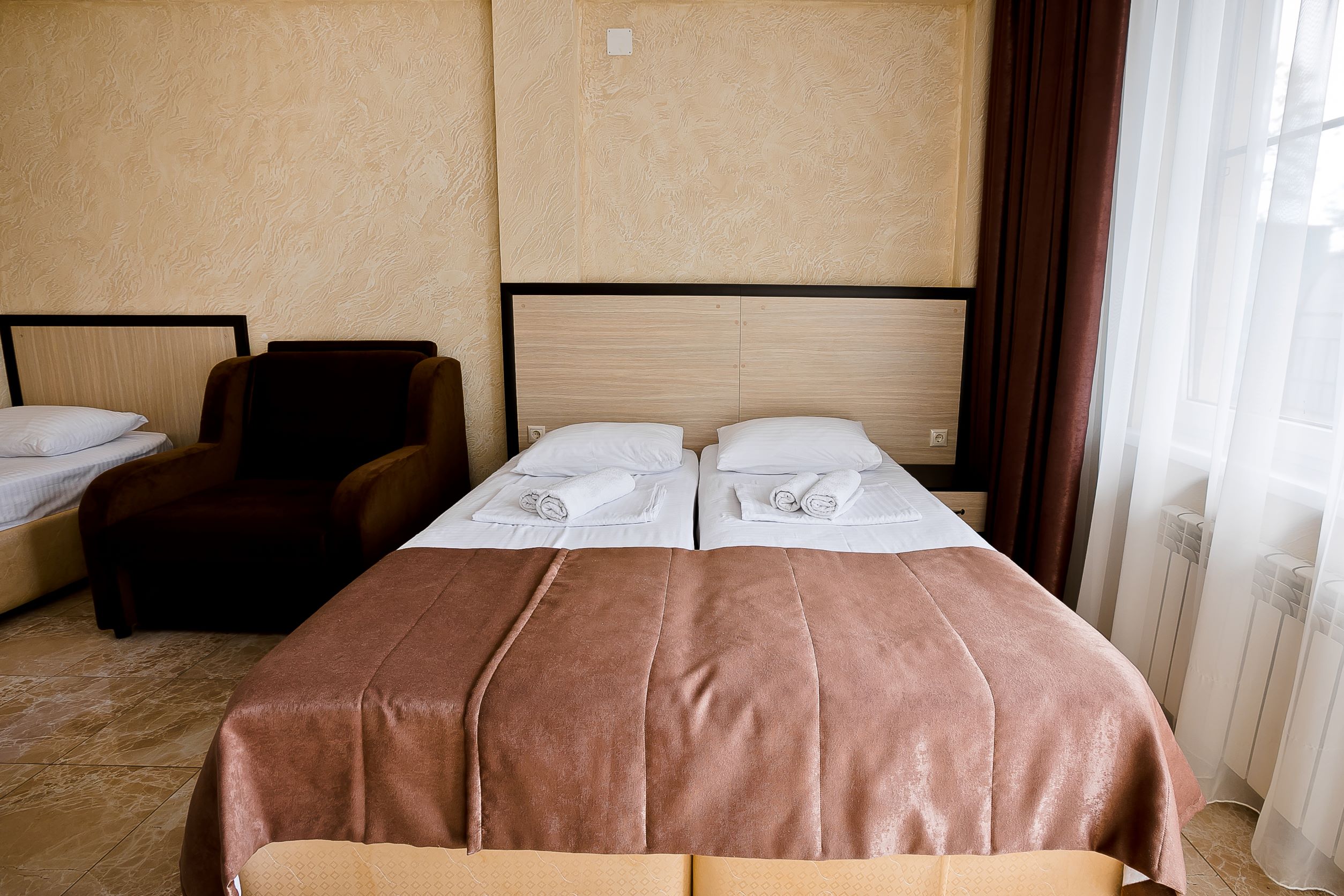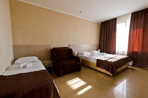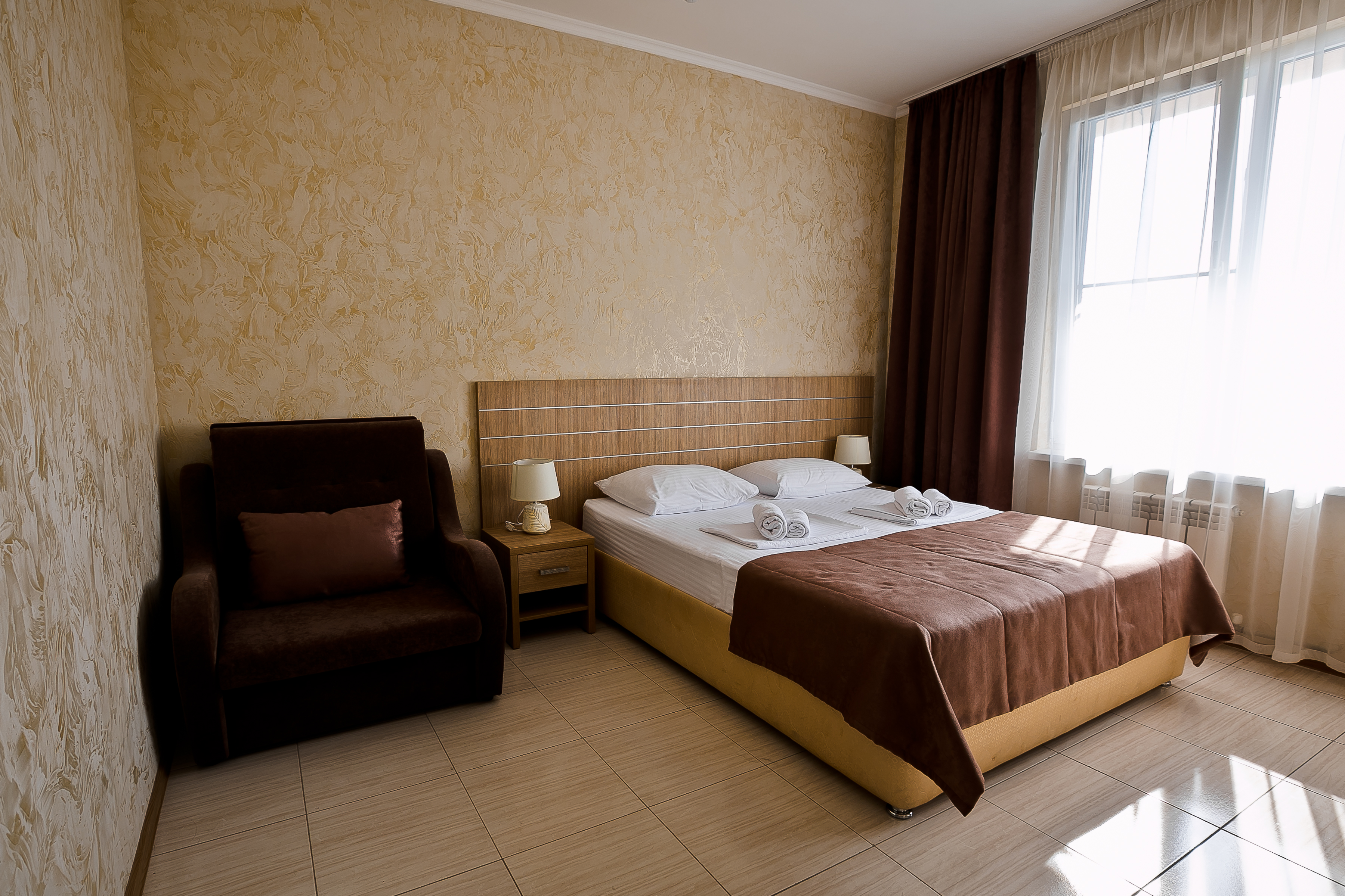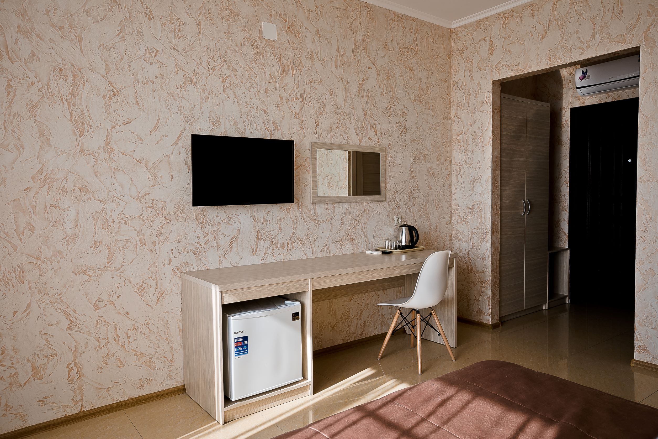 Гостей ожидают двух- и трехместные номера Люкс. Интерьер комнаты выдержаны в приятных пастельных оттенках, каждый номер оснащен отдельным санузлом, кондиционером и бытовой техникой — есть телевизор, фен, электрочайник, холодильник. В отеле работает столовая, где гости могут заказать комплексное питание. К услугам отдыхающих открытый бассейн и небольшая зона отдыха с шезлонгами рядом. Для детей организована игровая площадка.В 400 метрах находится поселковый мелкогалечный пляж. Вдоль побережья установлены раздевалки, есть навесы, доступен прокат зонтиков и шезлонгов.