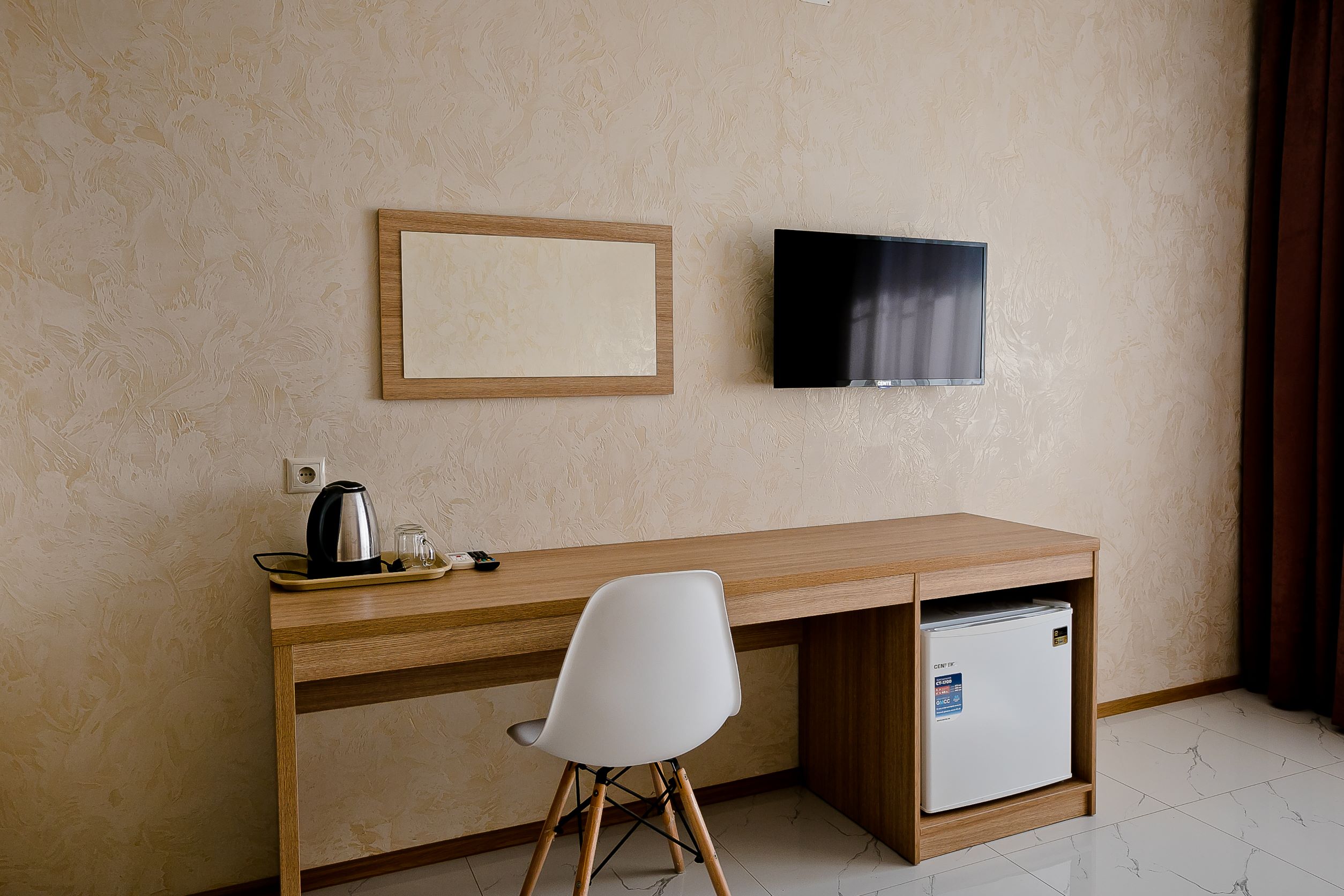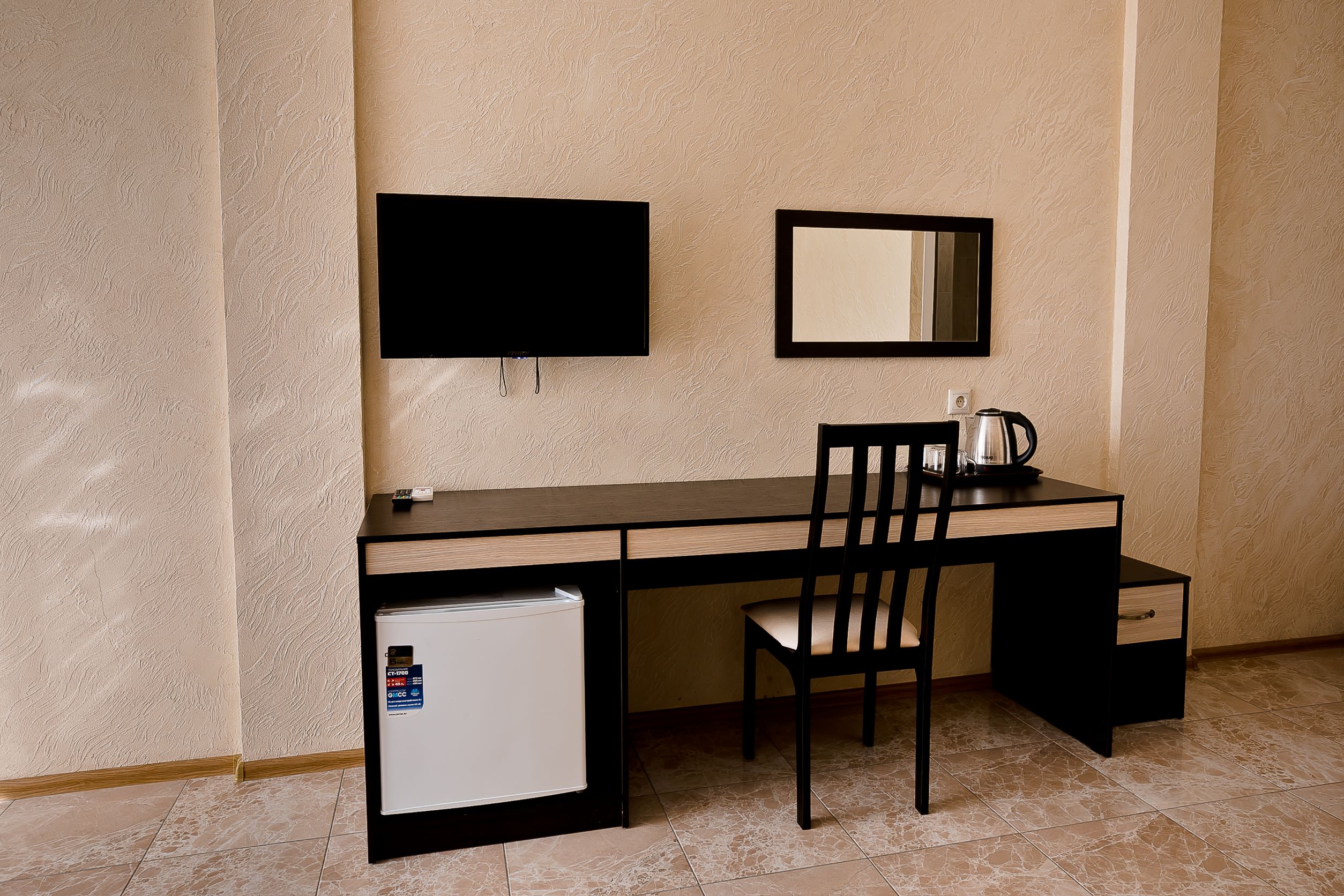 В номере: вешалка, кровать двуспальная, прикроватные тумбочки, стол, стул, шкаф, кондиционер, телевизор ЖК, холодильник, чайный набор посуды, электрочайник