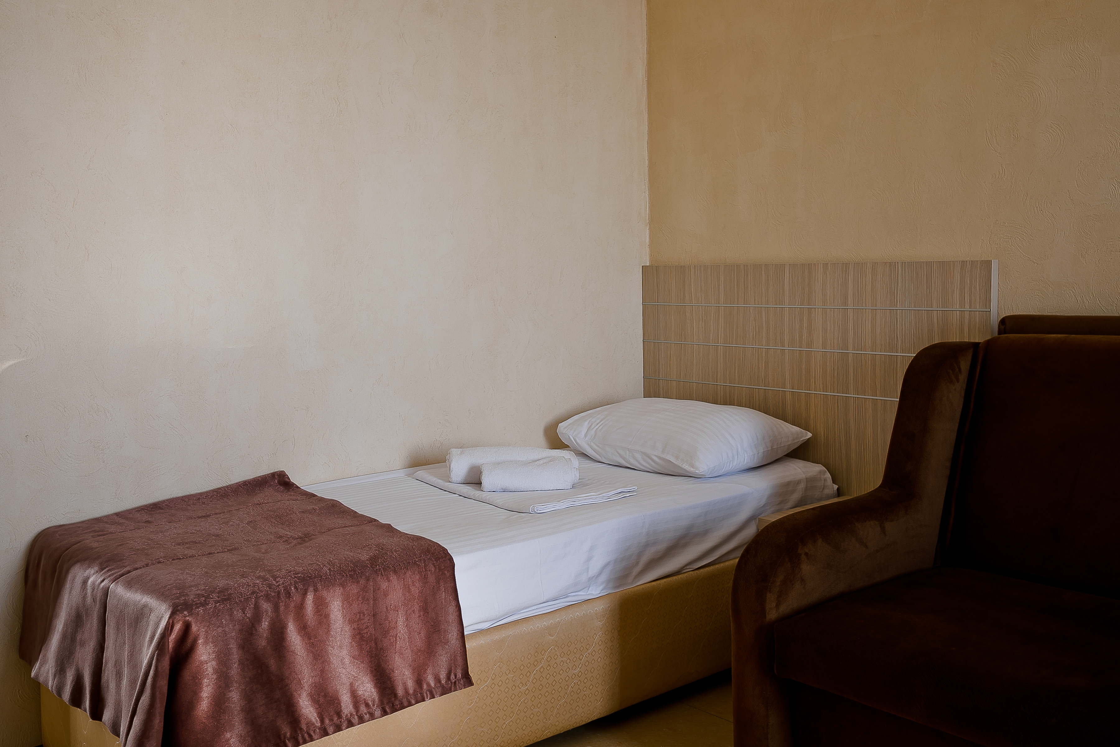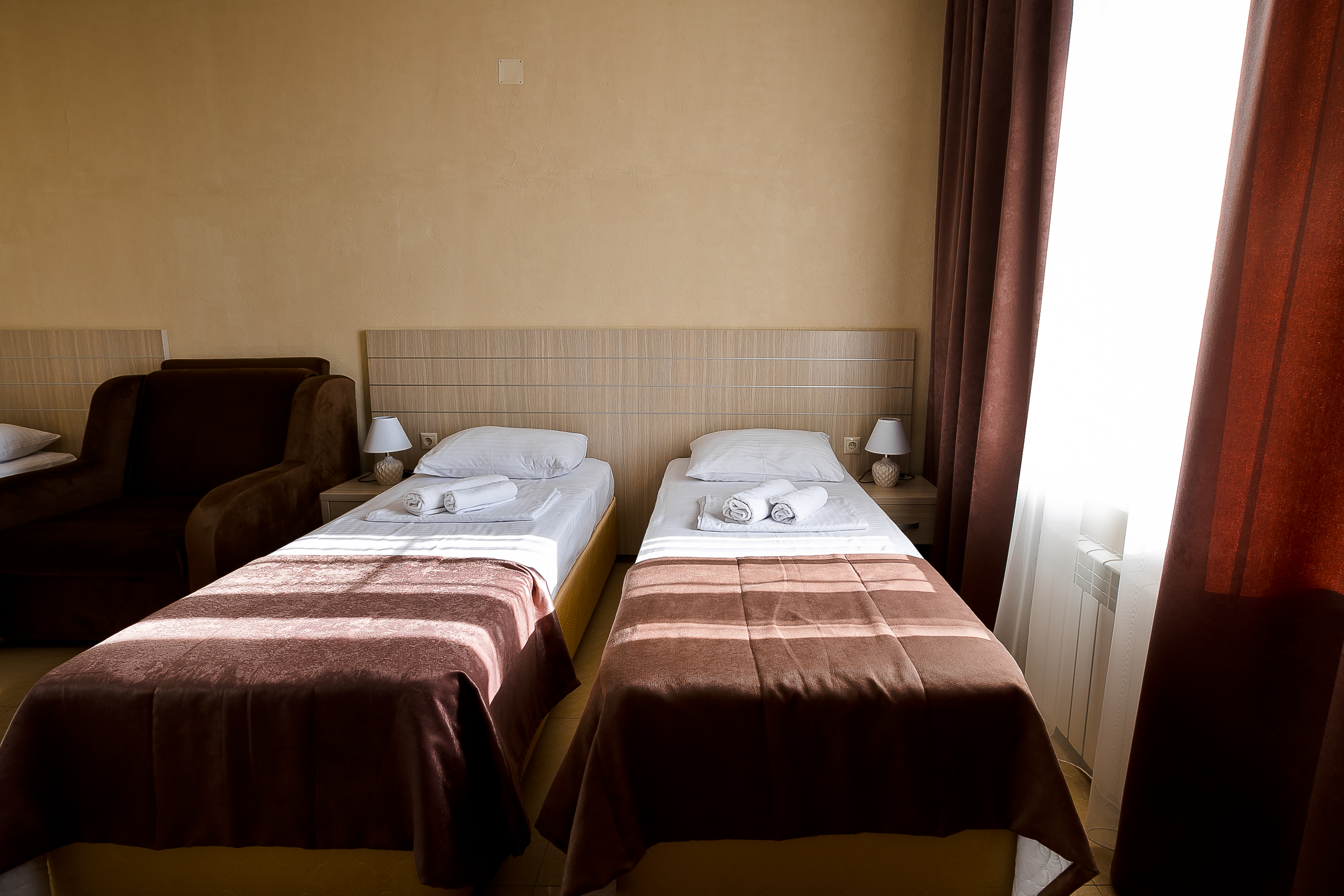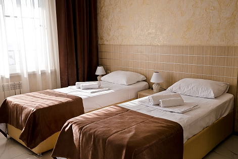 В номере: вешалка, кровати односпальные, прикроватные тумбочки, стол, стул, шкаф, кондиционер, телевизор ЖК, холодильник, чайный набор посуды, электрочайник