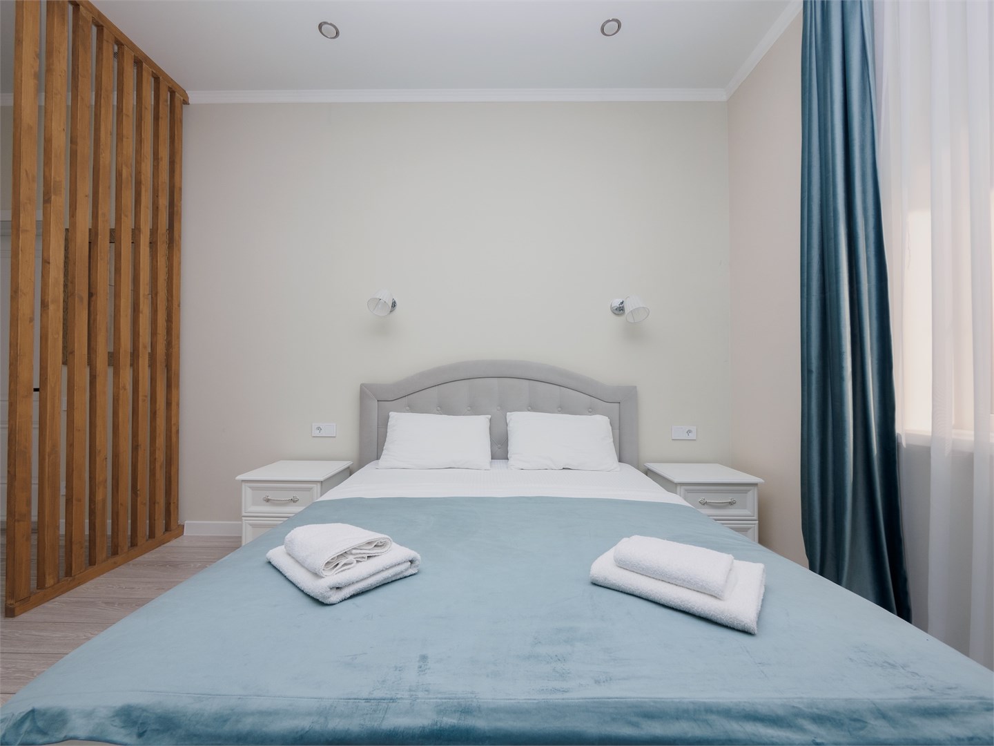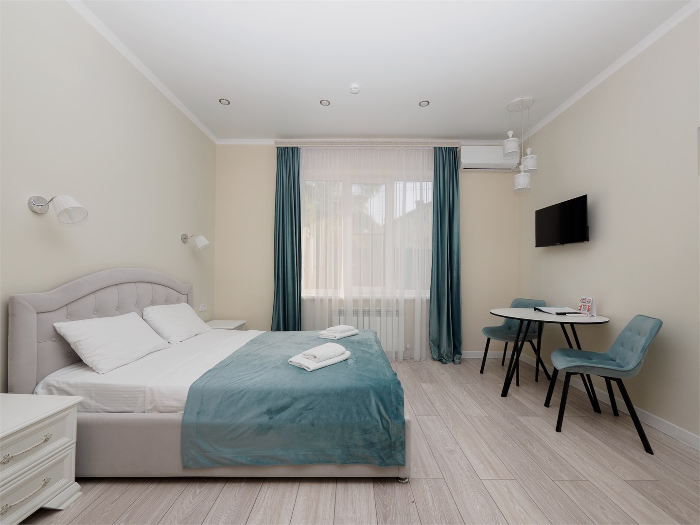 В номере: зеркало, кровать двуспальная, кухонная мебель, прикроватные тумбочки, стол, стулья, шкаф, гладильная доска, кондиционер, микроволновая печь, набор посуды, плита электрическая, сейф, стиральная машина, телевизор ЖК, холодильник, электрочайник