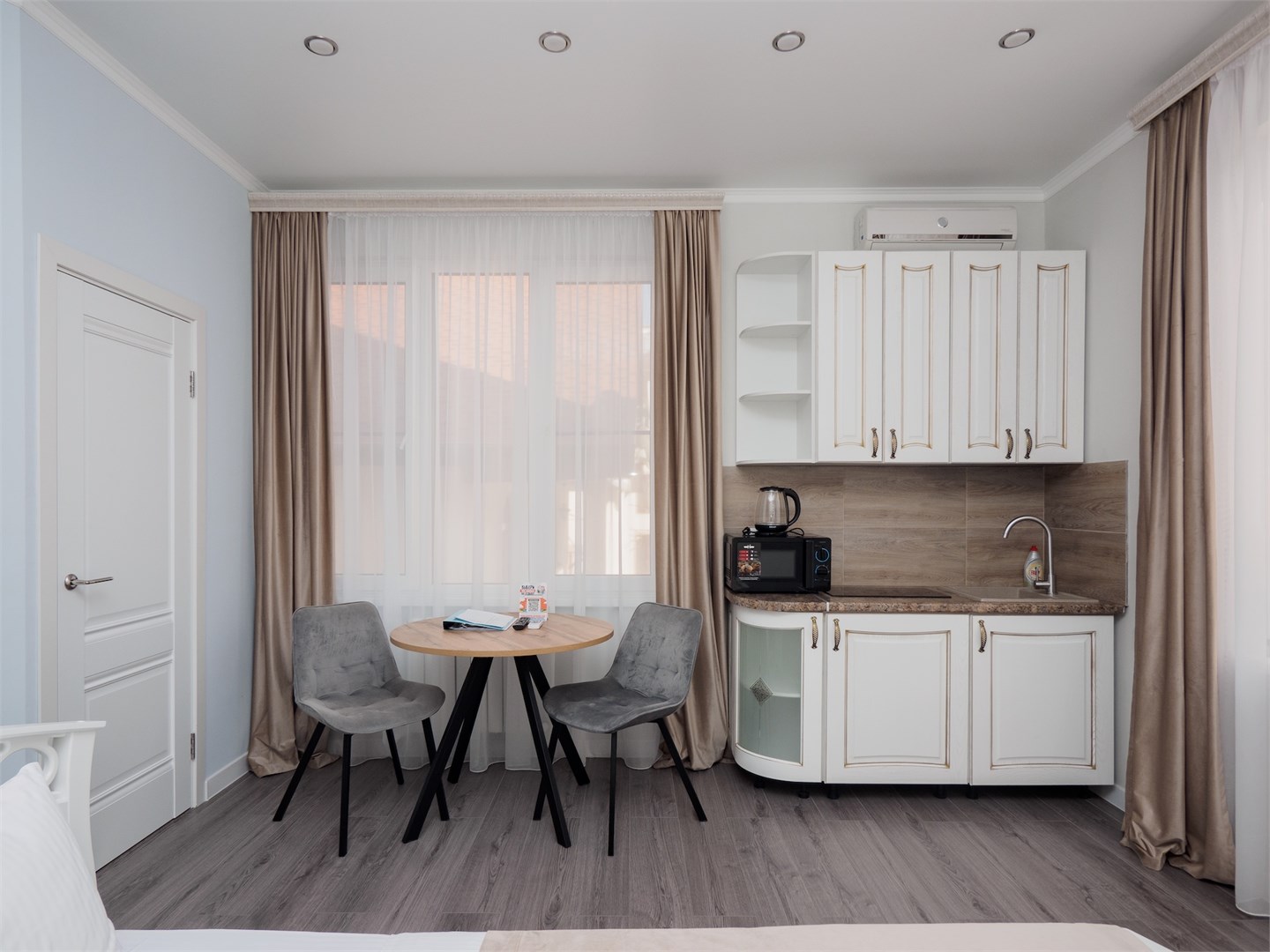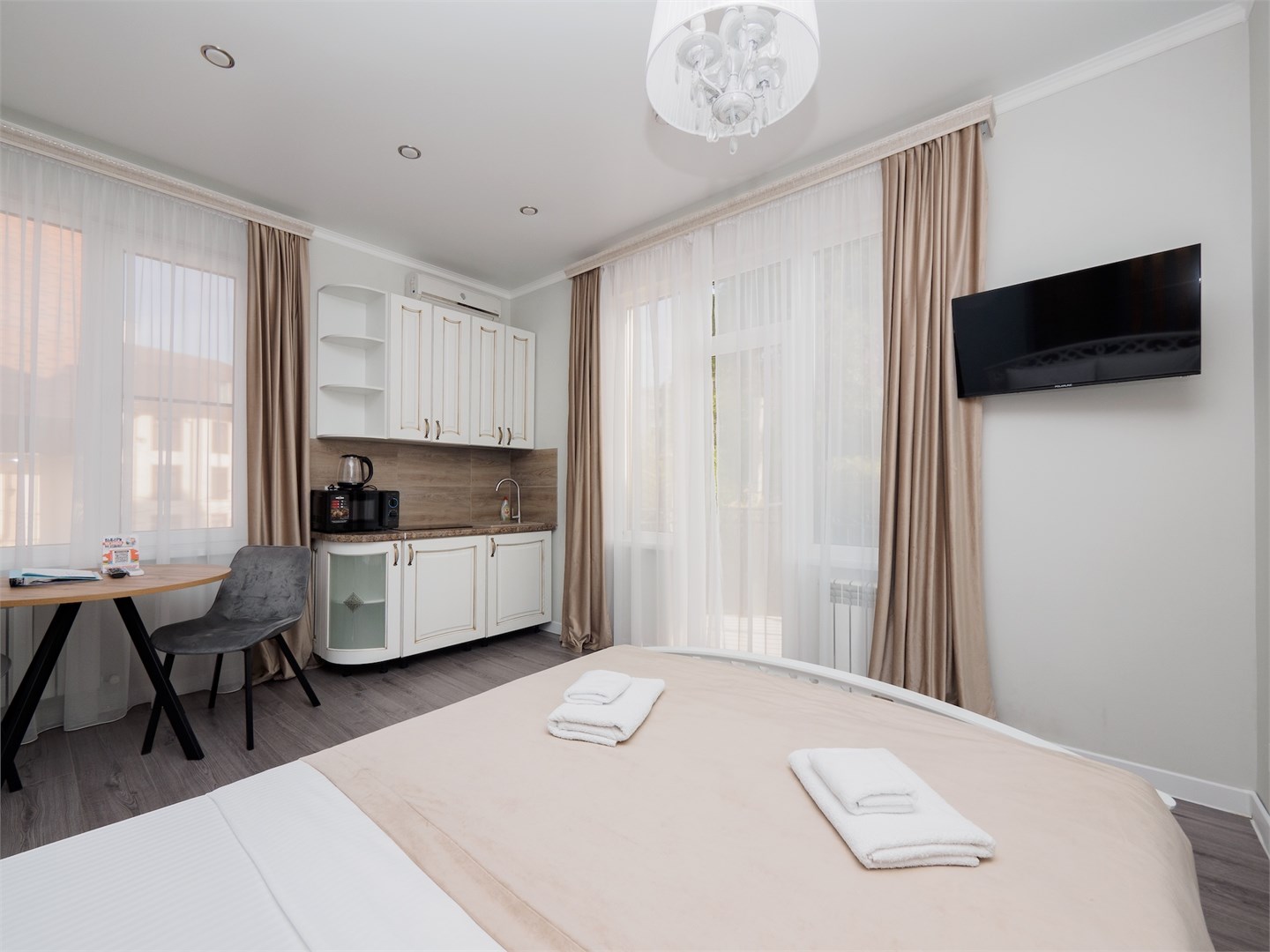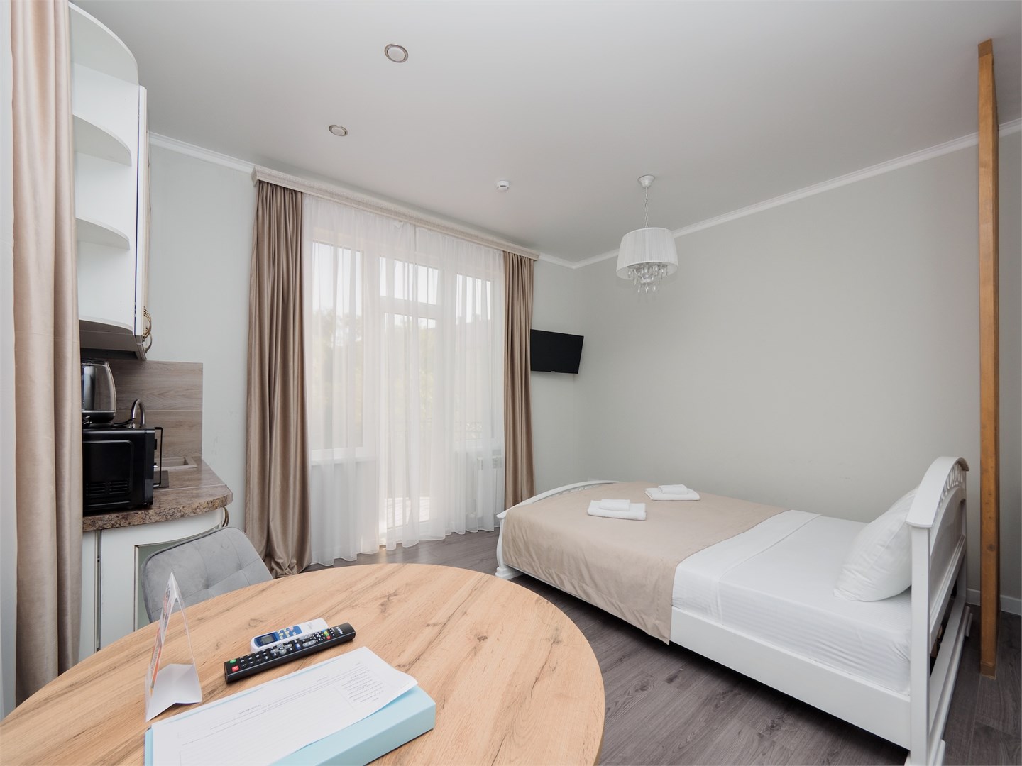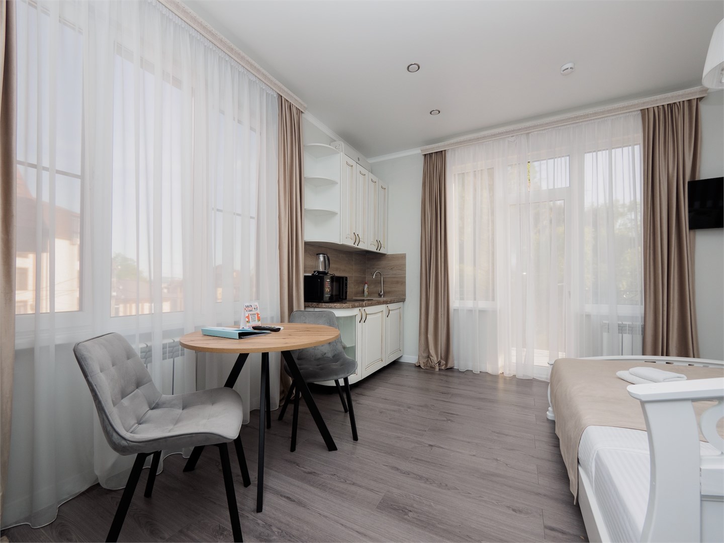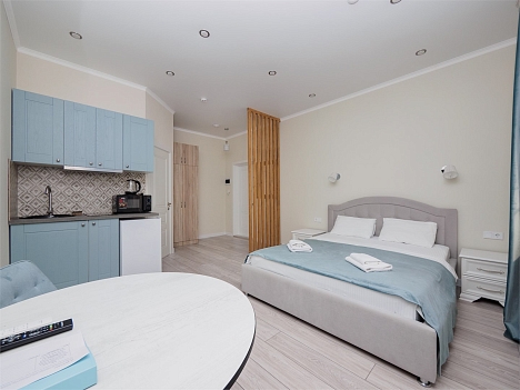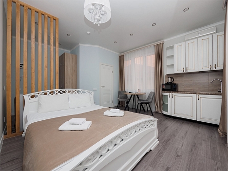 В номере: кровать двуспальная, кухонная мебель, стулья, шкаф, кондиционер, микроволновая печь, мультиварка, набор посуды, плита электрическая, сейф, стиральная машина, телевизор ЖК, утюг, холодильник, электрочайник