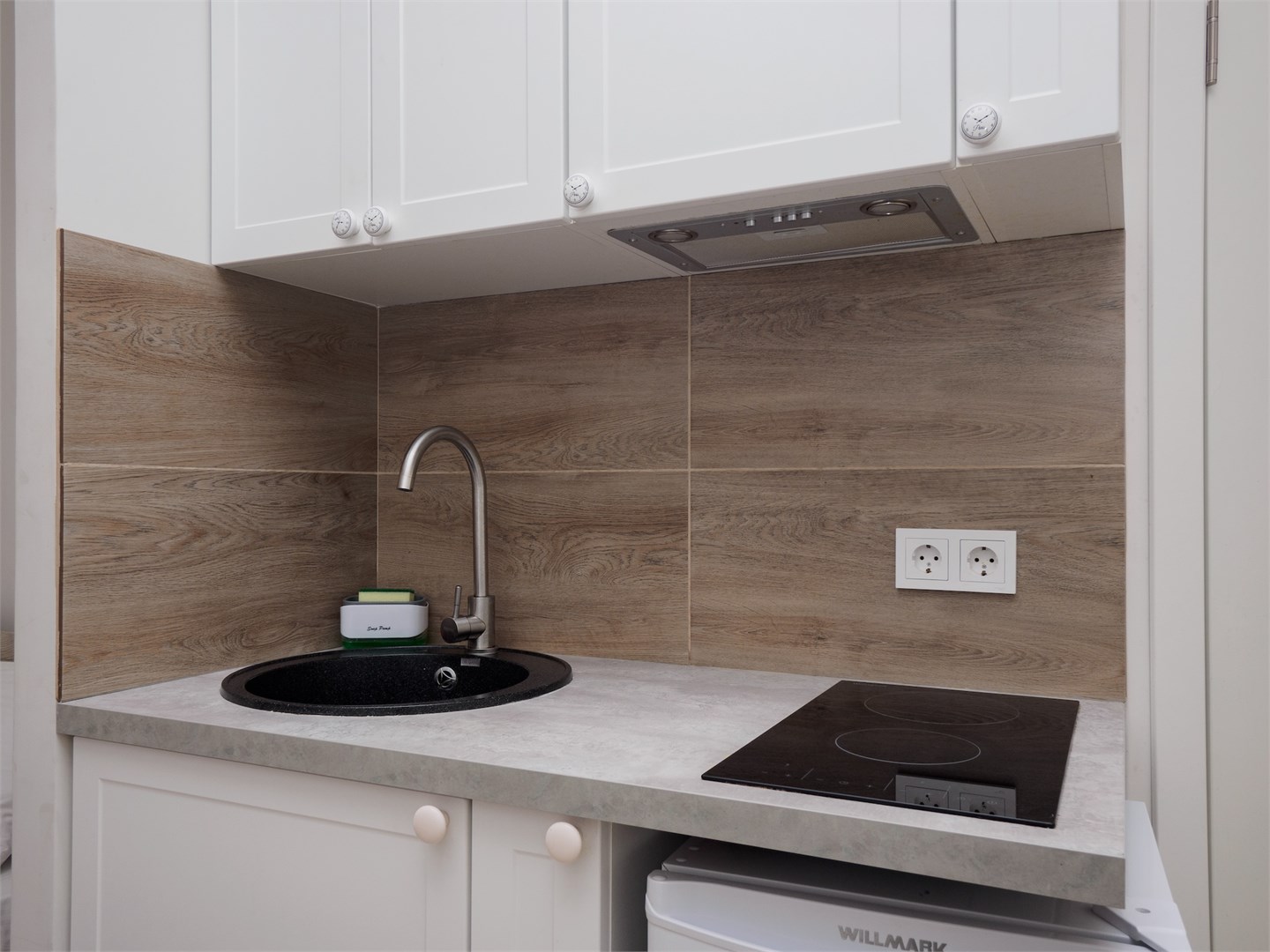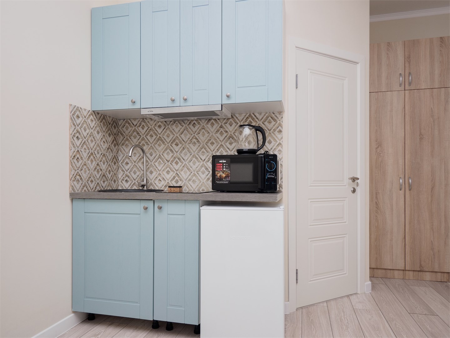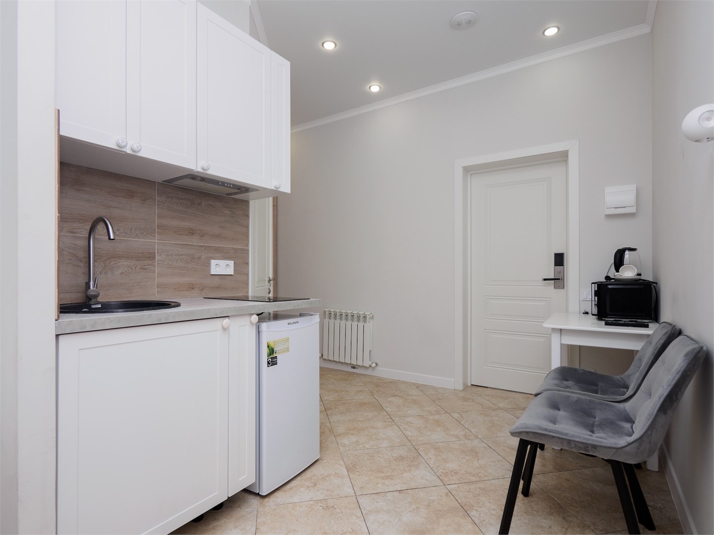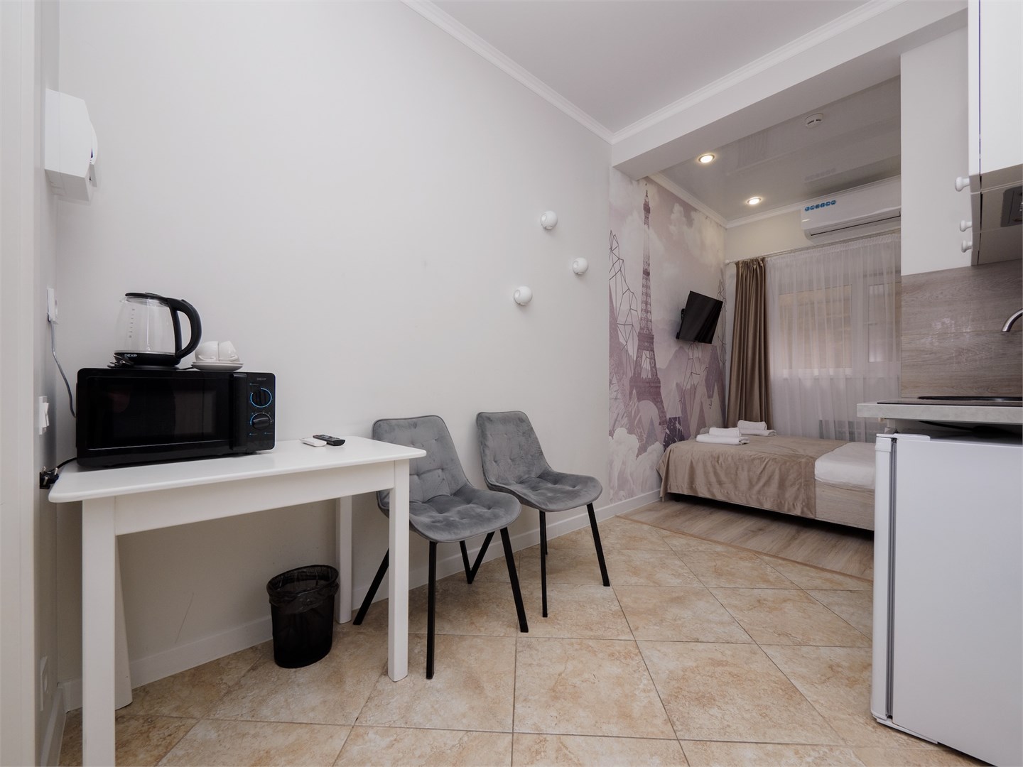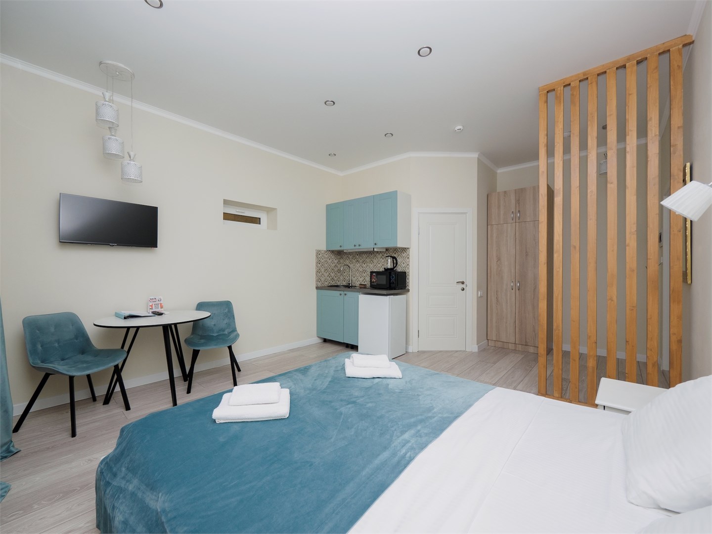 В номере: кровать двуспальная, кухонная мебель, стулья, шкаф, кондиционер, микроволновая печь, мультиварка, набор посуды, плита электрическая, сейф, стиральная машина, телевизор ЖК, утюг, холодильник, электрочайник