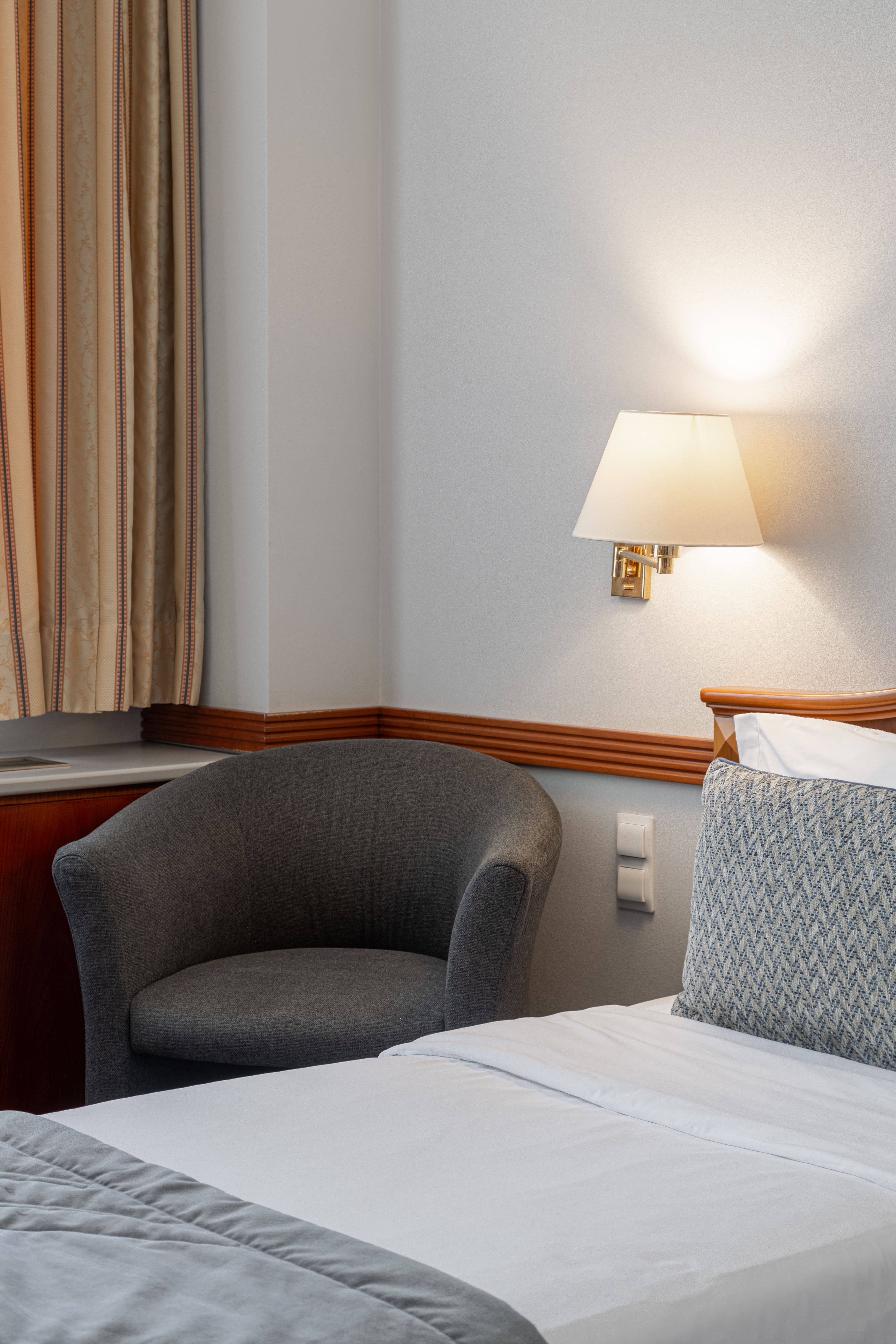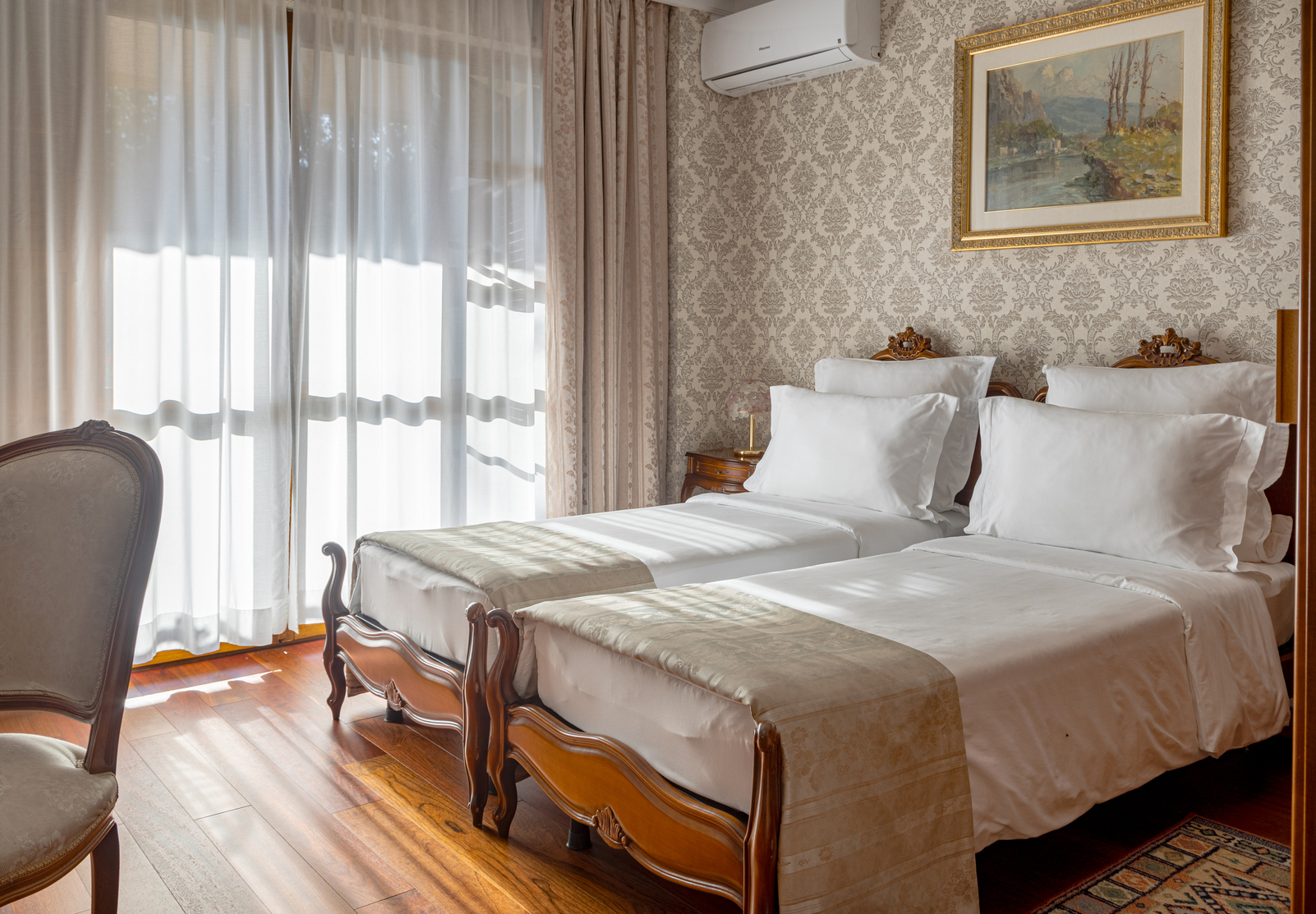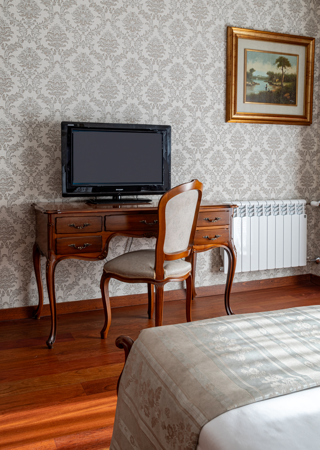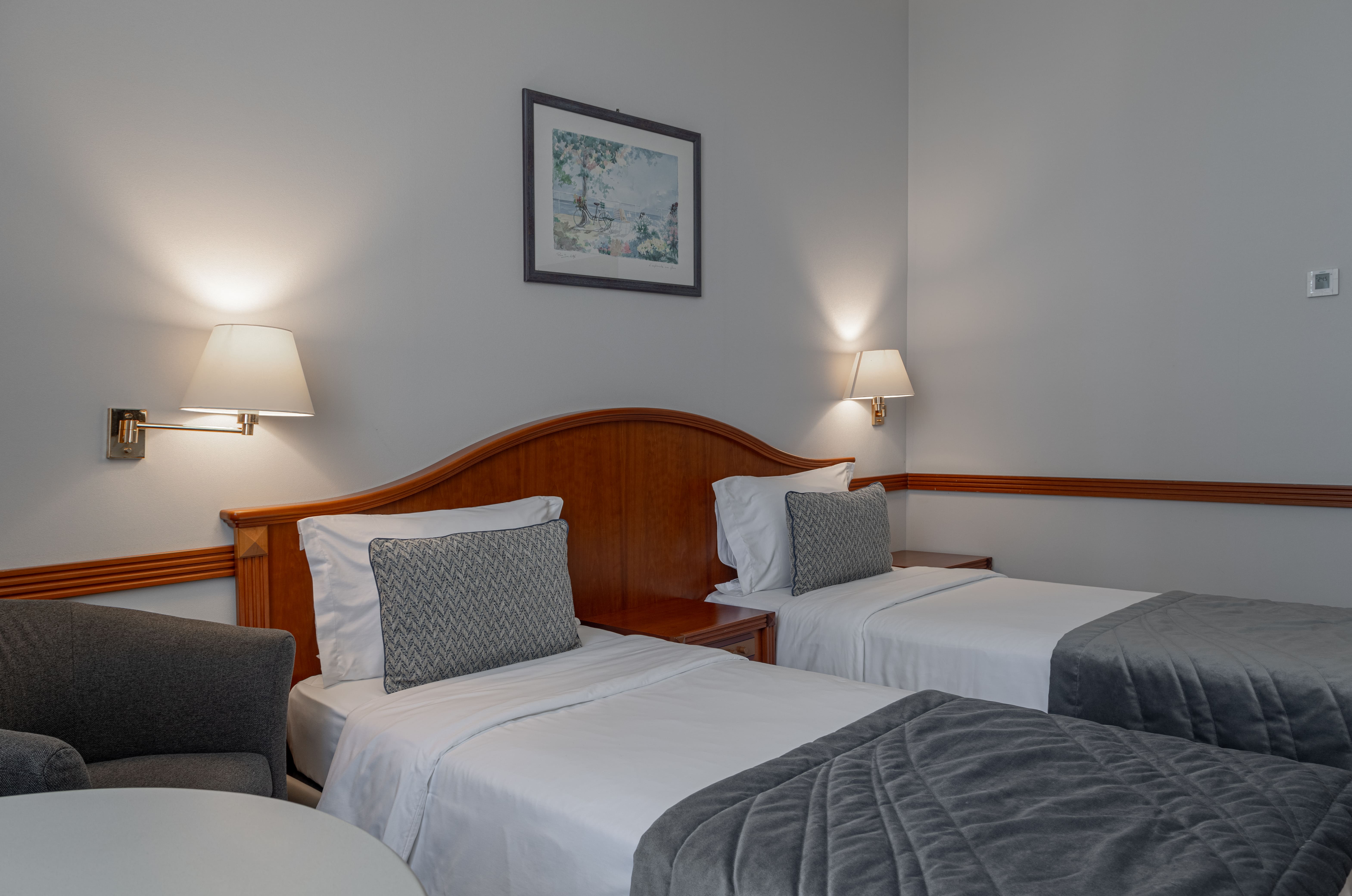 В номере: вешалка, гардеробная, зеркало, кровати односпальные /одна двуспальная кровать, стол, стулья, тумба багажная, шкаф, кондиционер, мини-холодильник, телевизор, телефон