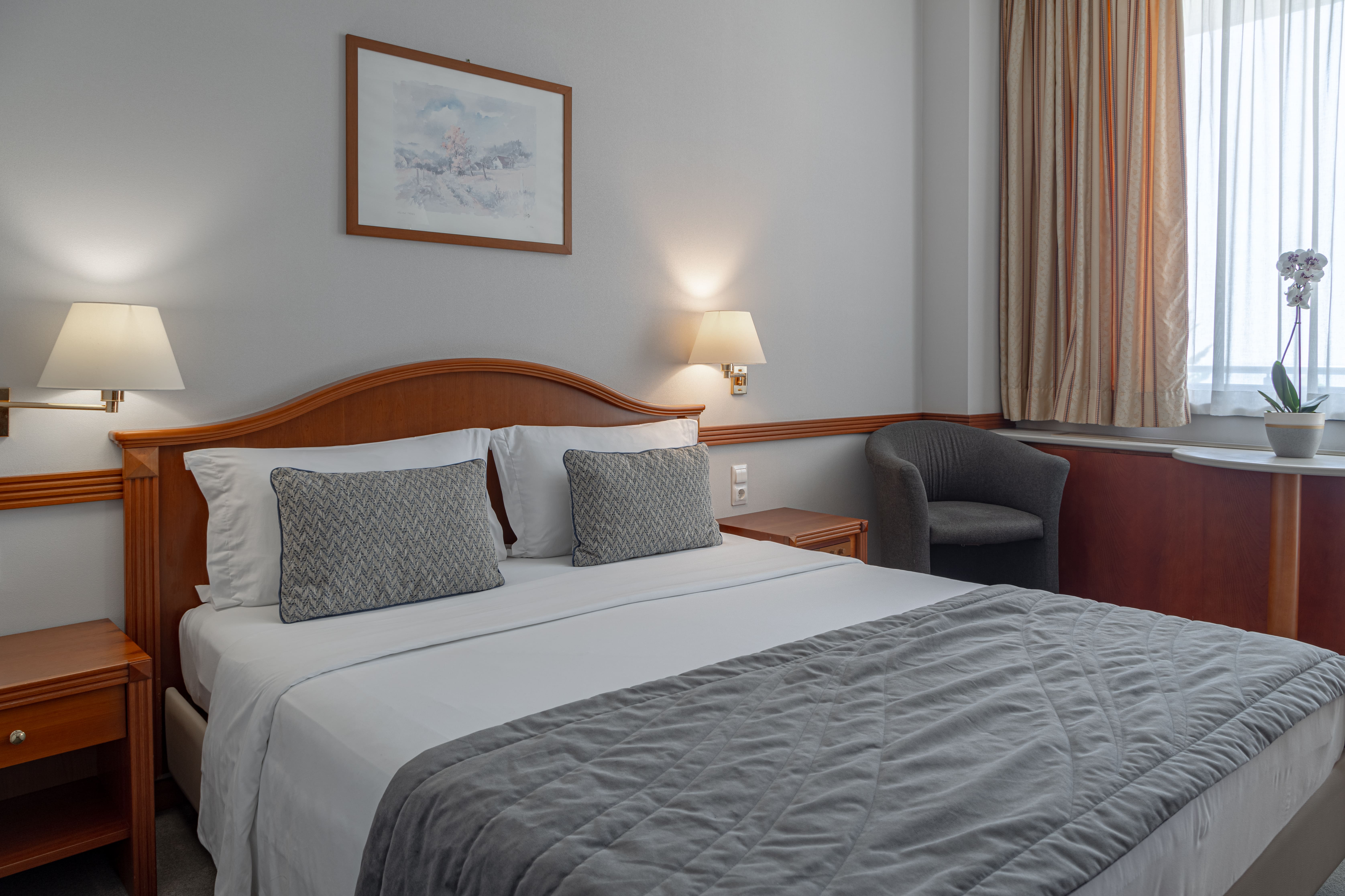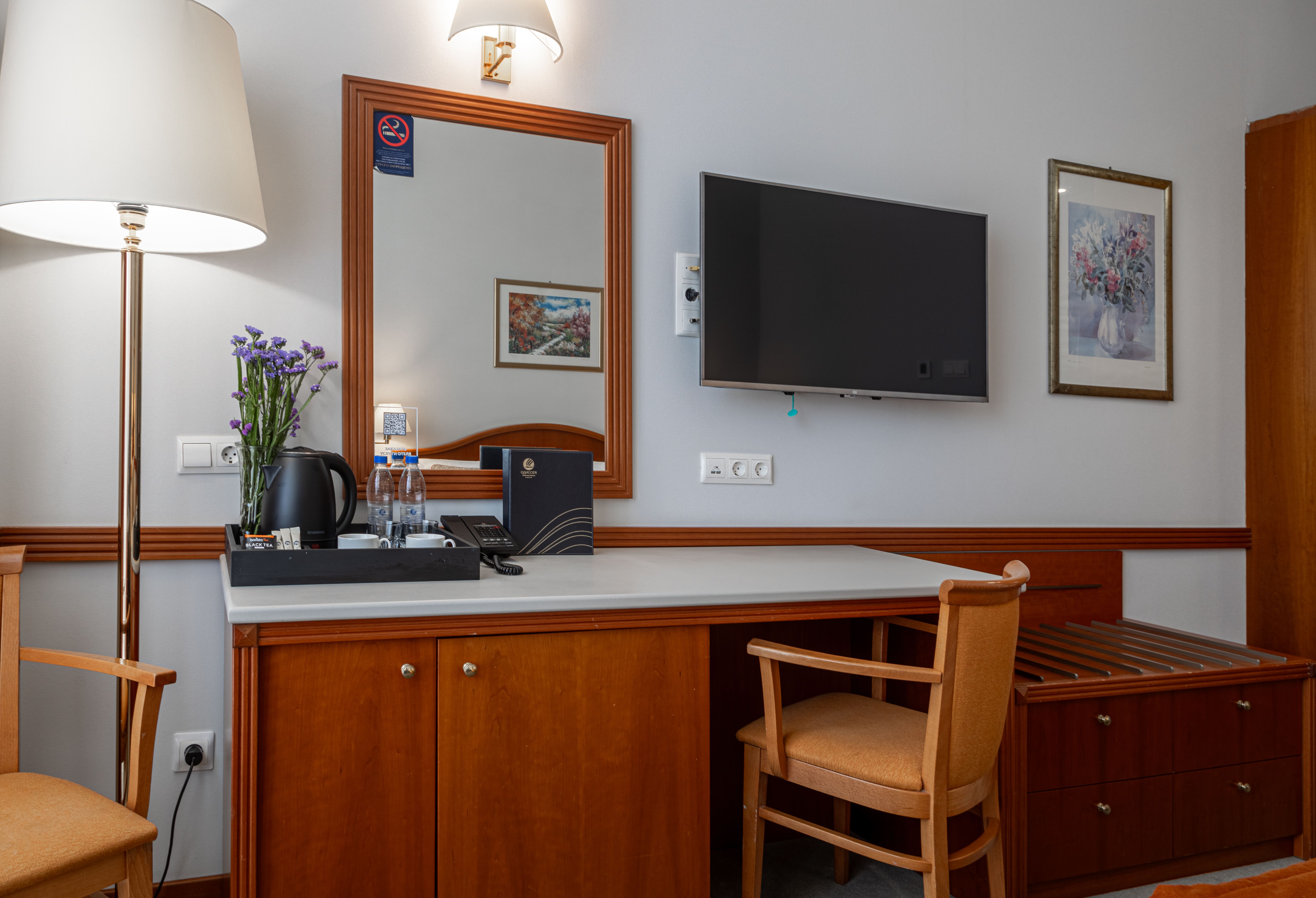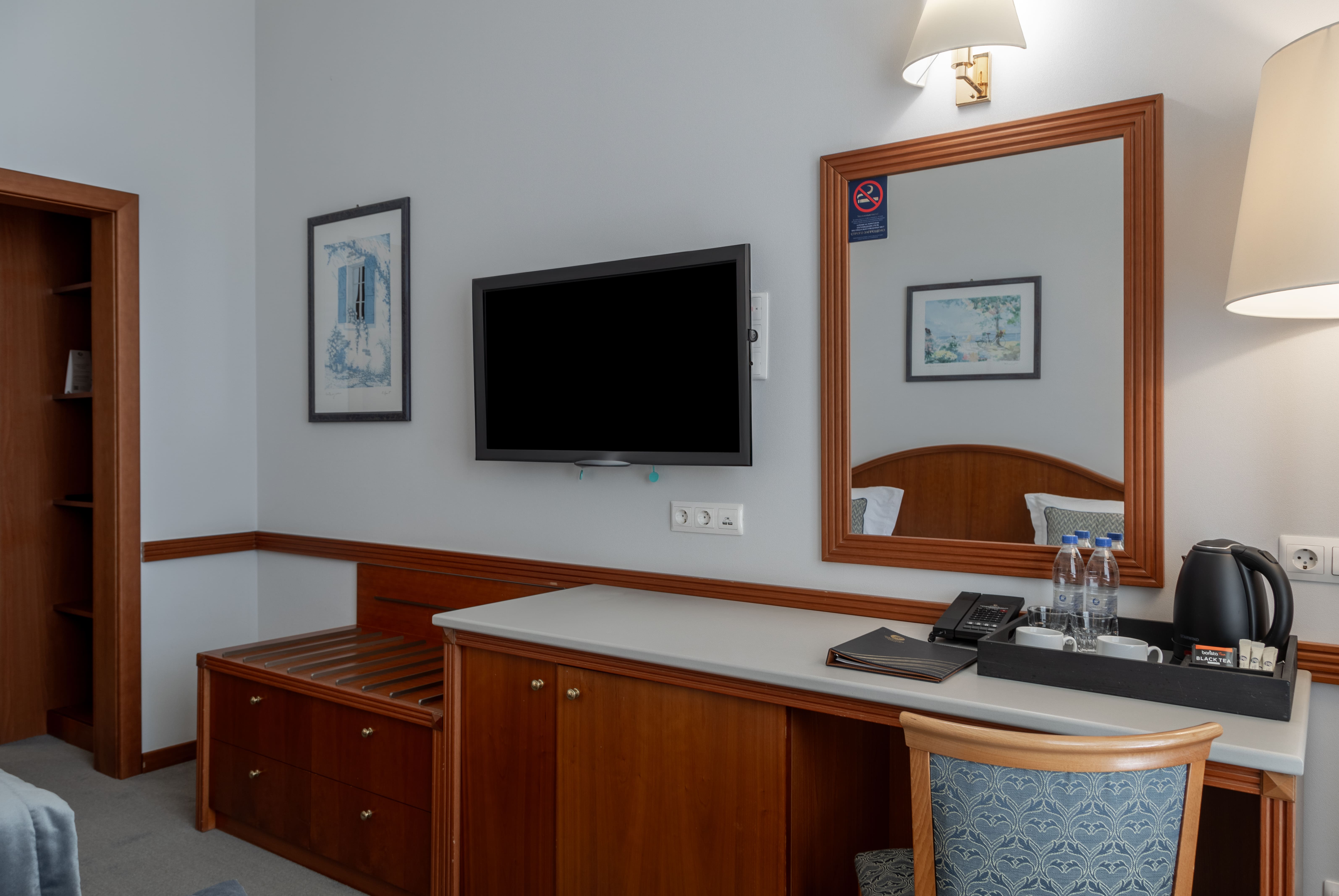 В номере: вешалка, зеркало, кресло, кровати односпальные /одна двуспальная кровать, прикроватные тумбочки, стол, тумба багажная, мини-холодильник, сплит-система, телевизор ЖК, чайный набор посуды, электрочайник