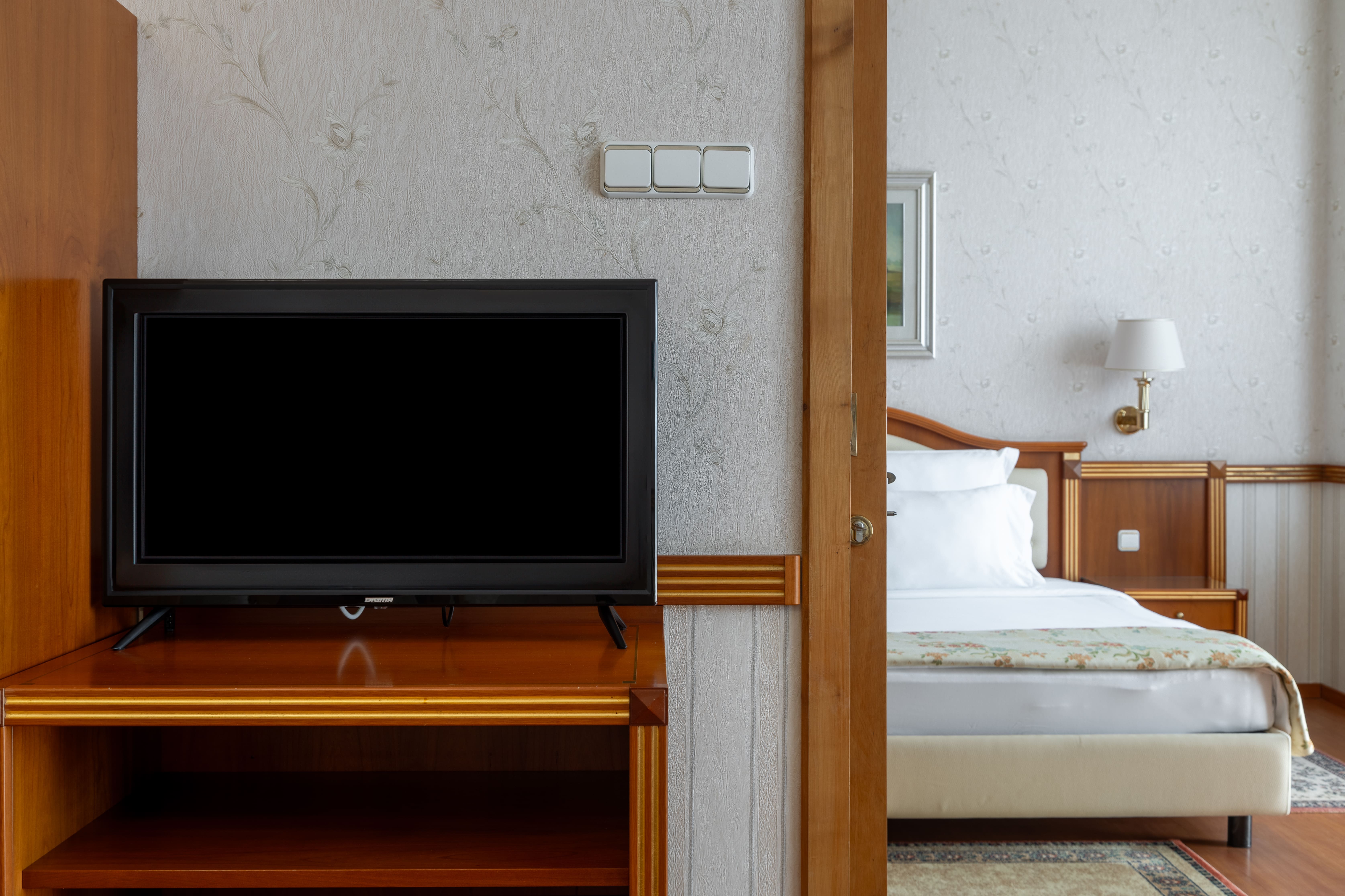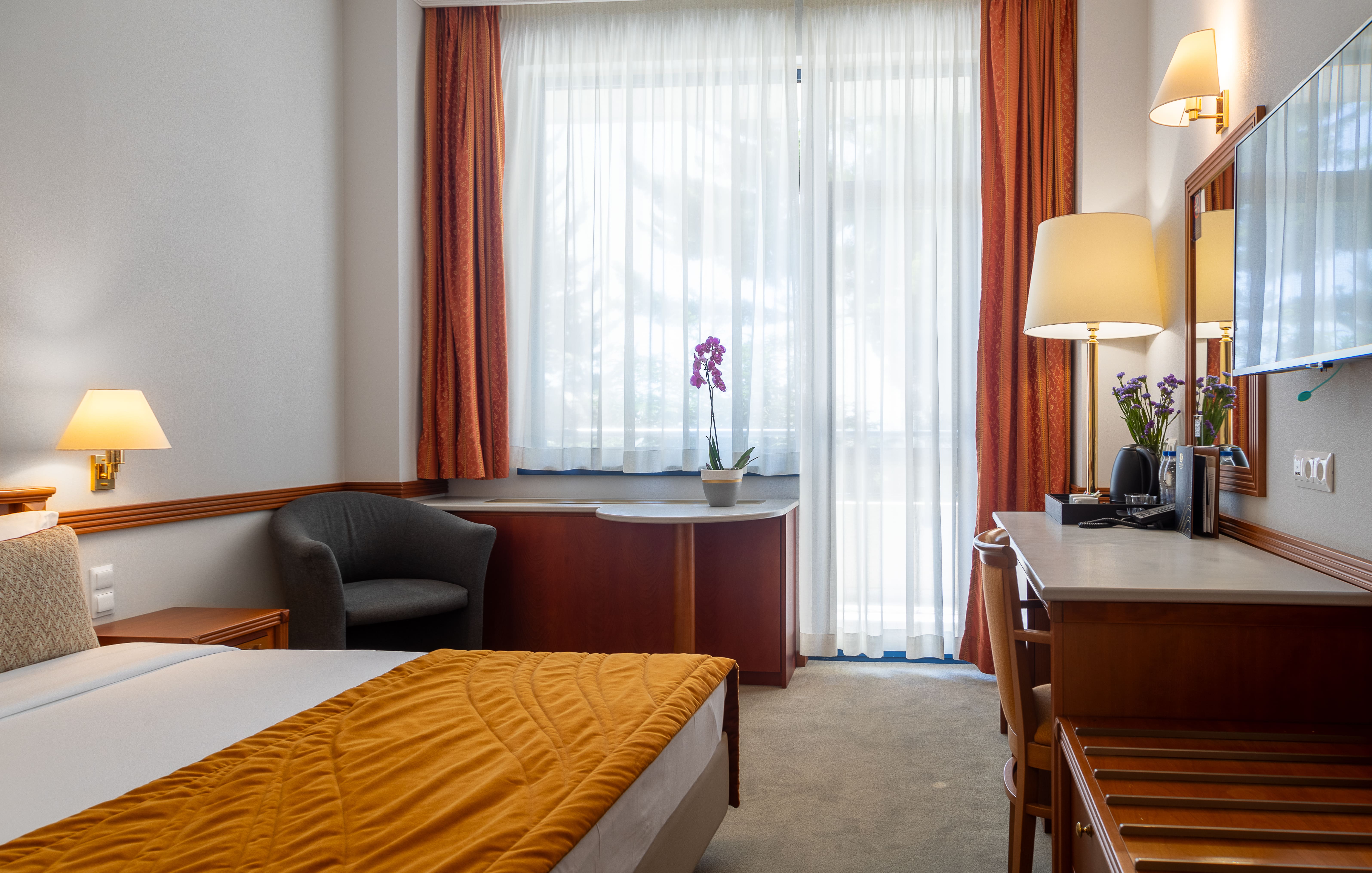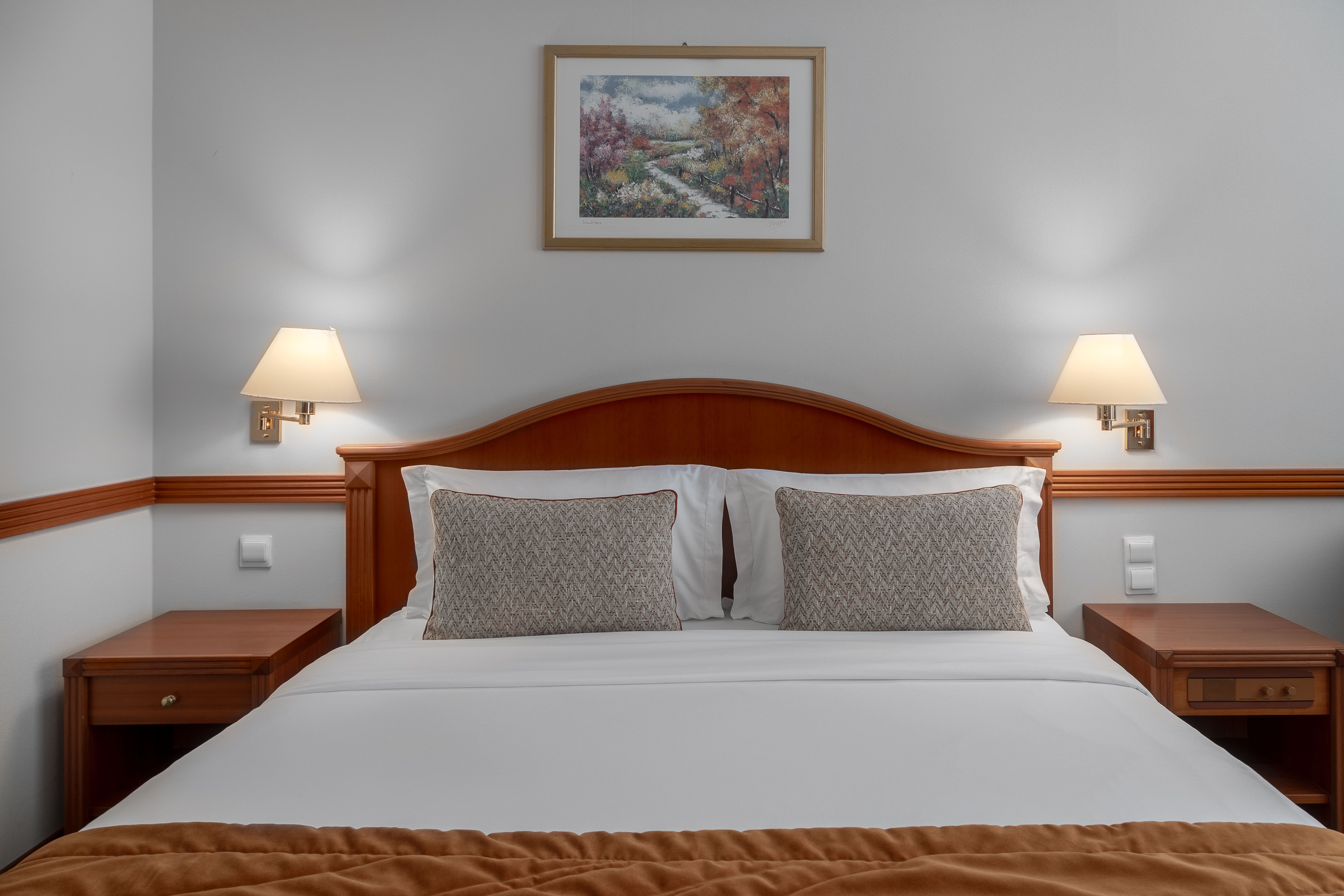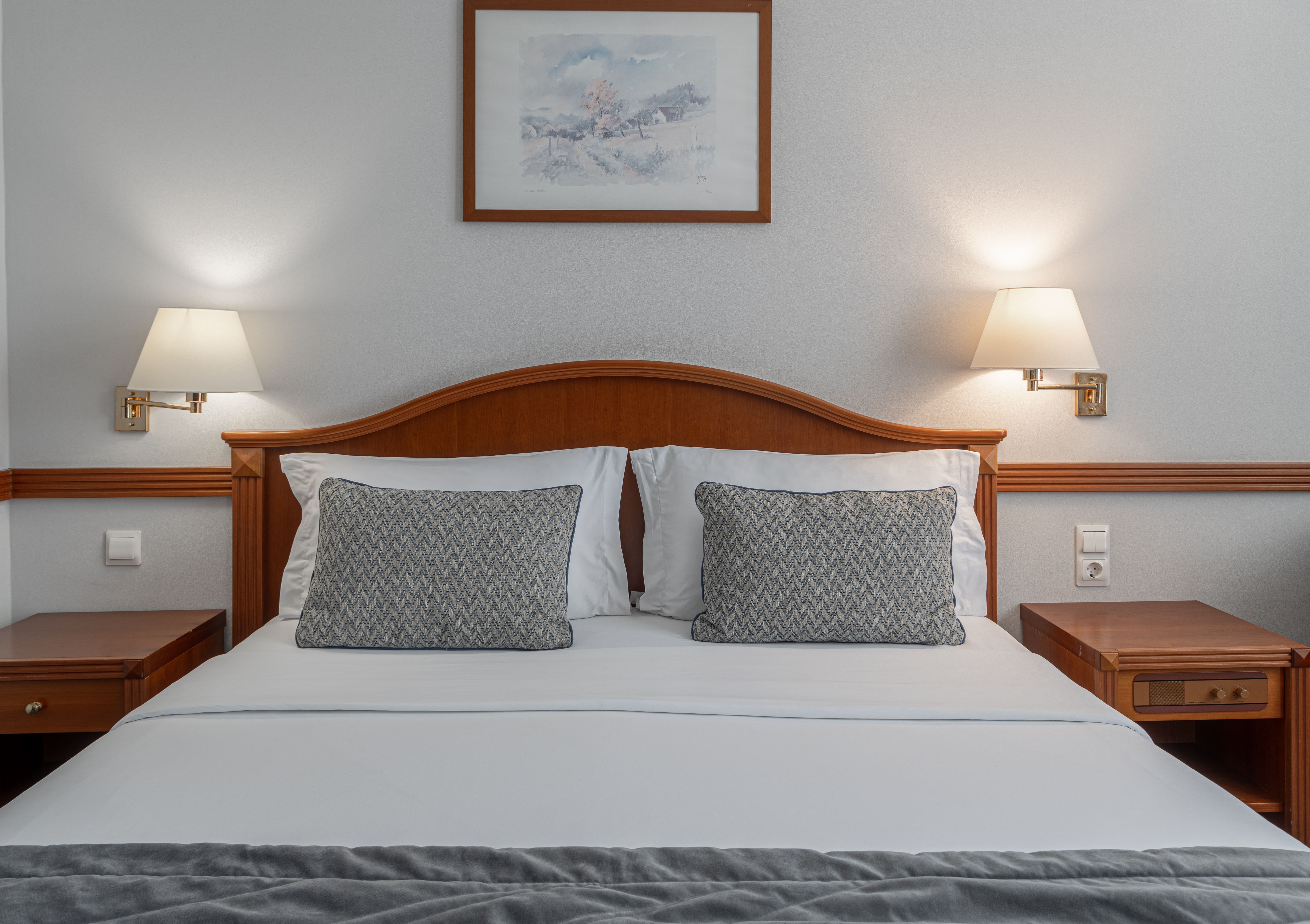 В номере: вешалка, зеркало, кресло, кровати односпальные /одна двуспальная кровать, прикроватные тумбочки, стол, тумба багажная, мини-холодильник, сплит-система, телевизор ЖК, чайный набор посуды, электрочайник
