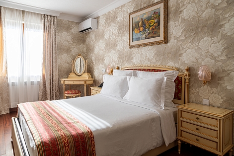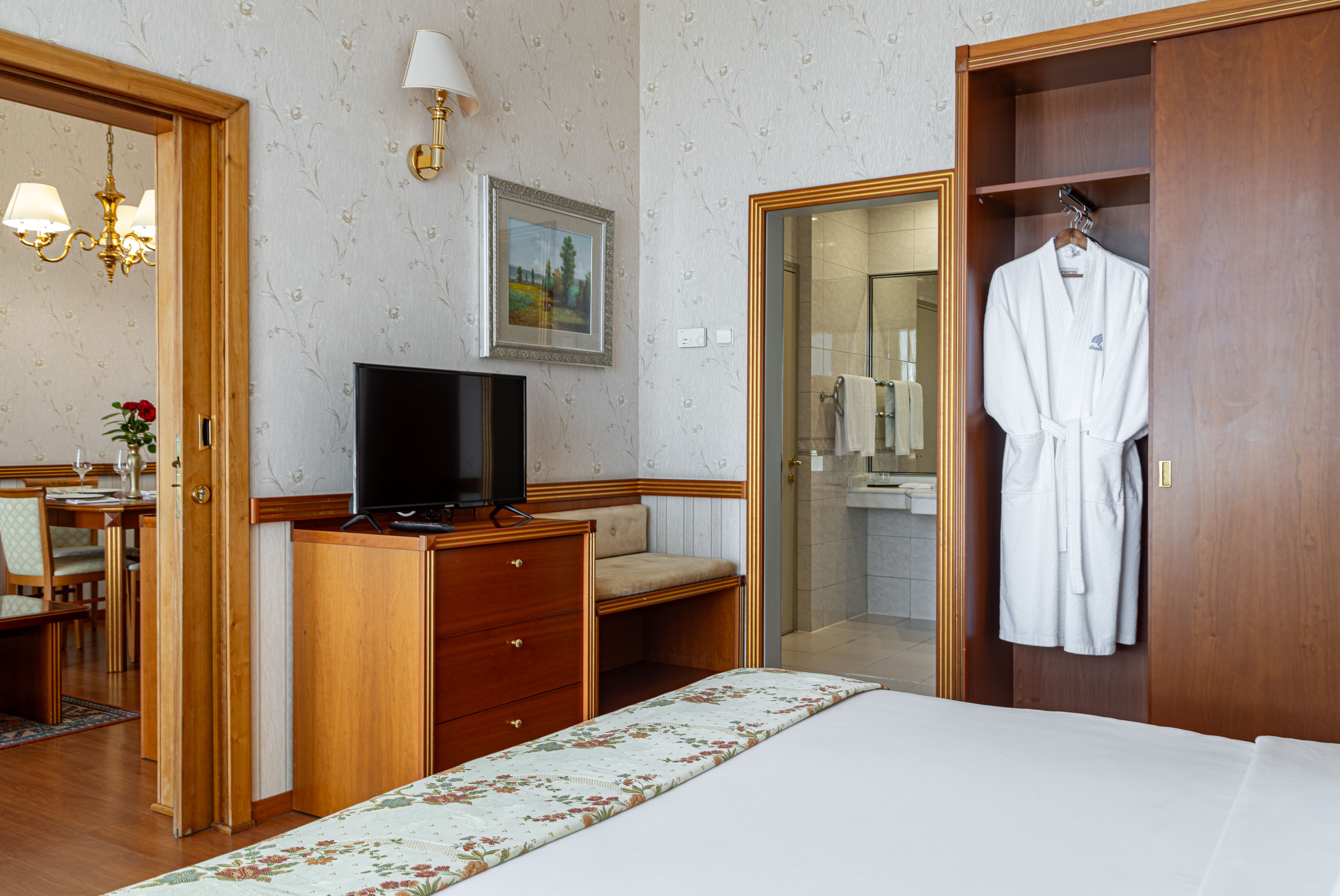 В номере: диван, кресла, кровать двуспальная, шкаф, кондиционер, музыкальный центр, телевизор, телефон, холодильник