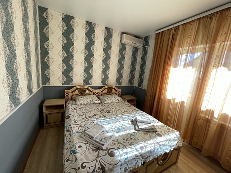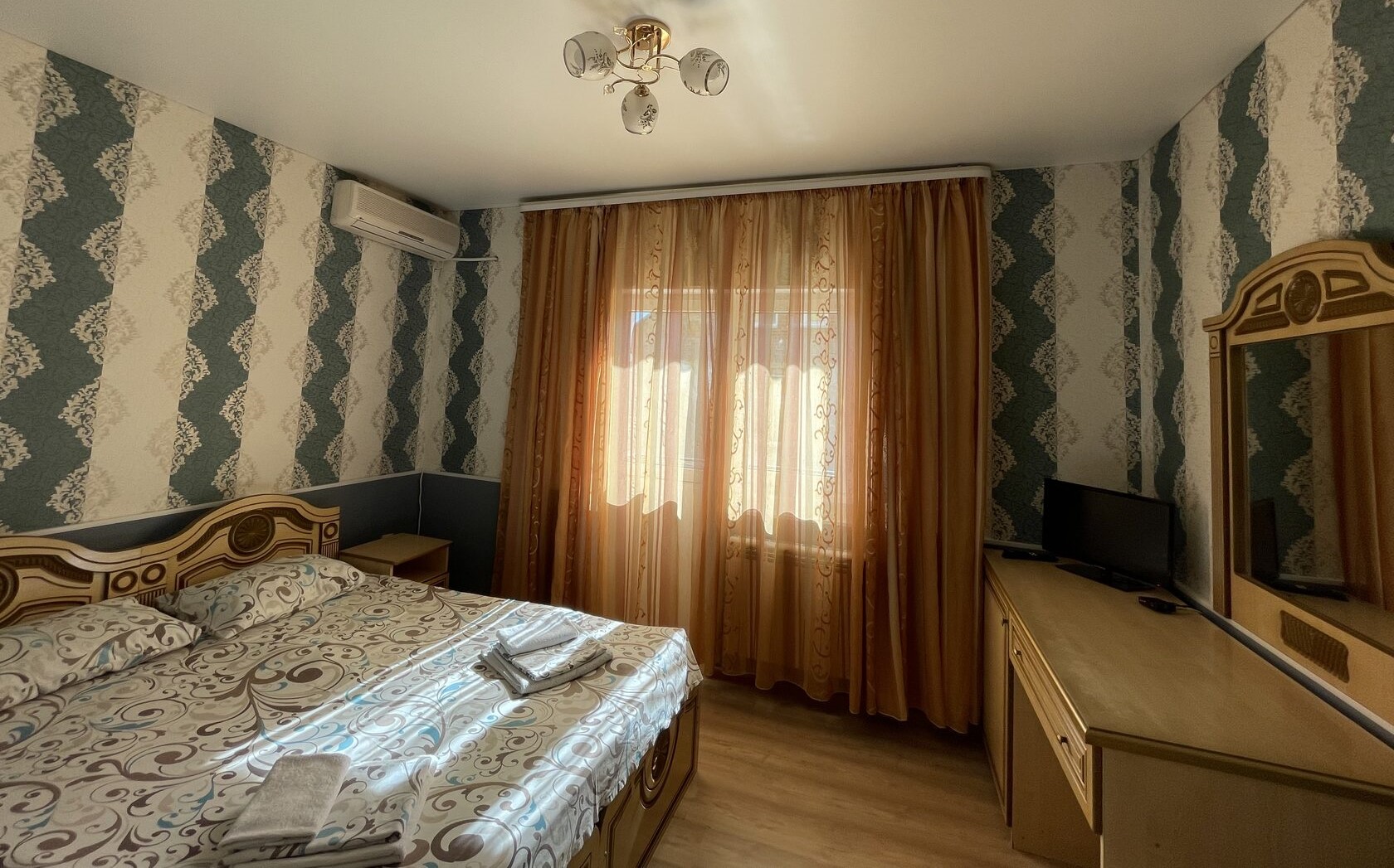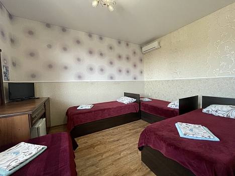 В номере: зеркало, кровать двуспальная, кровать односпальная, прикроватные тумбочки, стол, шкаф, кондиционер, мини-холодильник, телевизор ЖК