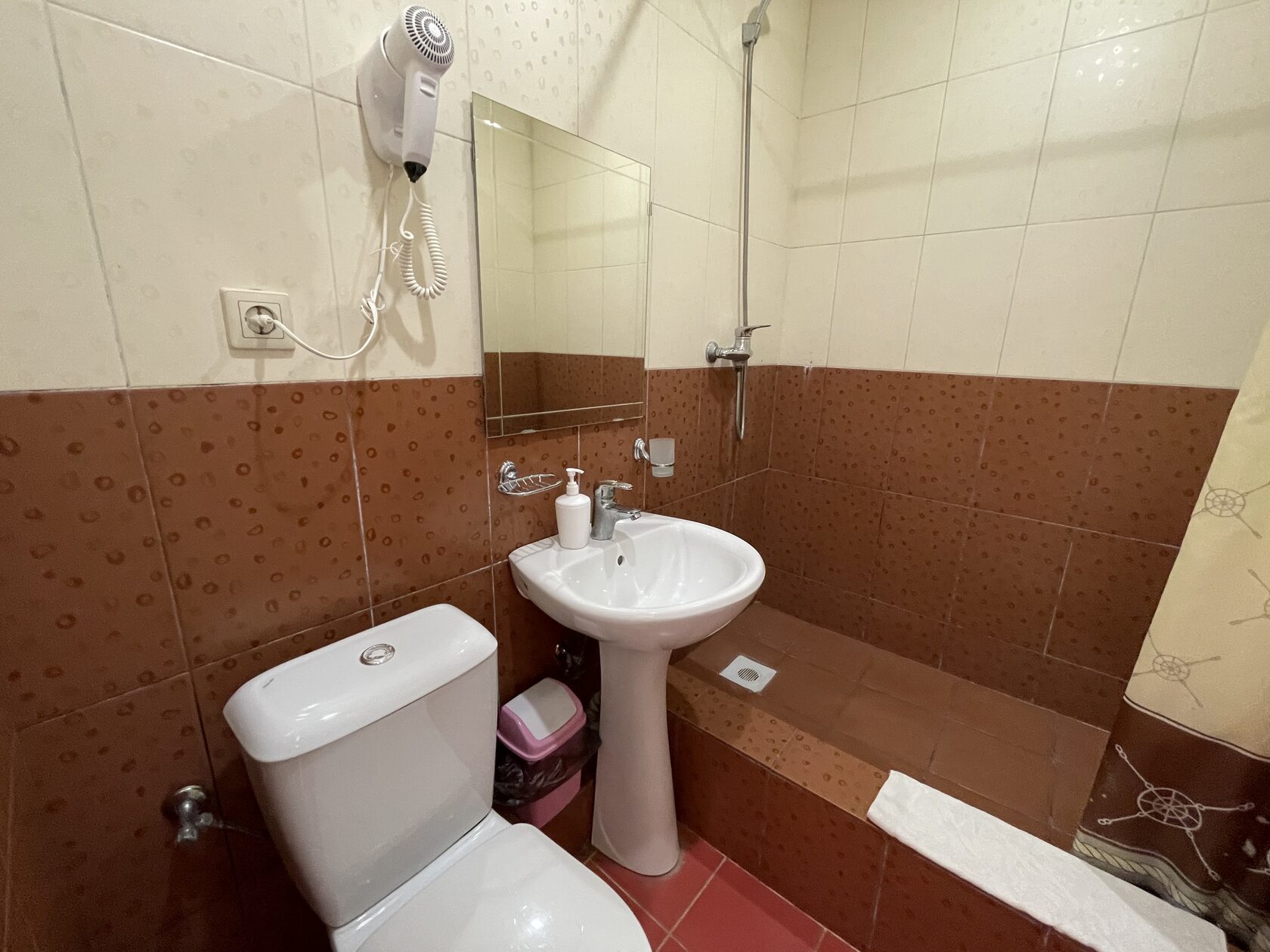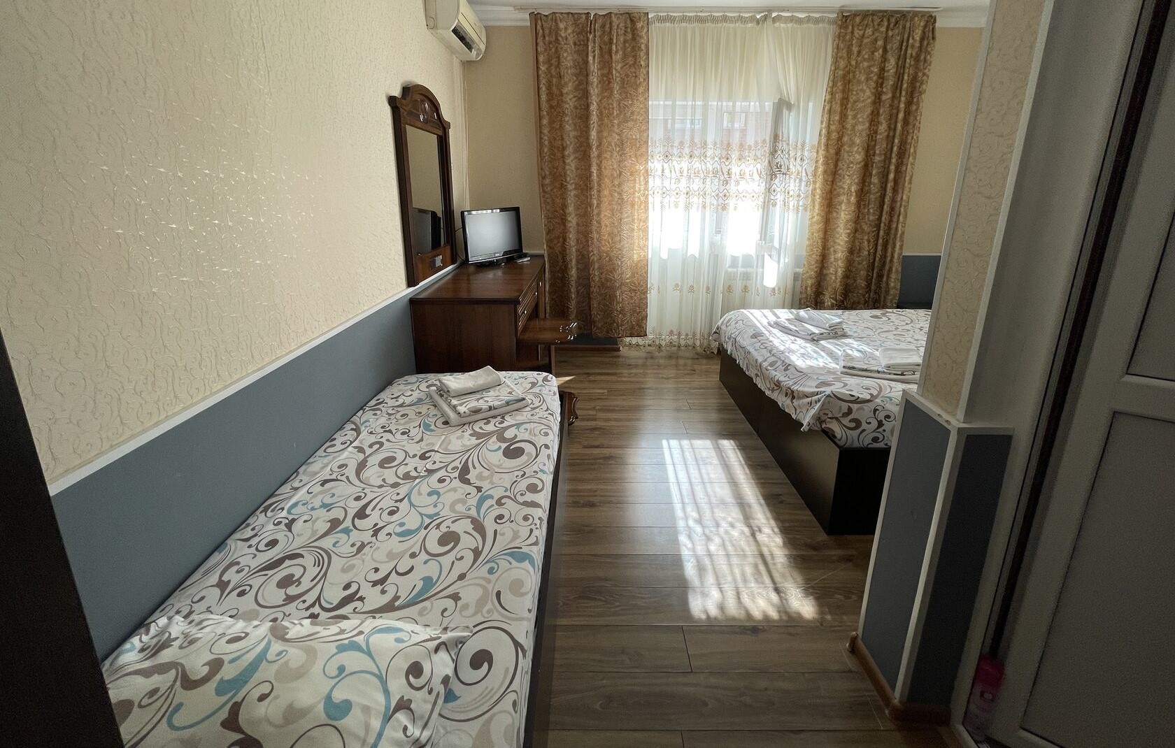 В номере: зеркало, кровати односпальные, прикроватные тумбочки, стол, шкаф, кондиционер, мини-холодильник, телевизор ЖК