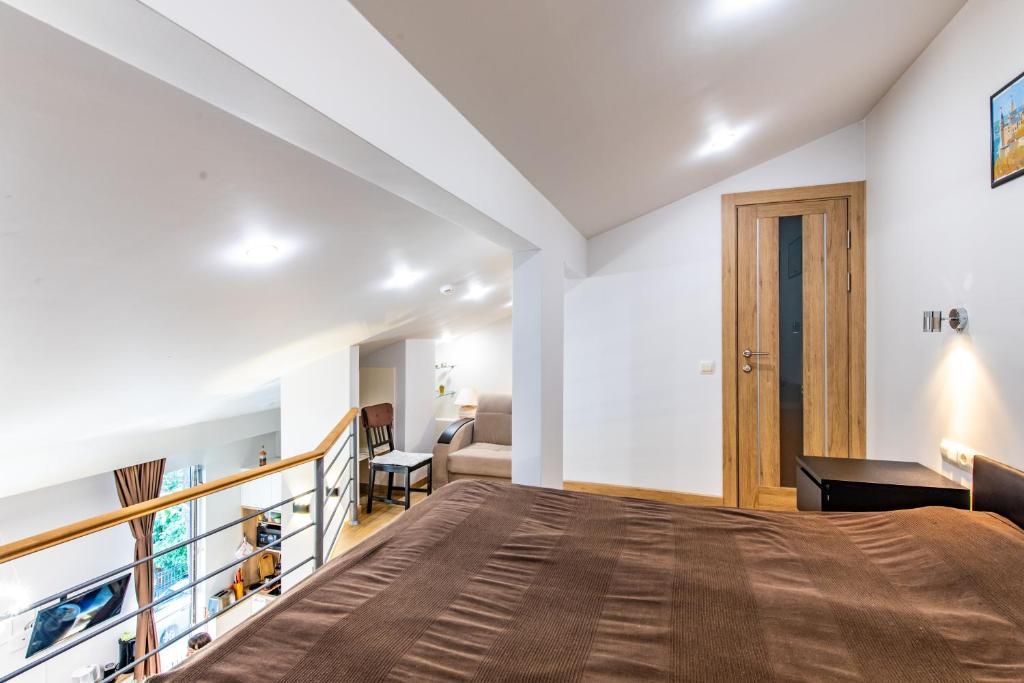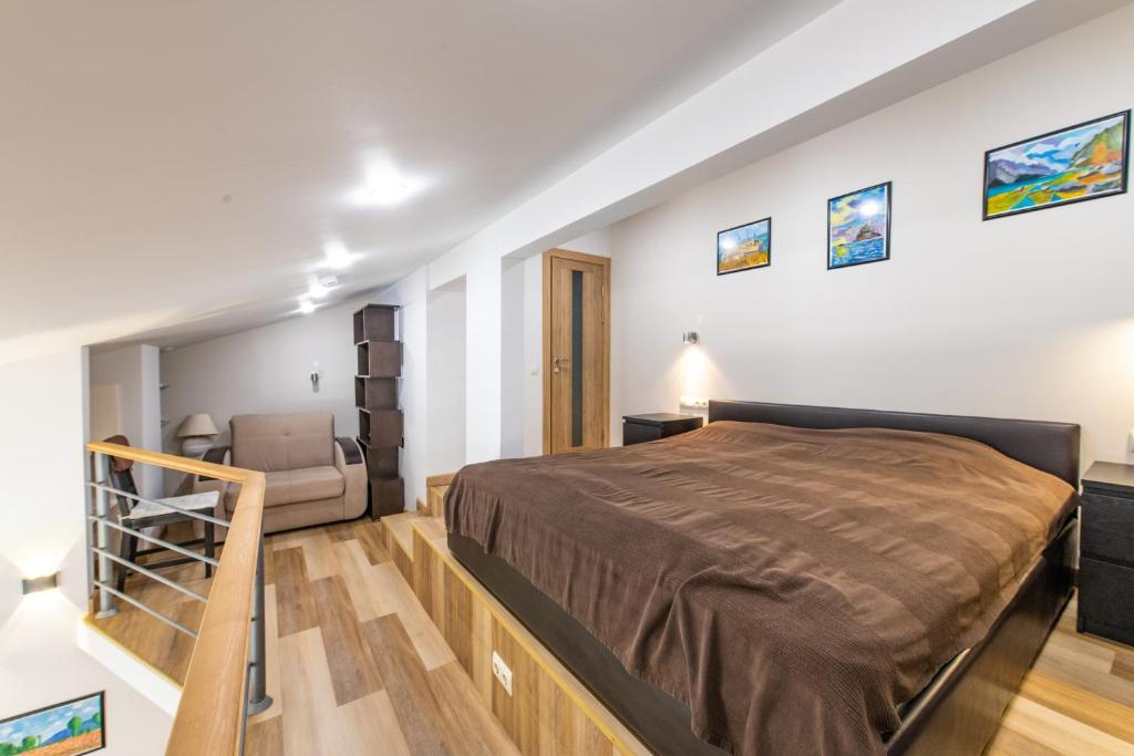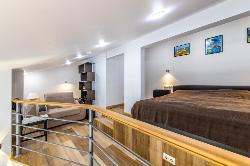 В номере: диван раскладной, зеркало, кресло-кровать, кровать двуспальная, кухонная мебель, прикроватные тумбочки, столик журнальный, стулья, шкаф, кондиционер, микроволновая печь, набор посуды, плита электрическая, посудомоечная машина, стиральная машина, холодильник, чайный набор посуды, электрочайник