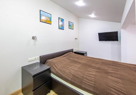 В номере: диван раскладной, зеркало, кровать двуспальная, кухонная мебель, прикроватные тумбочки, стол, стул, шкаф-купе, кондиционер, микроволновая печь, набор посуды, плита электрическая, стиральная машина, телевизор, холодильник, чайный набор посуды, электрочайник