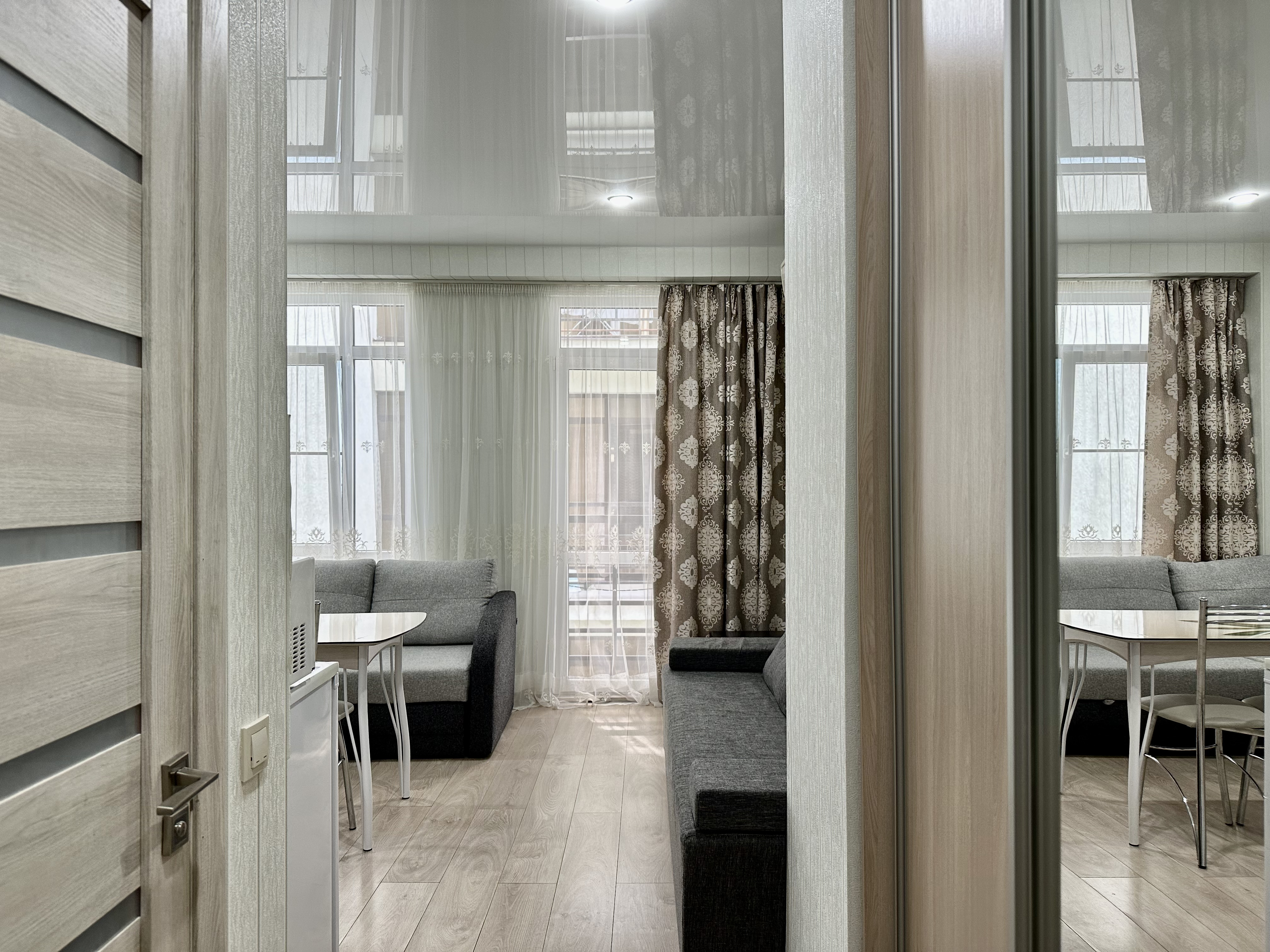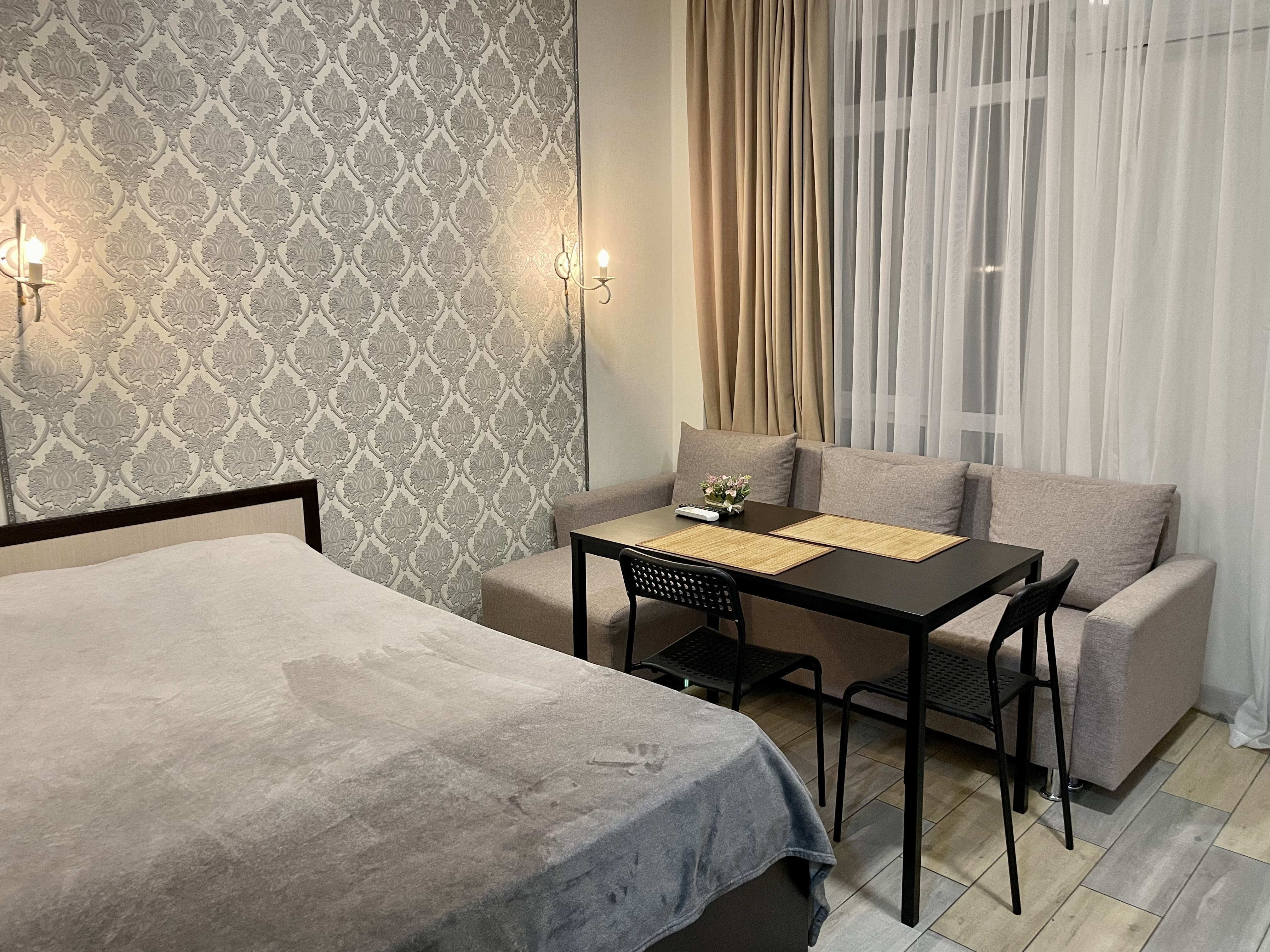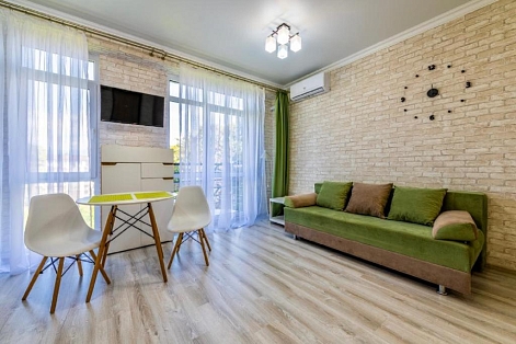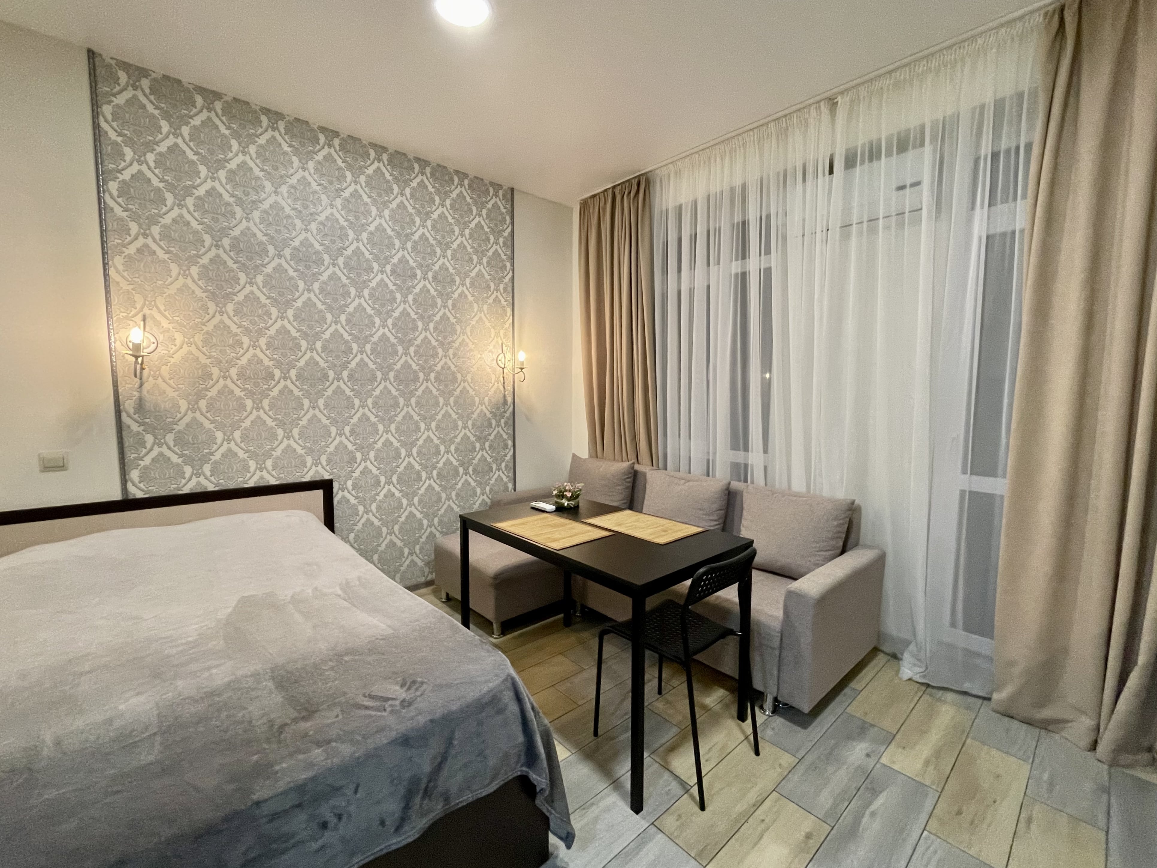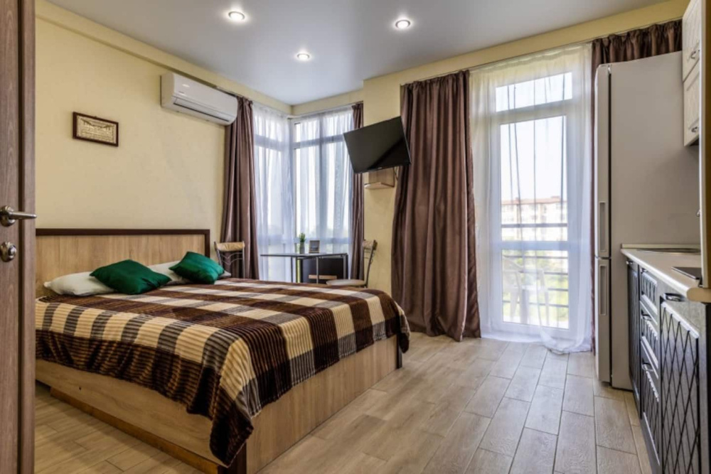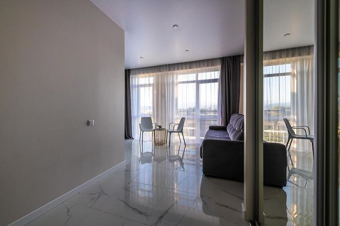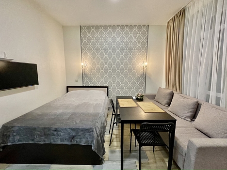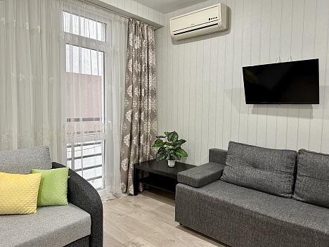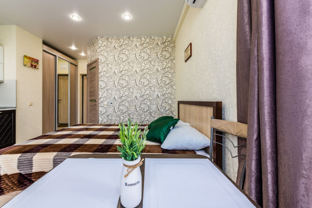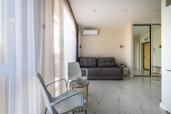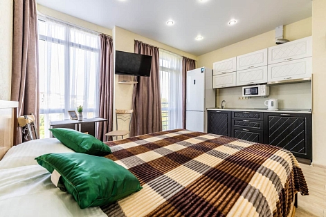 В номерах стильный лаконичный интерьер, есть вся необходимая техника. Помимо кухонной техники, в апартаментах есть плазменный телевизор, фен, кондиционер и стиральная машина. Некоторые номера оборудованы балконами, откуда открываются красивые виды на море.Для гостей, приезжающих на машинах, доступна охраняемая автостоянка, также на всей территории подключен высокоскоростной беспроводной интернет.Всего в 300 метрах от отеля распложен городской пляж «Мандарин». На галечном побережье все предусмотрено для хорошего пляжного отдыха: есть раздевалки, теневые навесы, шезлонги, работает пункт проката пляжных аксессуаров, открыто кафе.