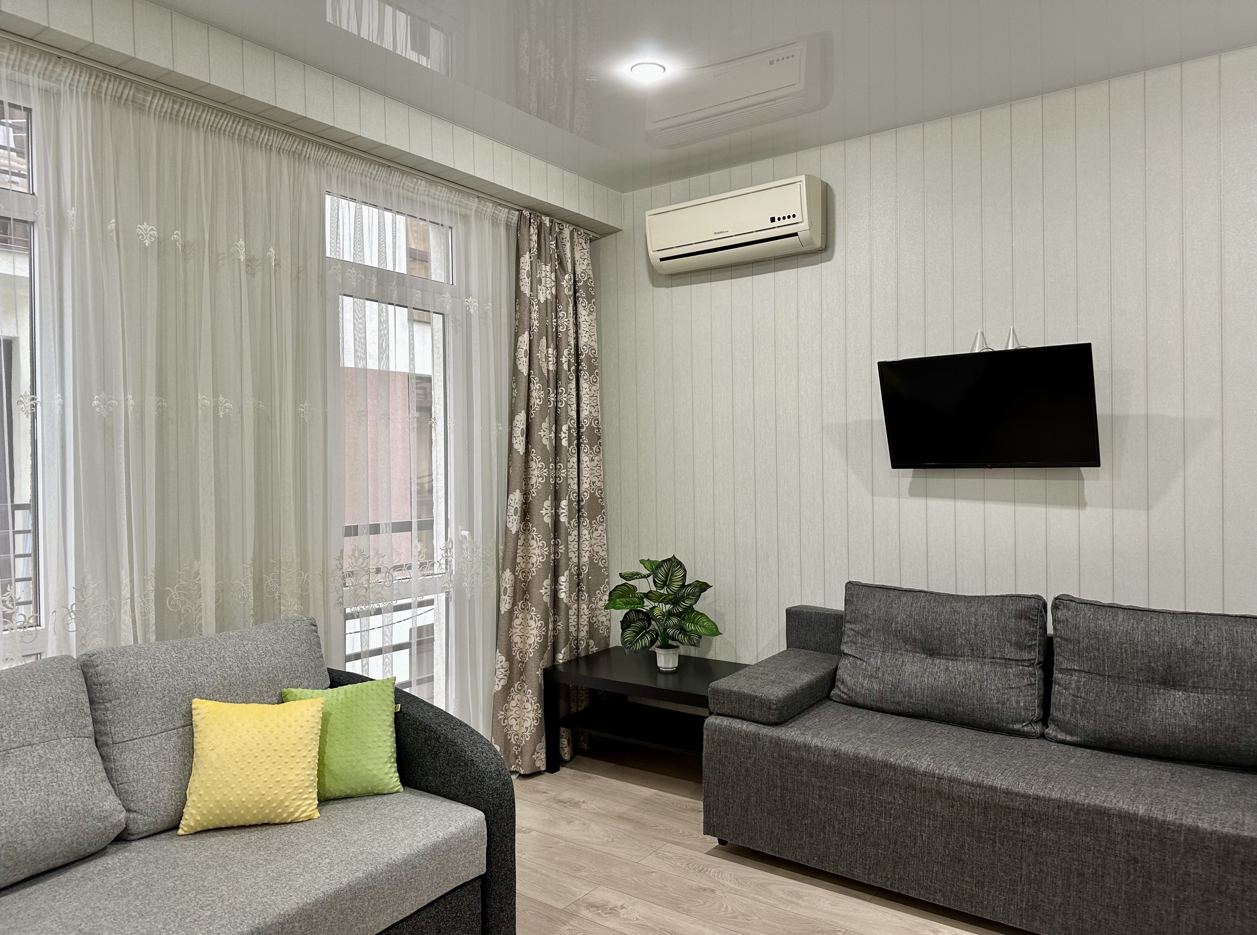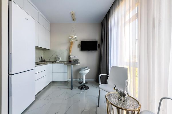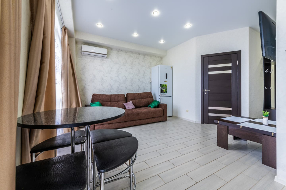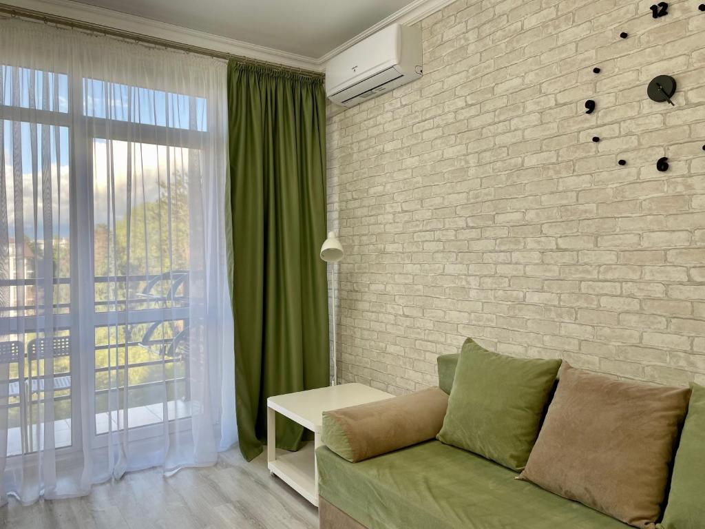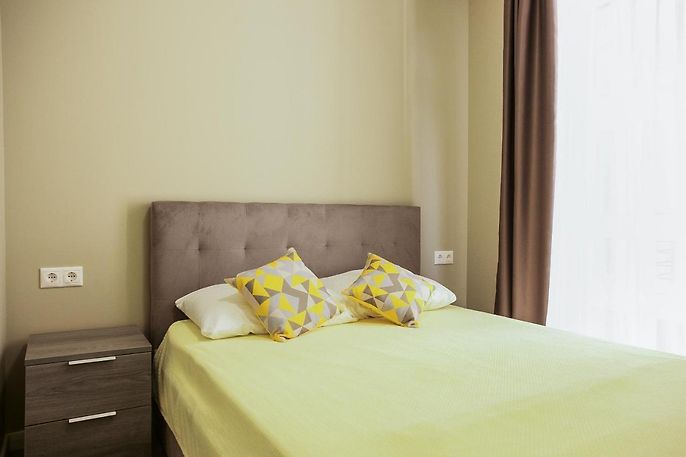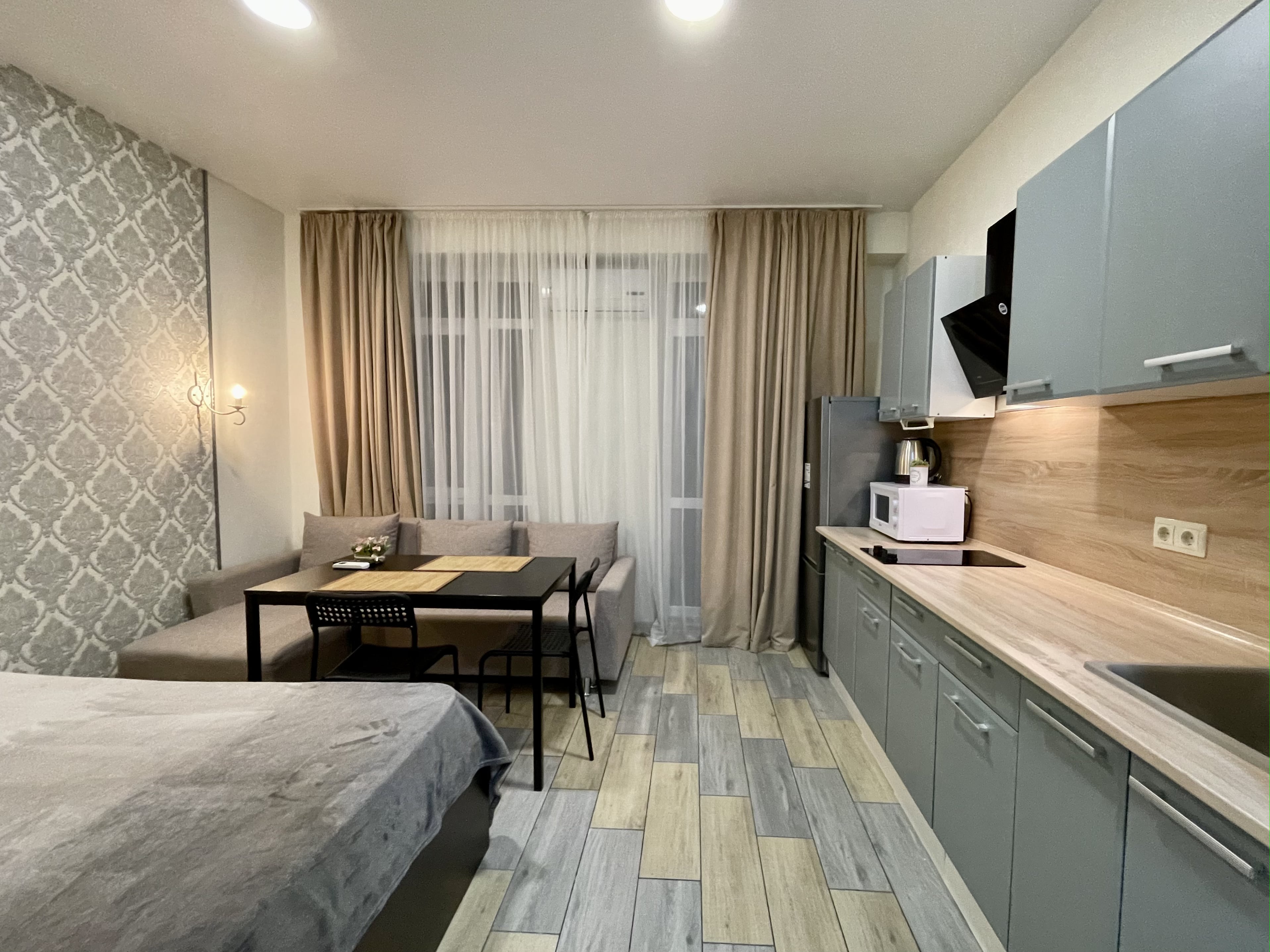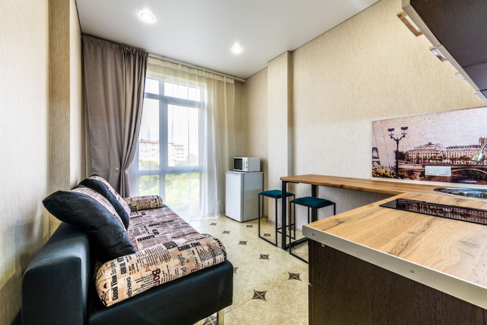 В номерах стильный лаконичный интерьер, есть вся необходимая техника. Помимо кухонной техники, в апартаментах есть плазменный телевизор, фен, кондиционер и стиральная машина. Некоторые номера оборудованы балконами, откуда открываются красивые виды на море.Для гостей, приезжающих на машинах, доступна охраняемая автостоянка, также на всей территории подключен высокоскоростной беспроводной интернет.Всего в 300 метрах от отеля распложен городской пляж «Мандарин». На галечном побережье все предусмотрено для хорошего пляжного отдыха: есть раздевалки, теневые навесы, шезлонги, работает пункт проката пляжных аксессуаров, открыто кафе.