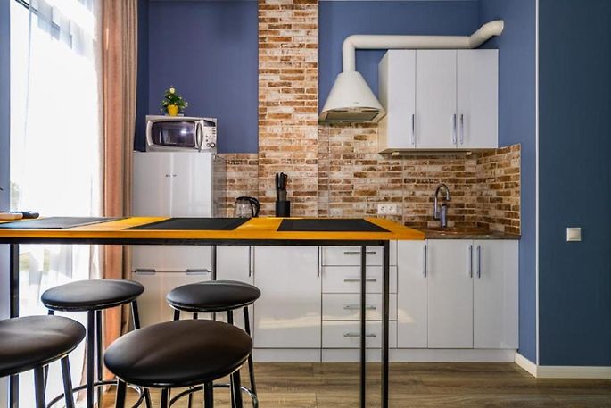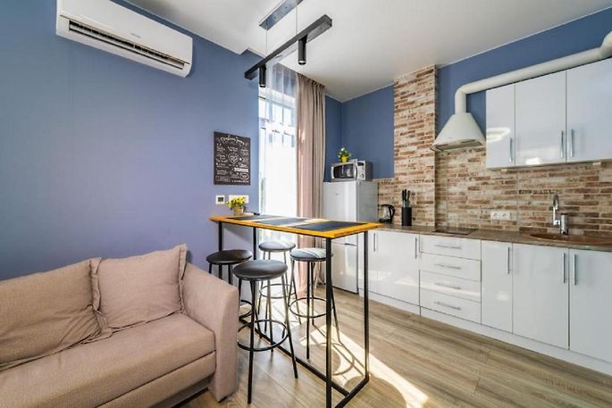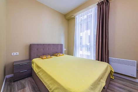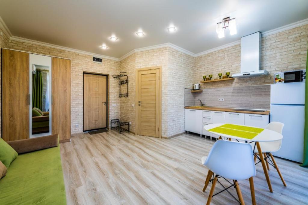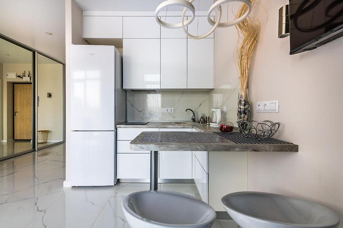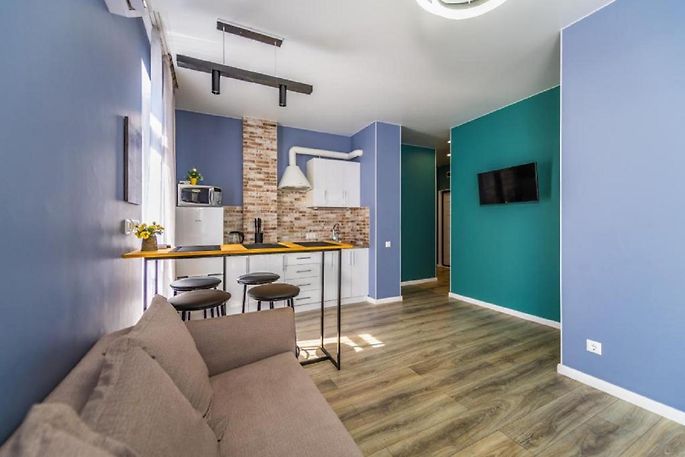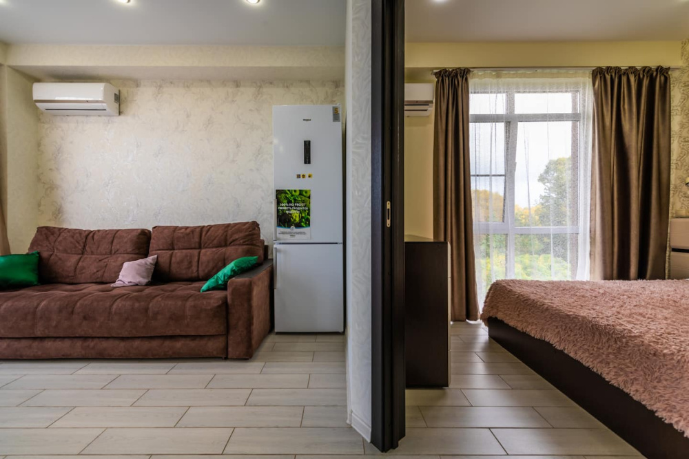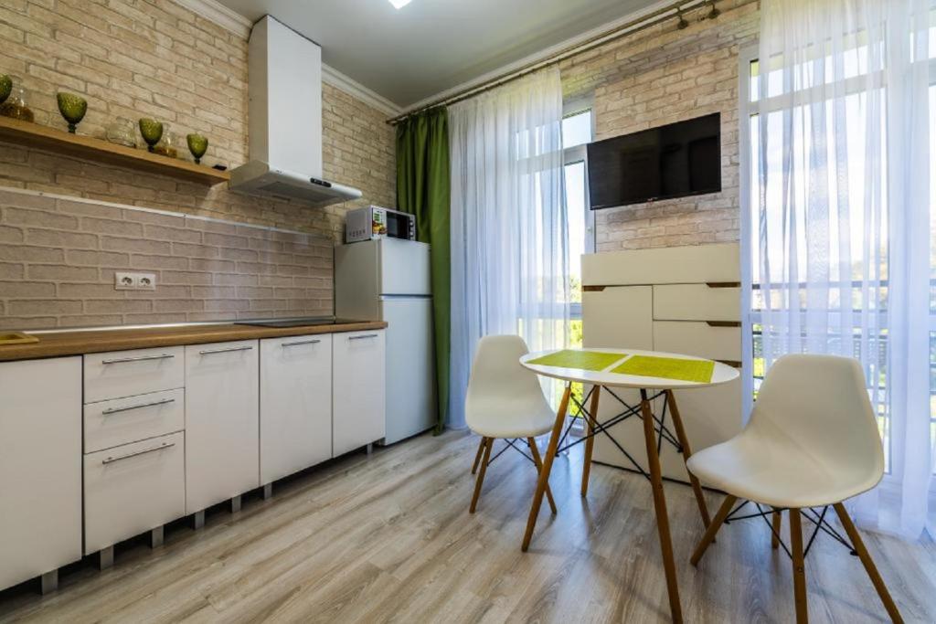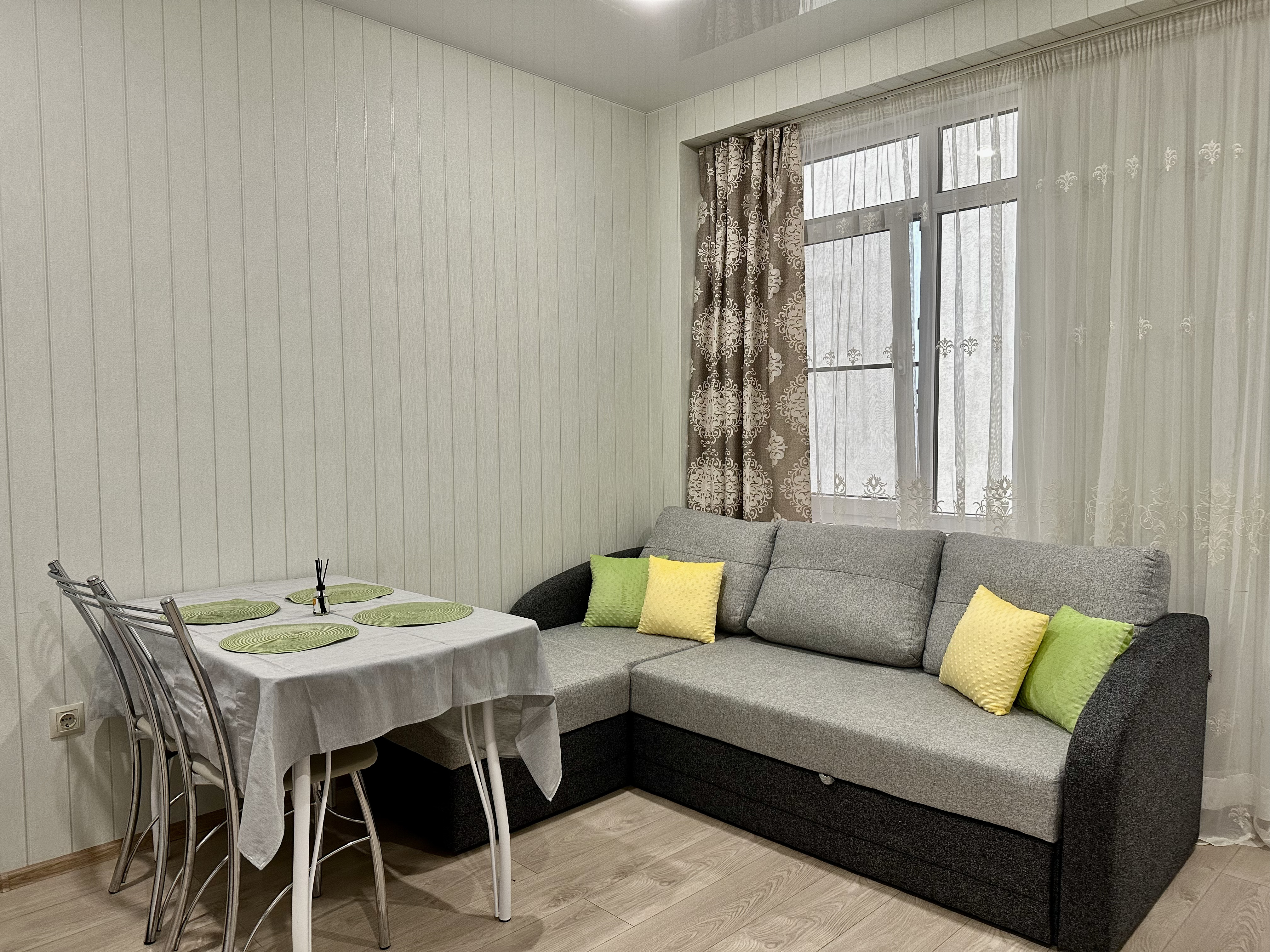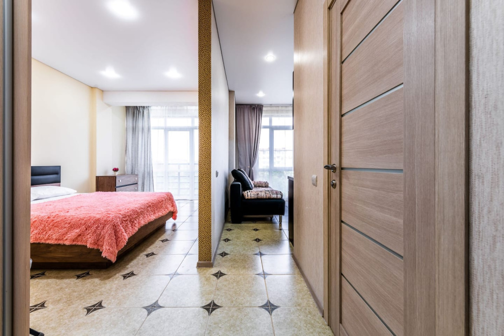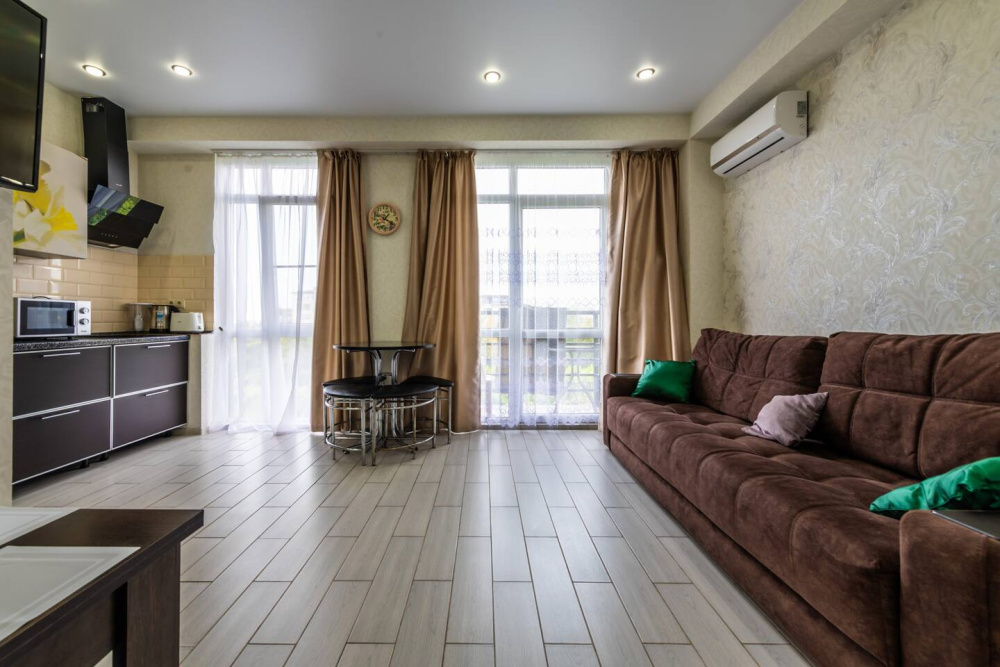 В номерах стильный лаконичный интерьер, есть вся необходимая техника. Помимо кухонной техники, в апартаментах есть плазменный телевизор, фен, кондиционер и стиральная машина. Некоторые номера оборудованы балконами, откуда открываются красивые виды на море.Для гостей, приезжающих на машинах, доступна охраняемая автостоянка, также на всей территории подключен высокоскоростной беспроводной интернет.Всего в 300 метрах от отеля распложен городской пляж «Мандарин». На галечном побережье все предусмотрено для хорошего пляжного отдыха: есть раздевалки, теневые навесы, шезлонги, работает пункт проката пляжных аксессуаров, открыто кафе.