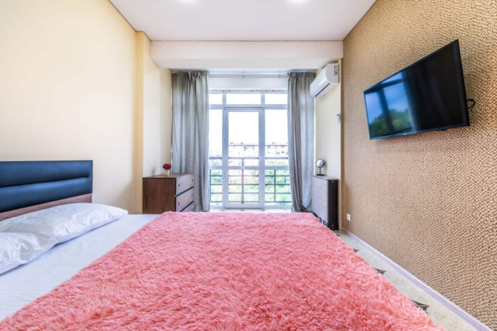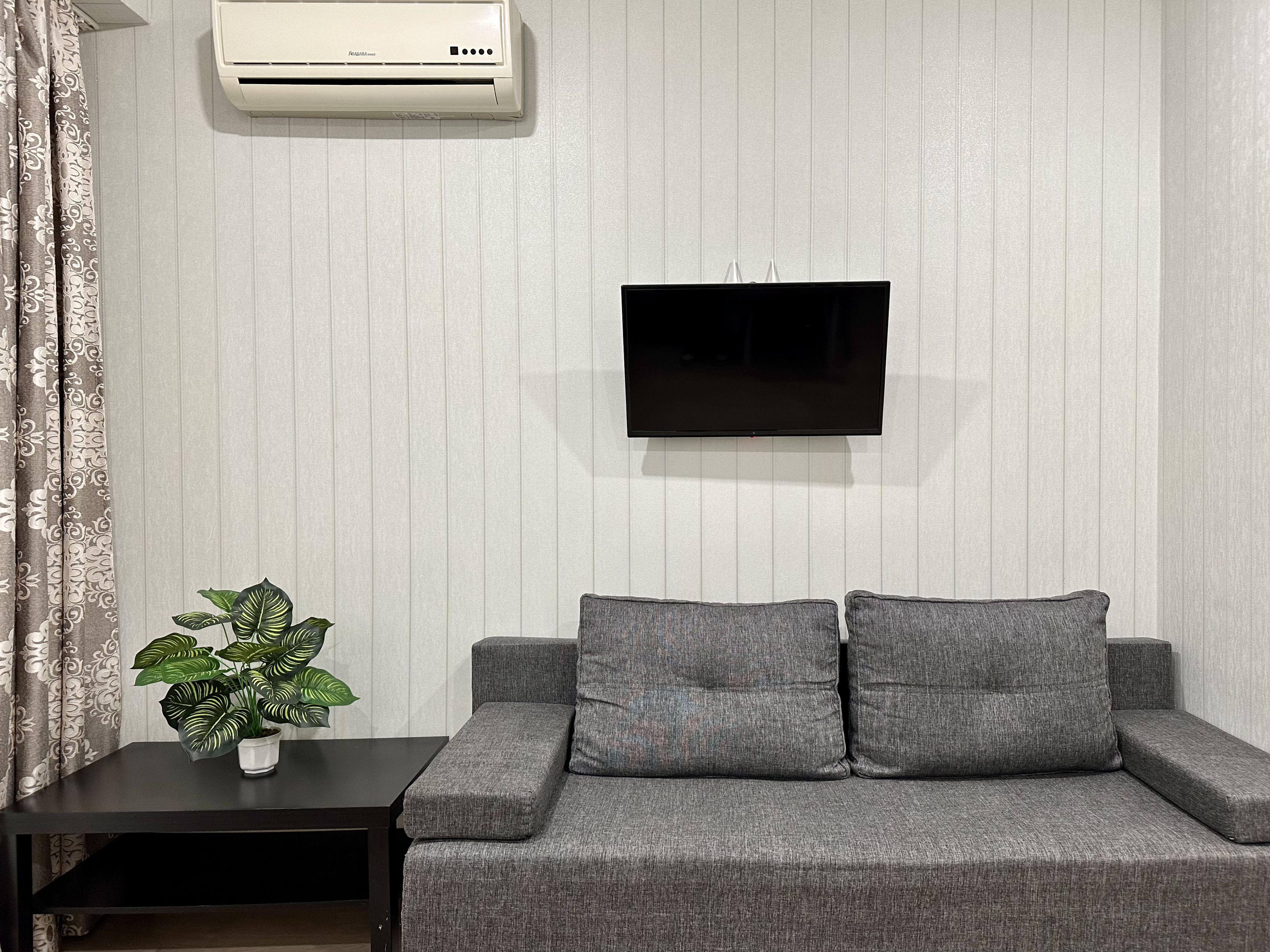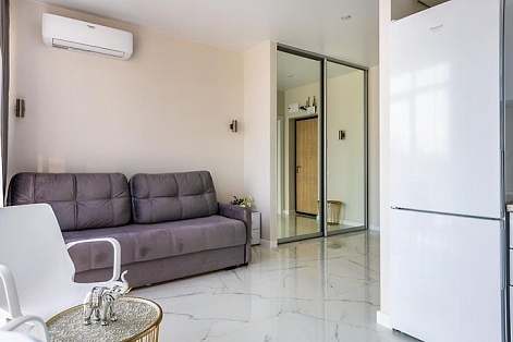 В номере: вешалка, диван раскладной, зеркало, стол, столик журнальный, стулья, шкаф-купе, кондиционер, микроволновая печь, набор посуды, плита электрическая, стиральная машина, телевизор ЖК, холодильник, чайный набор посуды, электрочайник