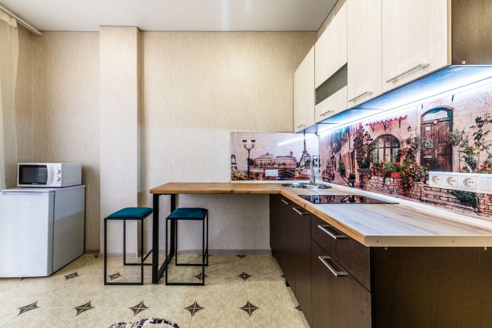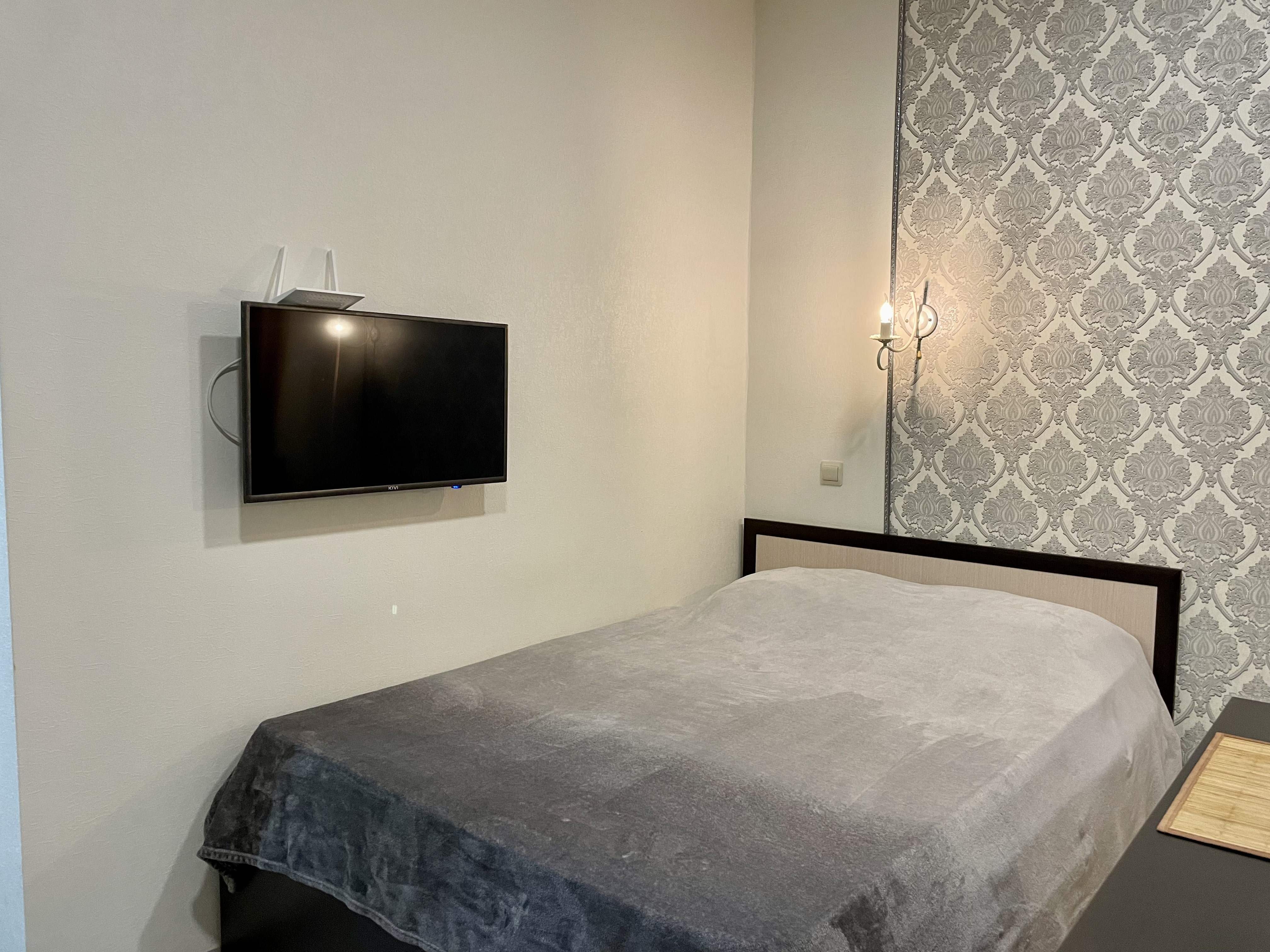 В номере: диван раскладной, зеркало, кровать двуспальная, стол, стулья, шкаф-купе, кондиционер, микроволновая печь, набор посуды, плита электрическая, стиральная машина, телевизор, холодильник, чайный набор посуды, электрочайник