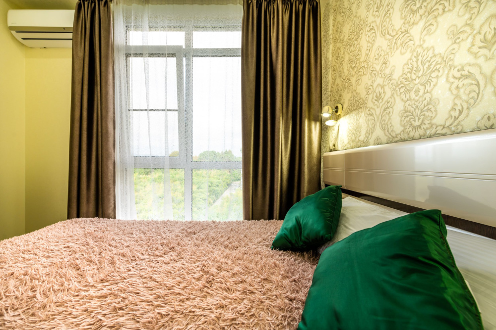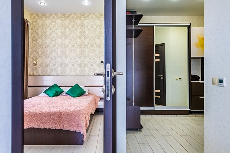 В номере: диван раскладной, зеркало, комод, кровать двуспальная, прикроватные тумбочки, стол, столик журнальный, стулья, шкаф-купе, кондиционер, микроволновая печь, набор посуды, плита электрическая, стиральная машина, телевизор ЖК, холодильник, чайный набор посуды, электрочайник