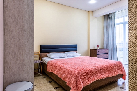 В номере: вешалка, диван раскладной, зеркало, прикроватные тумбочки, стол, столик журнальный, стулья, шкаф-купе, кондиционер, микроволновая печь, плита электрическая, стиральная машина, телевизор ЖК, холодильник, чайный набор посуды, электрочайник