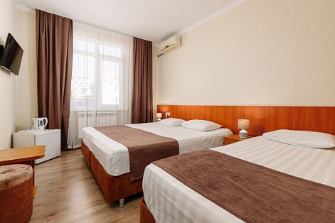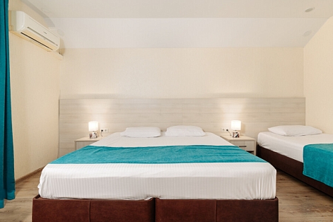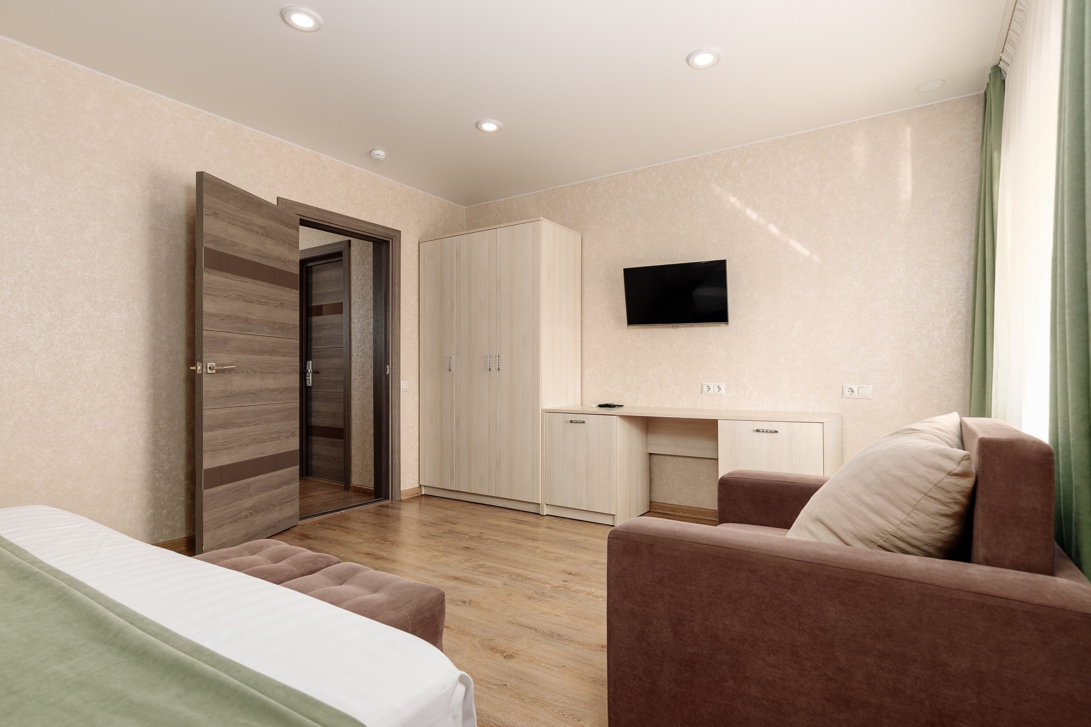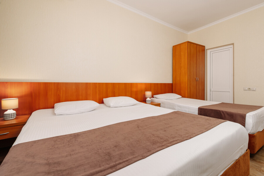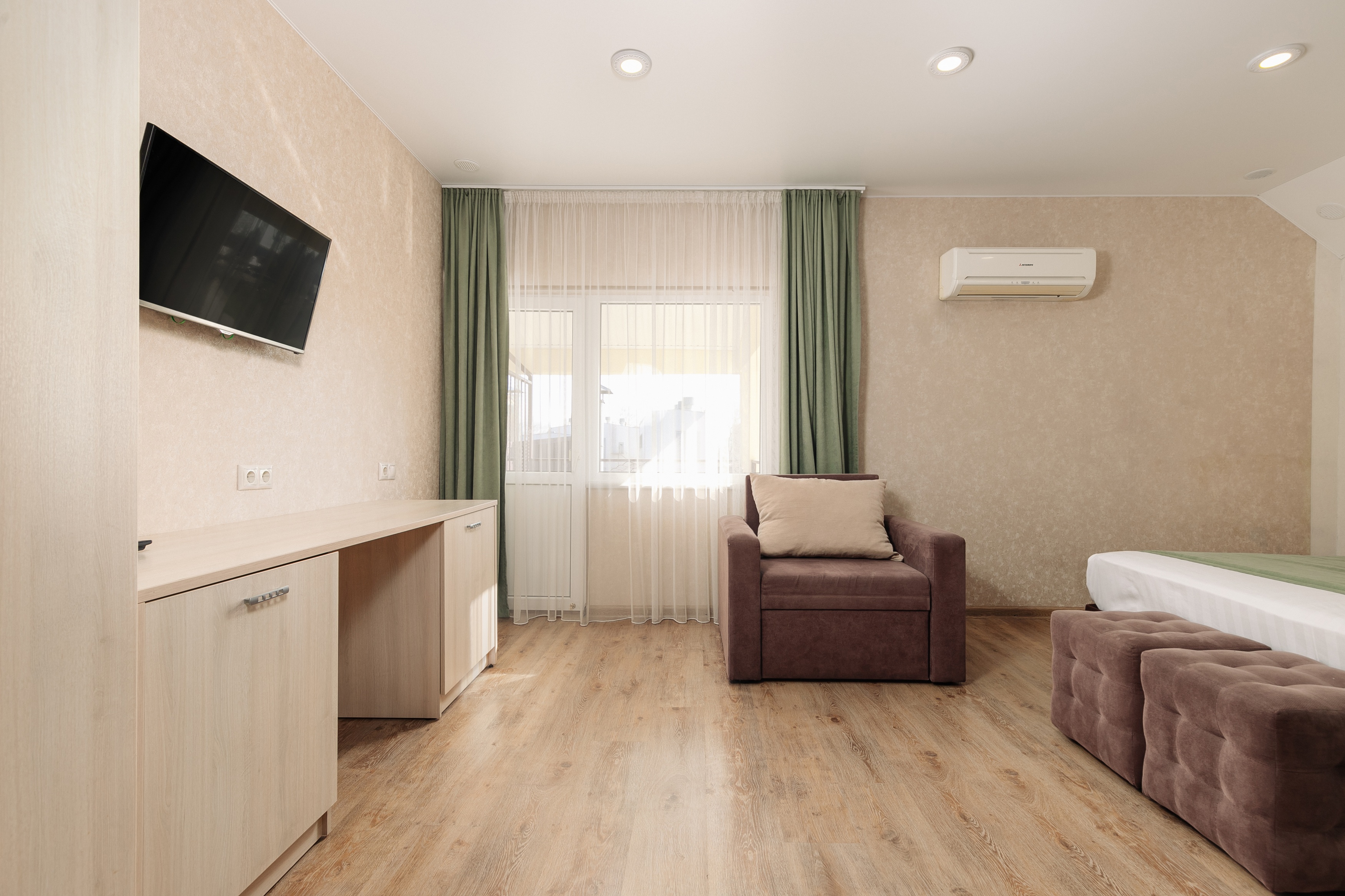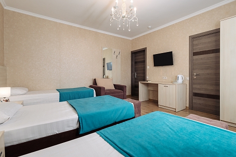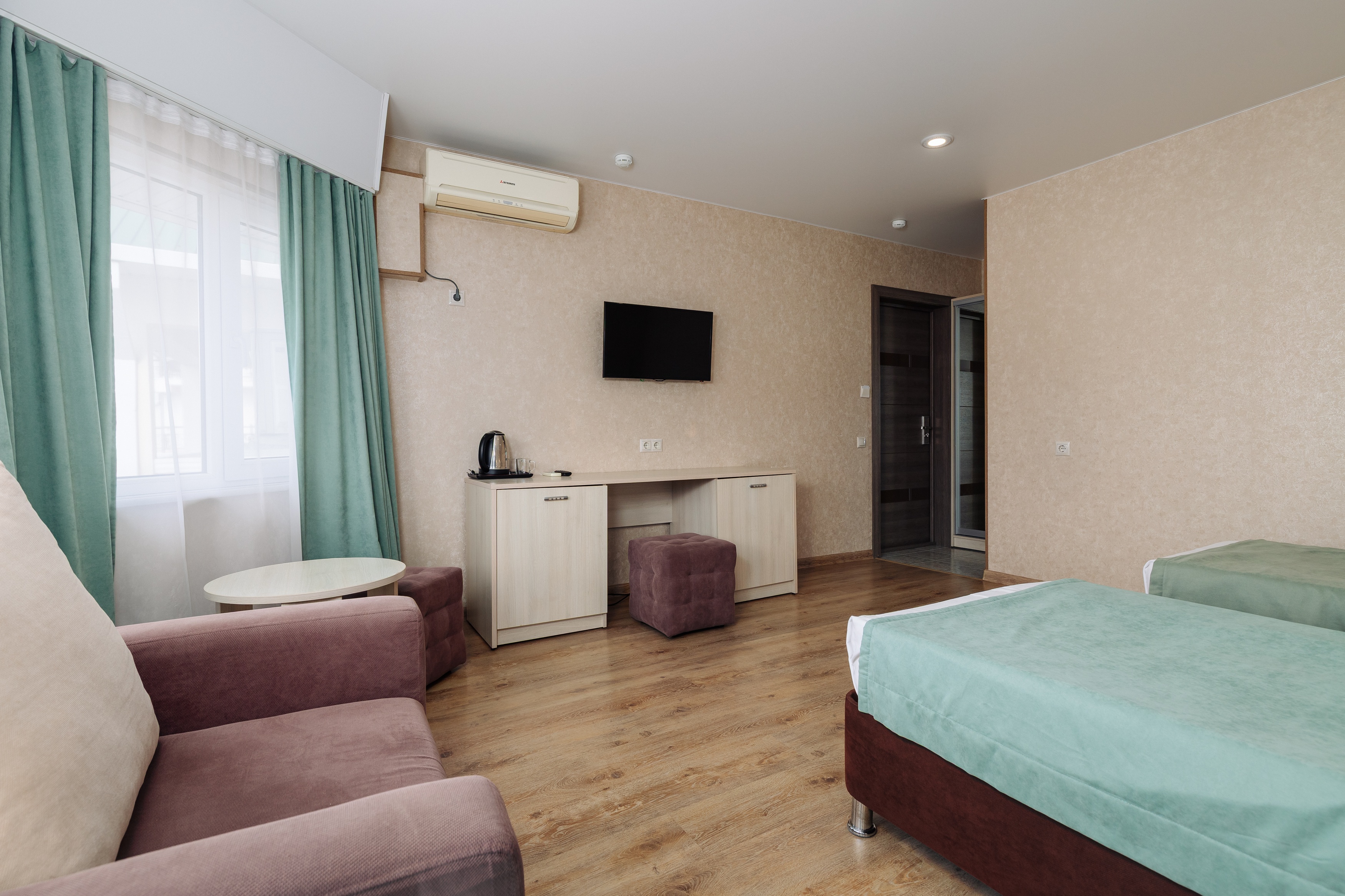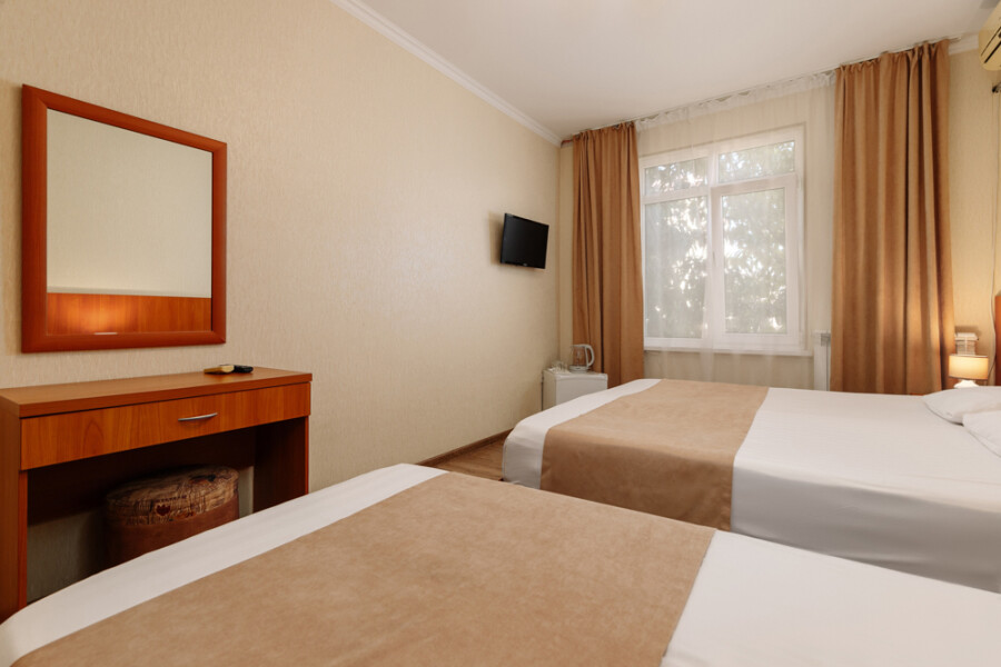 В номере: зеркало, кресло-кровать, кровать двуспальная, кровать односпальная, стол, столик журнальный, стулья, шкаф, кондиционер, телевизор ЖК, холодильник, электрочайник