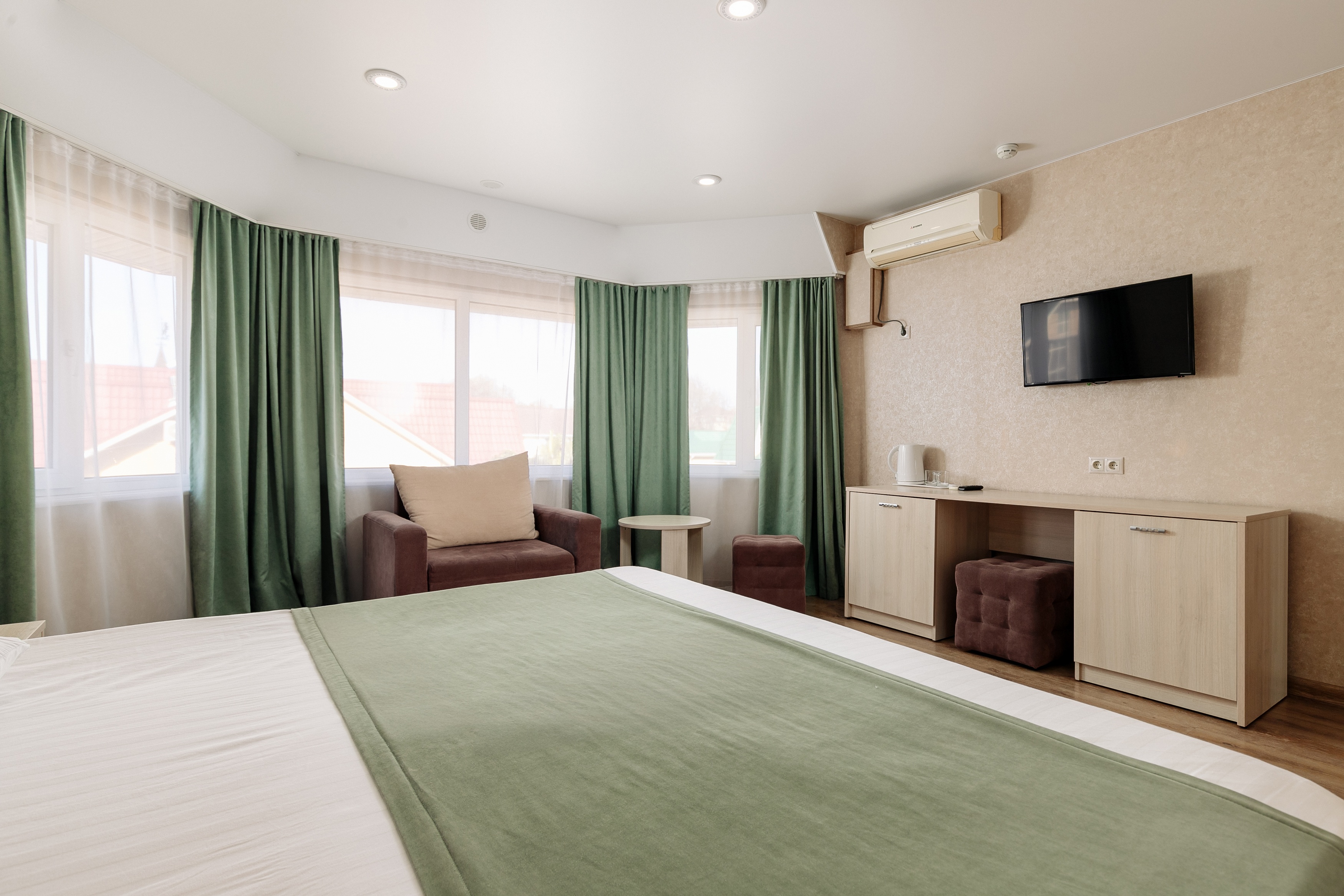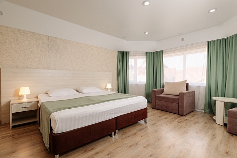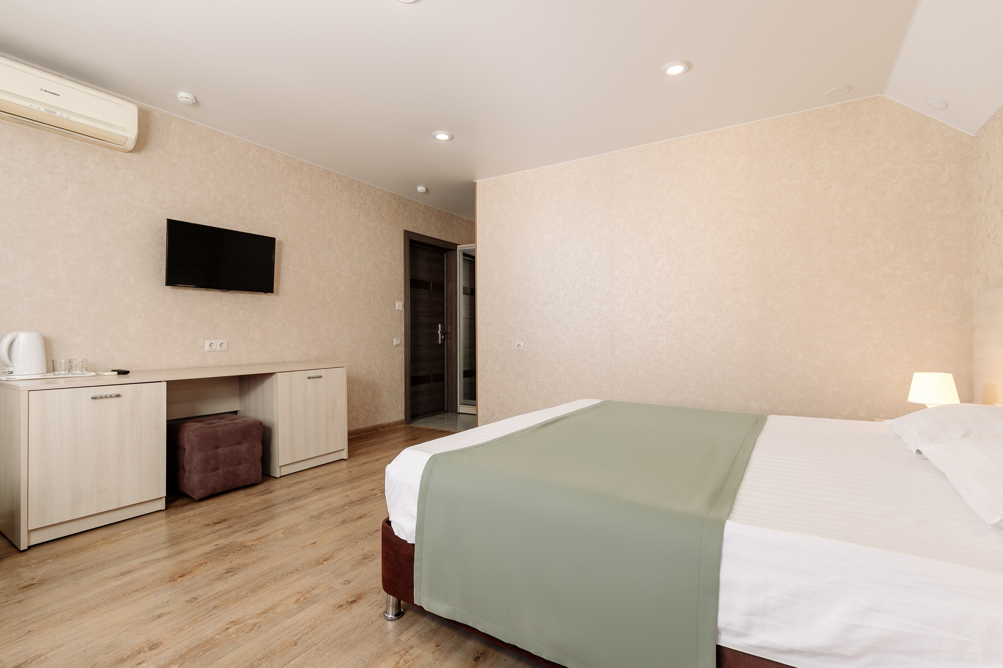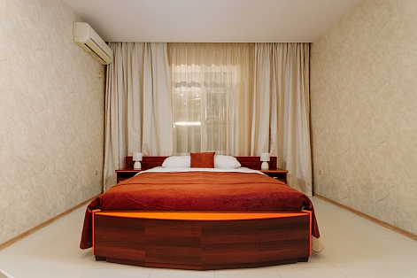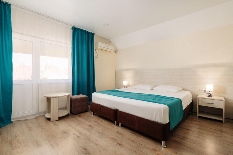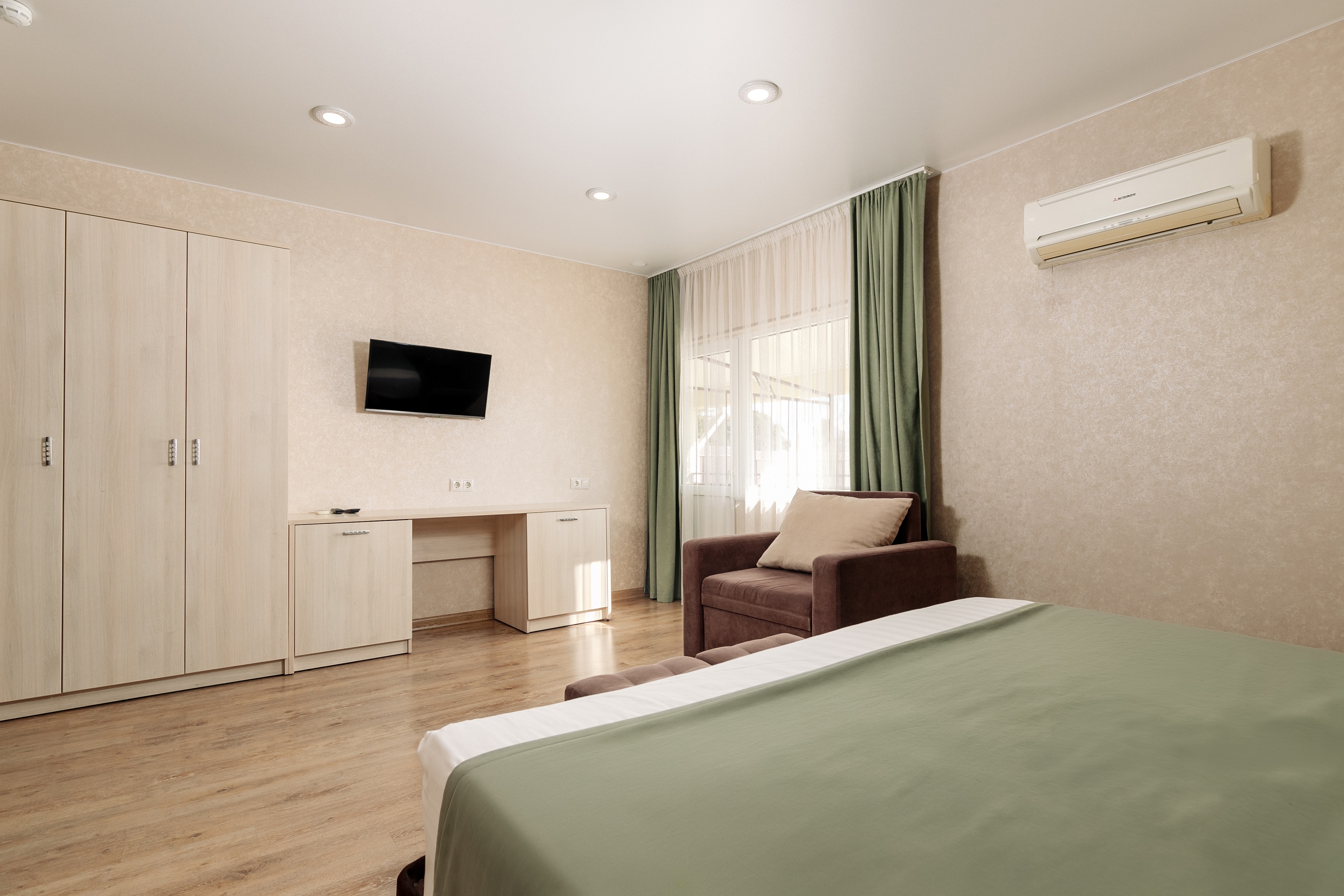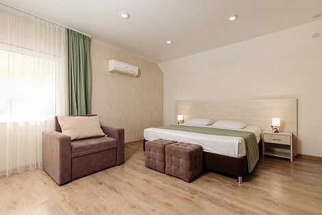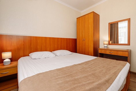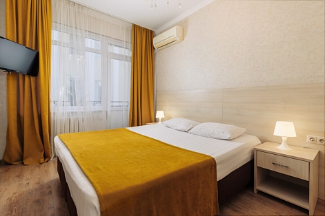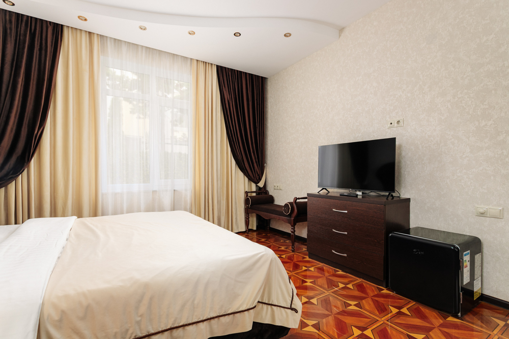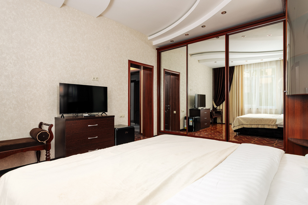 В номере: зеркало, кресло-кровать, кровать двуспальная, прикроватные тумбочки, стол, столик журнальный, стулья, шкаф, кондиционер, телевизор ЖК, холодильник, электрочайник