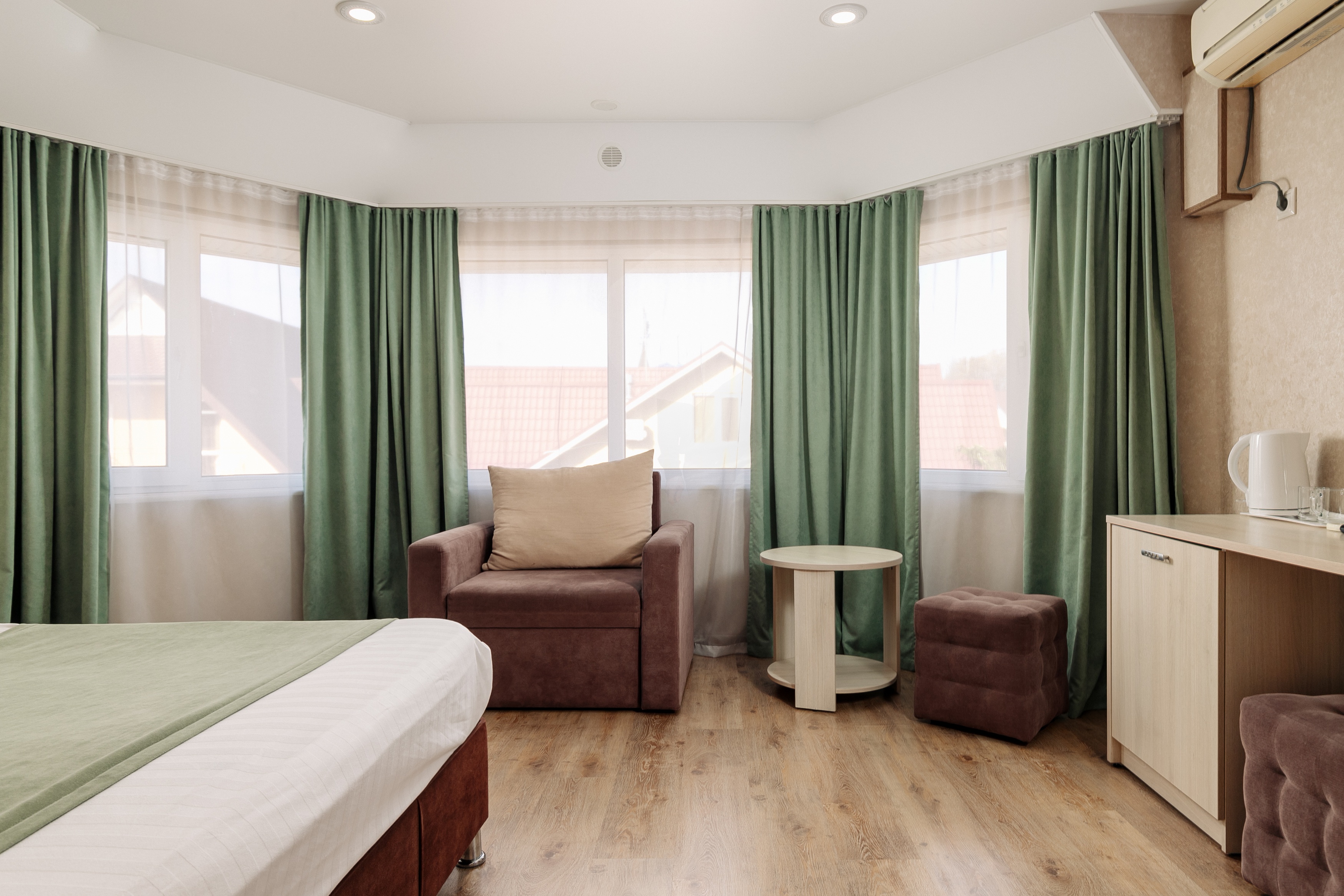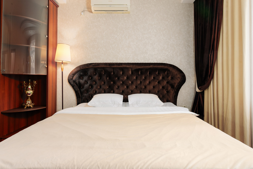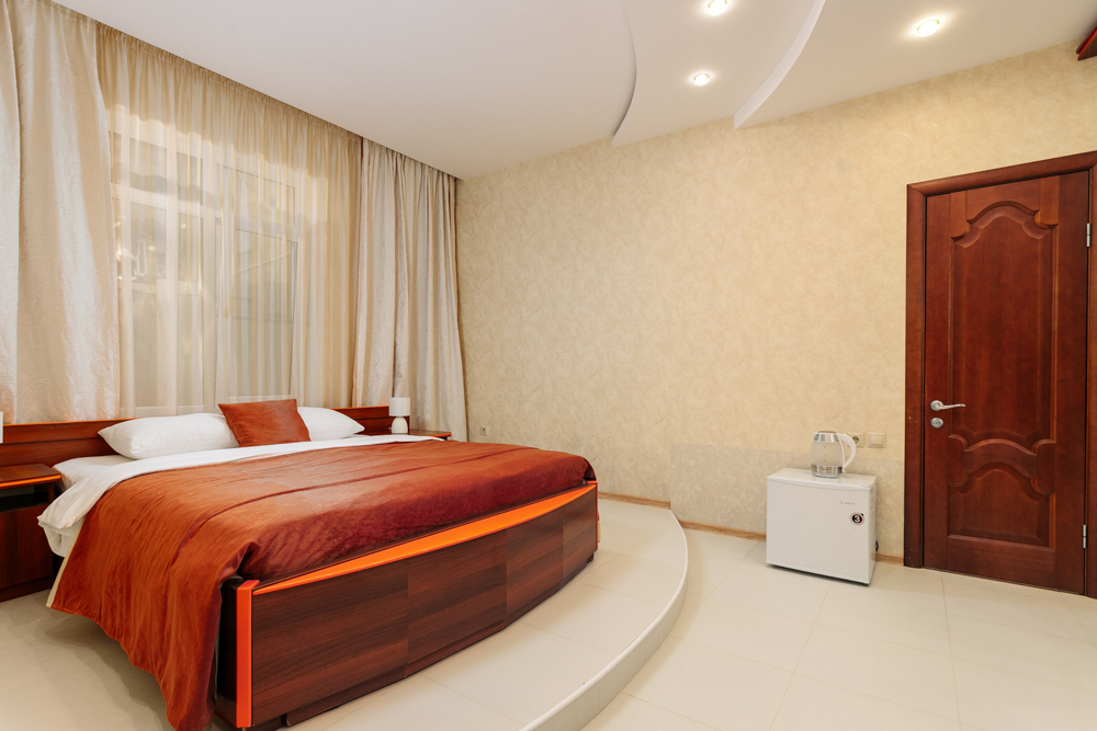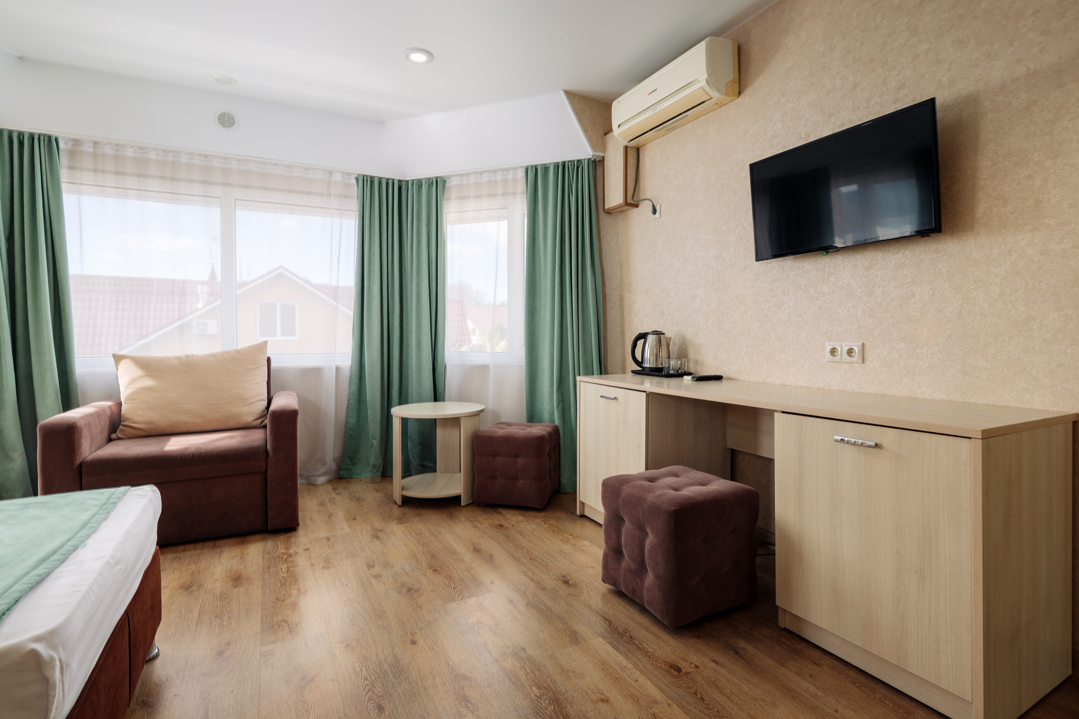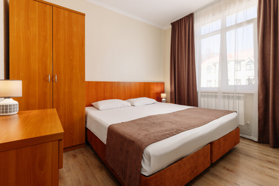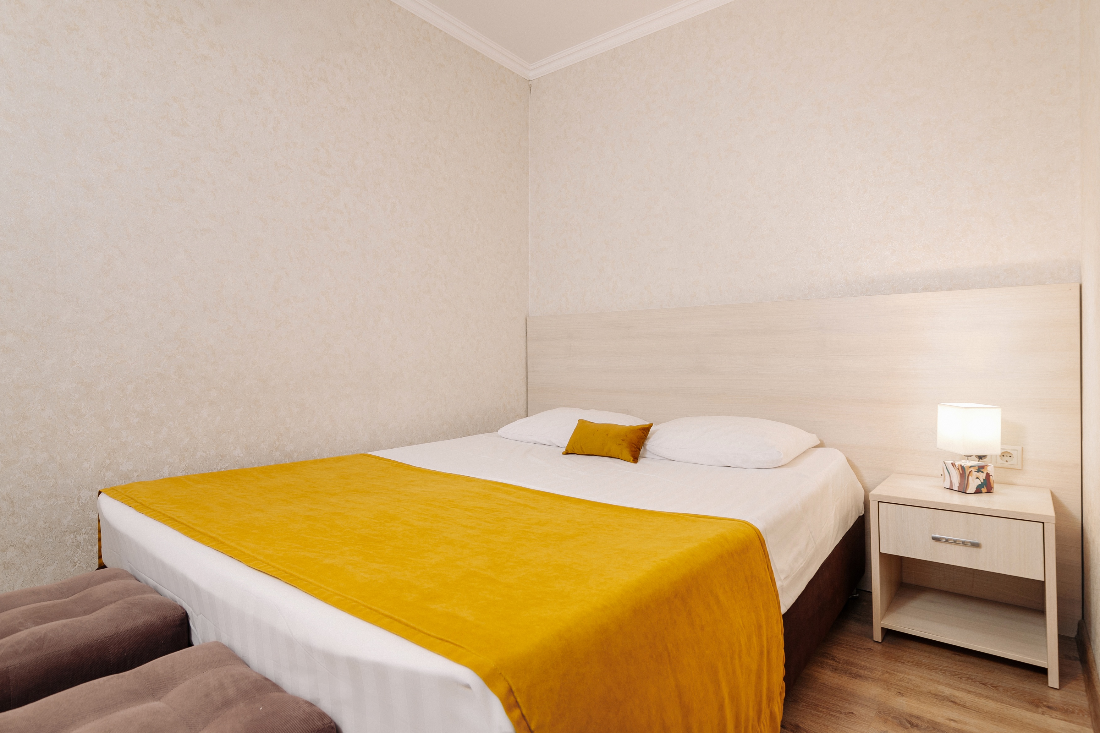 В номере: зеркало, кресло-кровать, кровать двуспальная, прикроватные тумбочки, стол, столик журнальный, стулья, шкаф, кондиционер, телевизор ЖК, холодильник, электрочайник