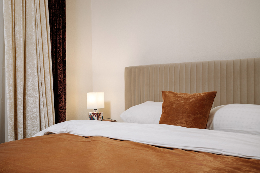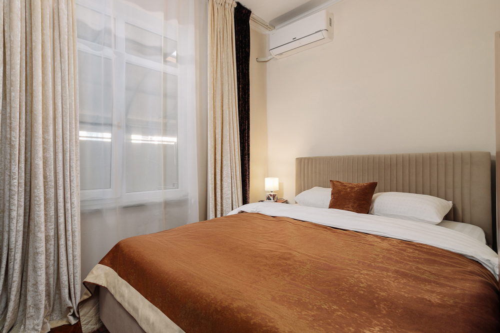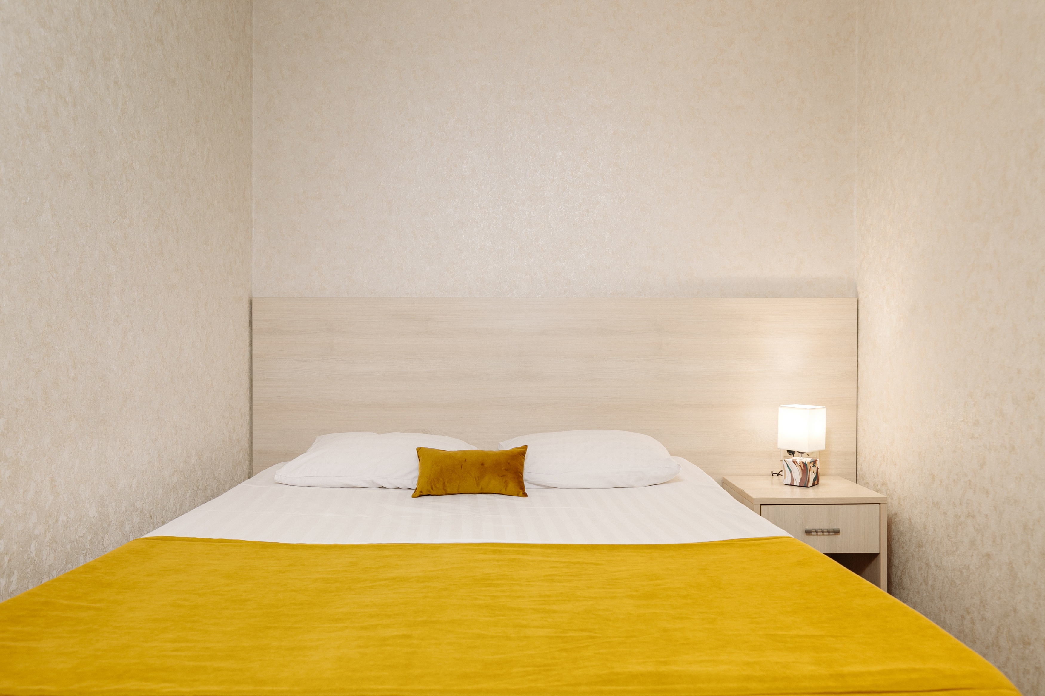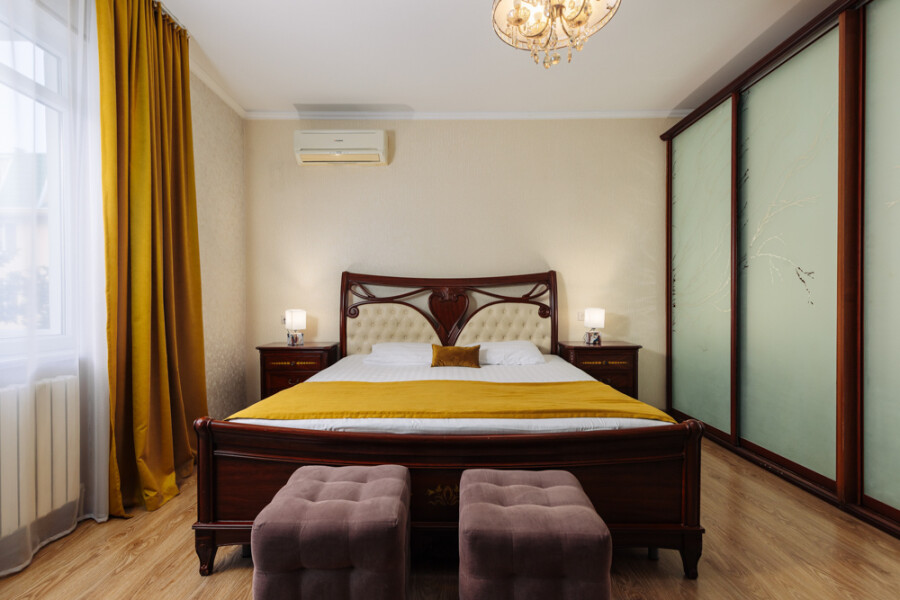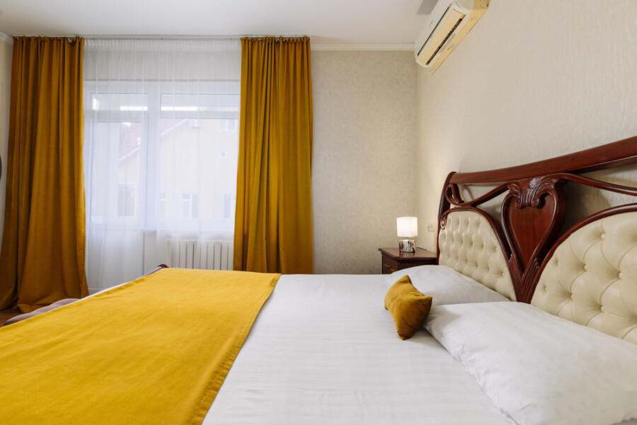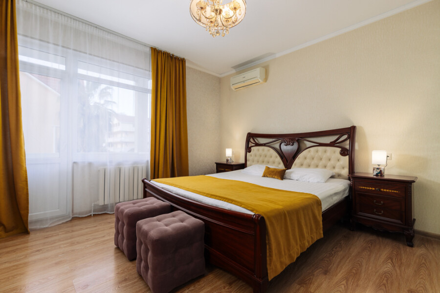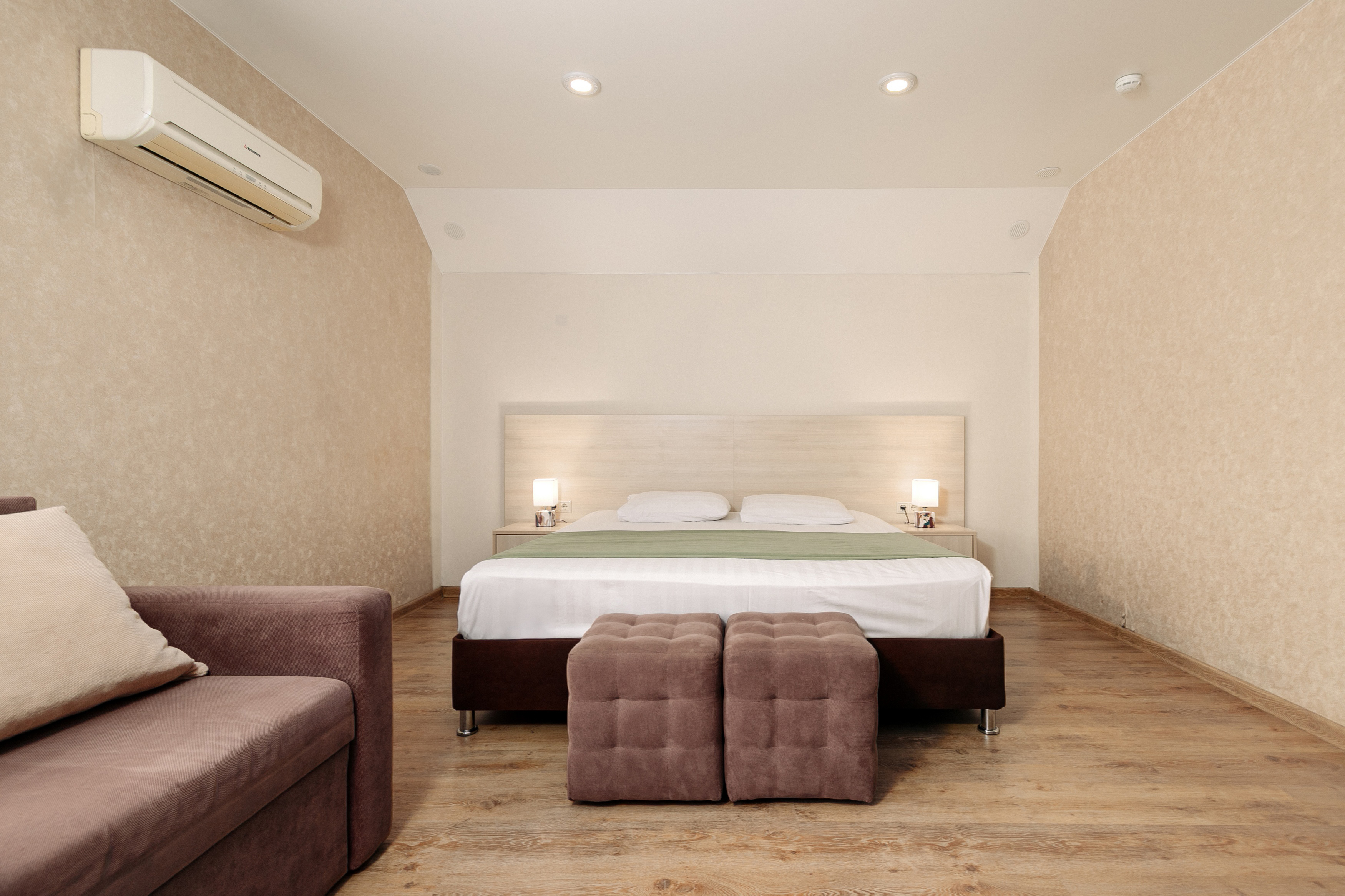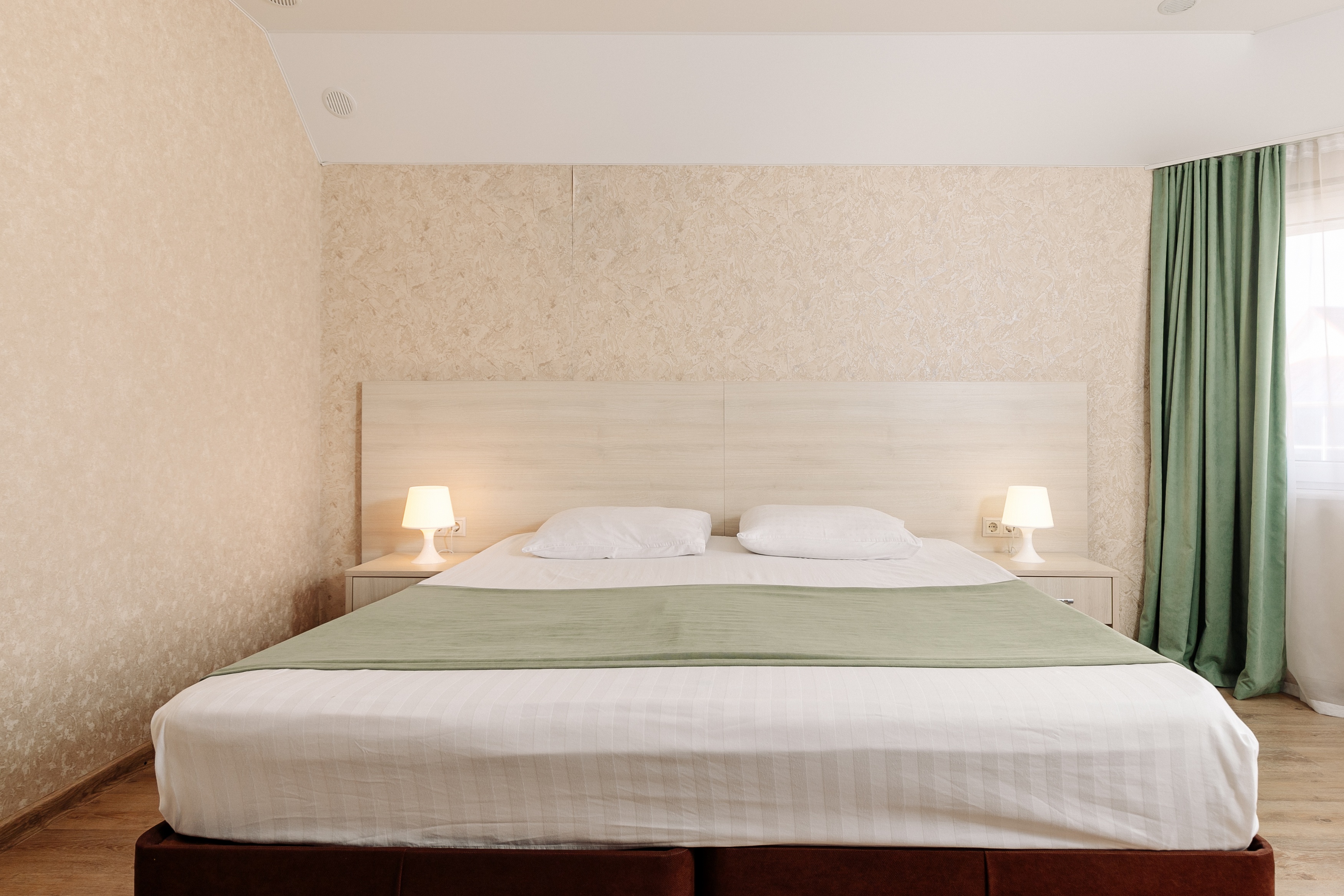 В номере: зеркало, кресло-кровать, кровать двуспальная, прикроватные тумбочки, стол, столик журнальный, стулья, шкаф, кондиционер, телевизор ЖК, холодильник, электрочайник