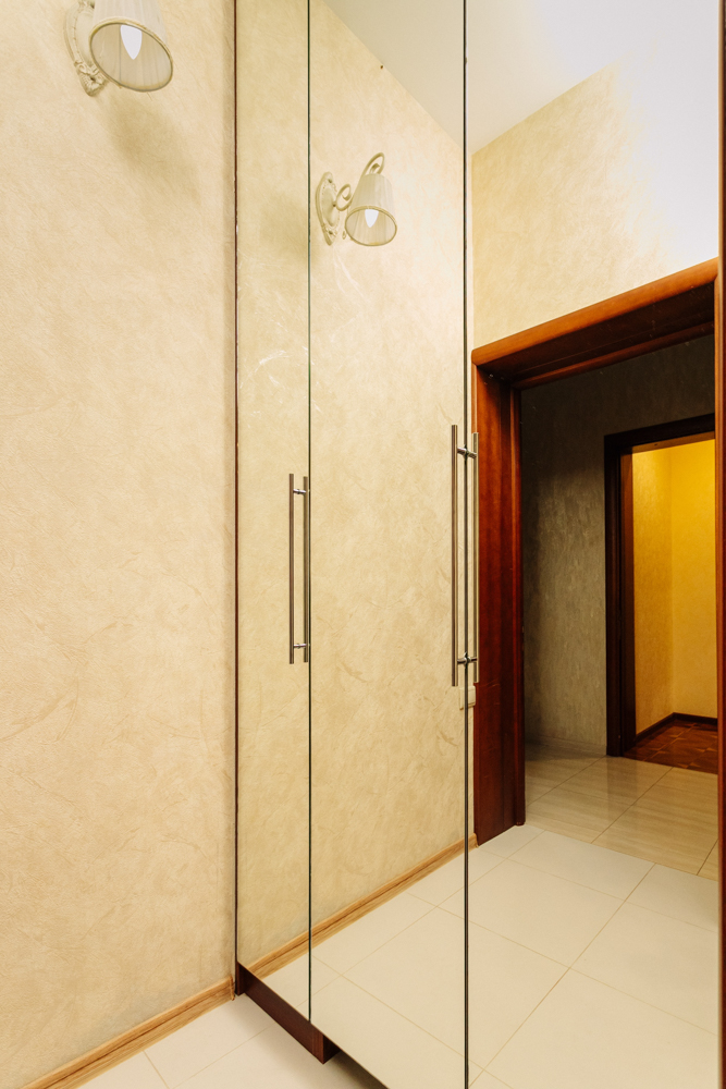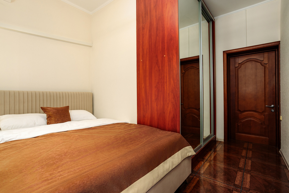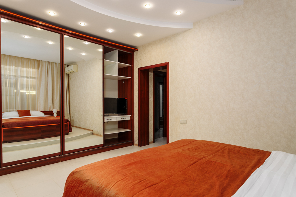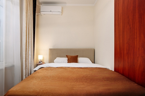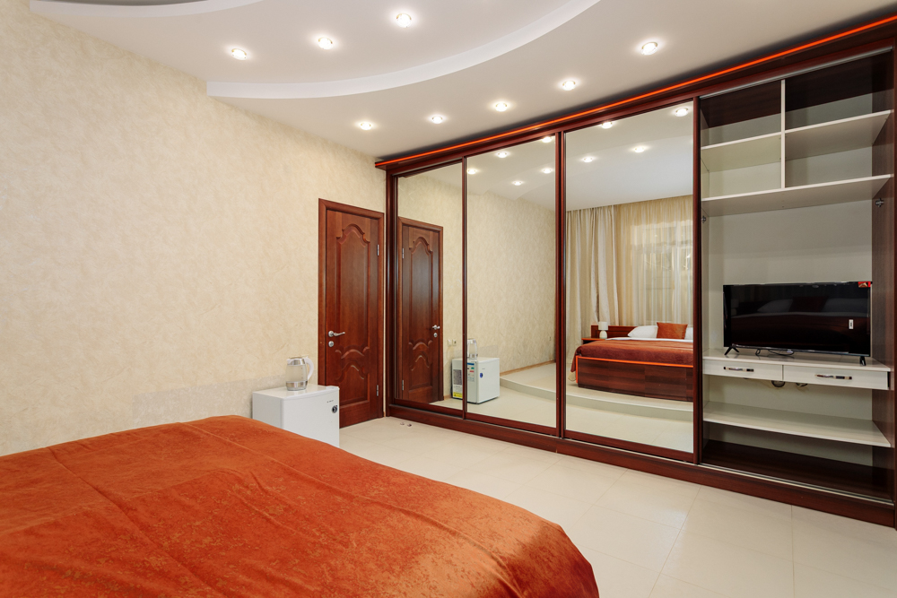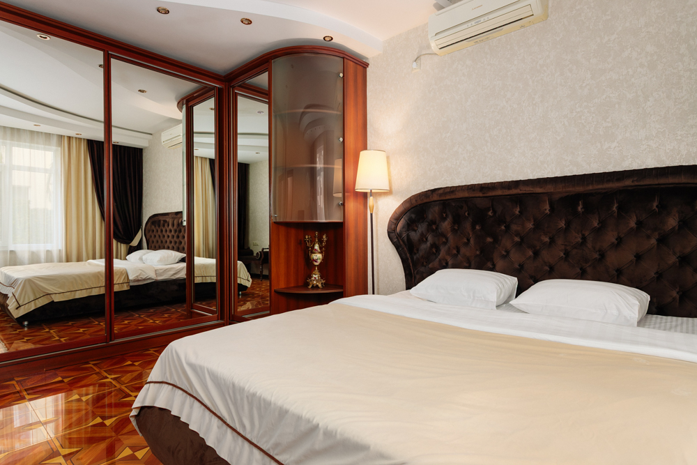 В номере: зеркало, кресло-кровать, кровать двуспальная, прикроватные тумбочки, стол, столик журнальный, стулья, шкаф-купе, кондиционер, телевизор ЖК, холодильник, электрочайник