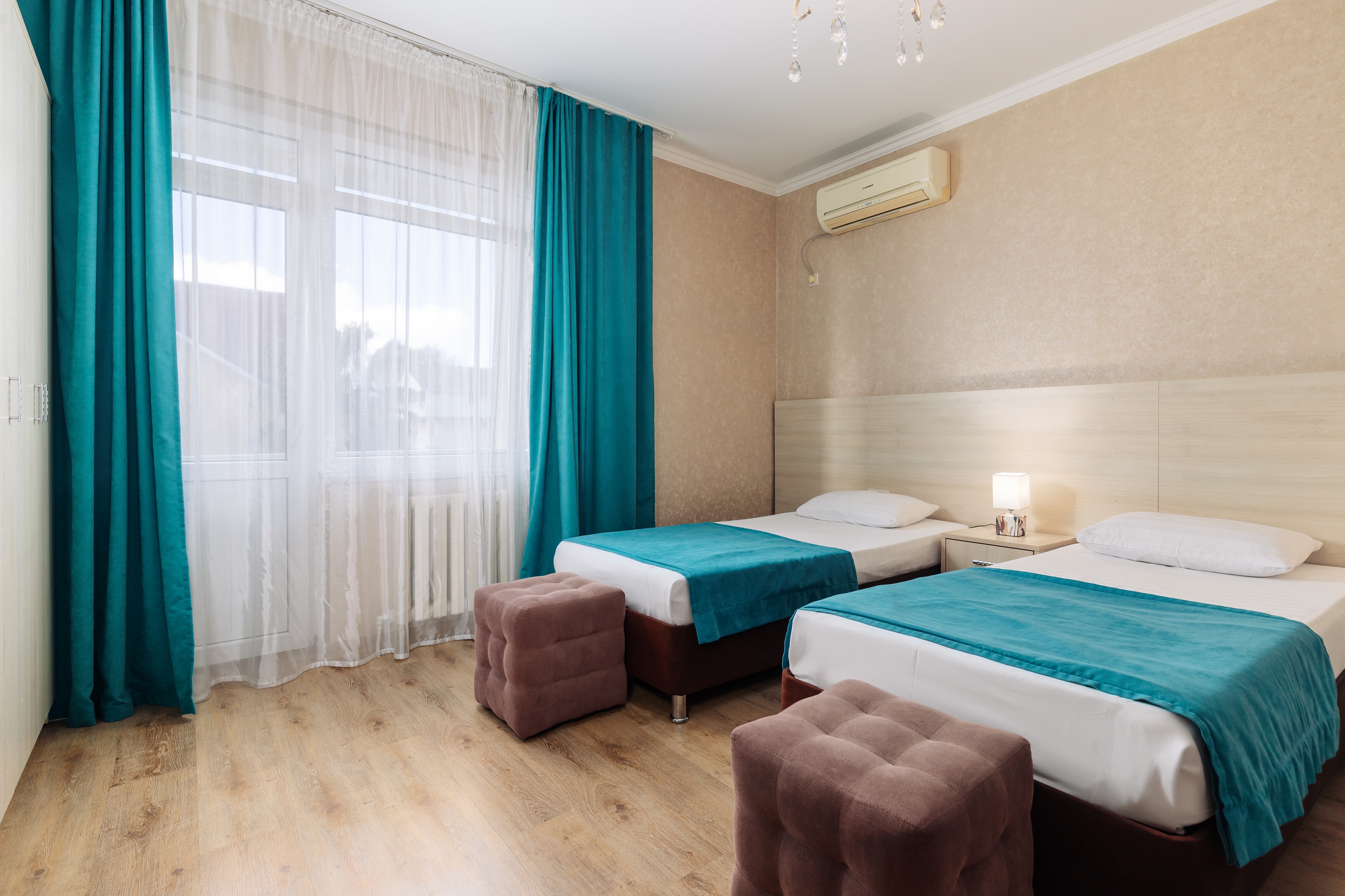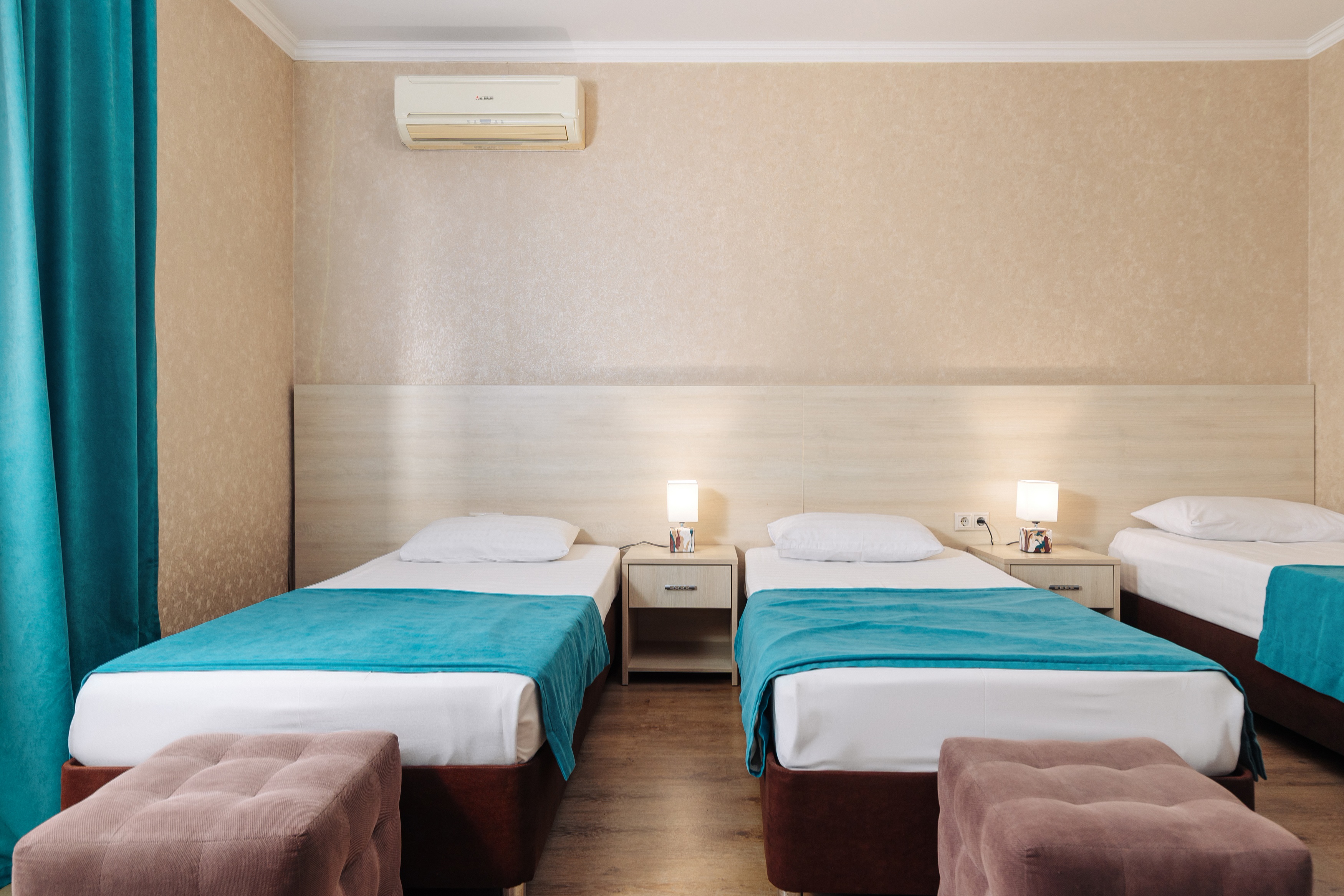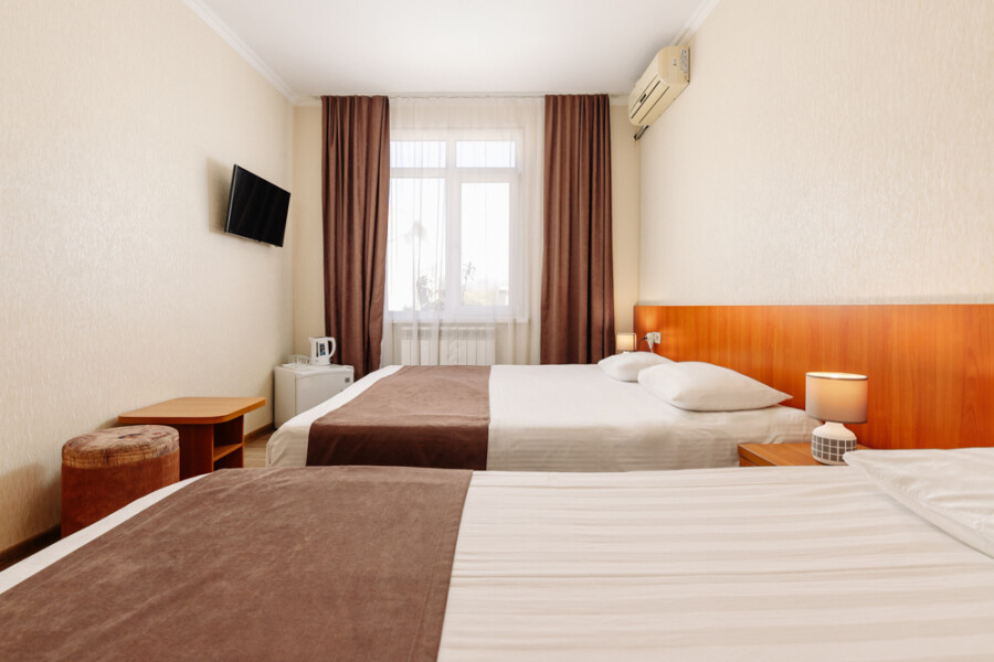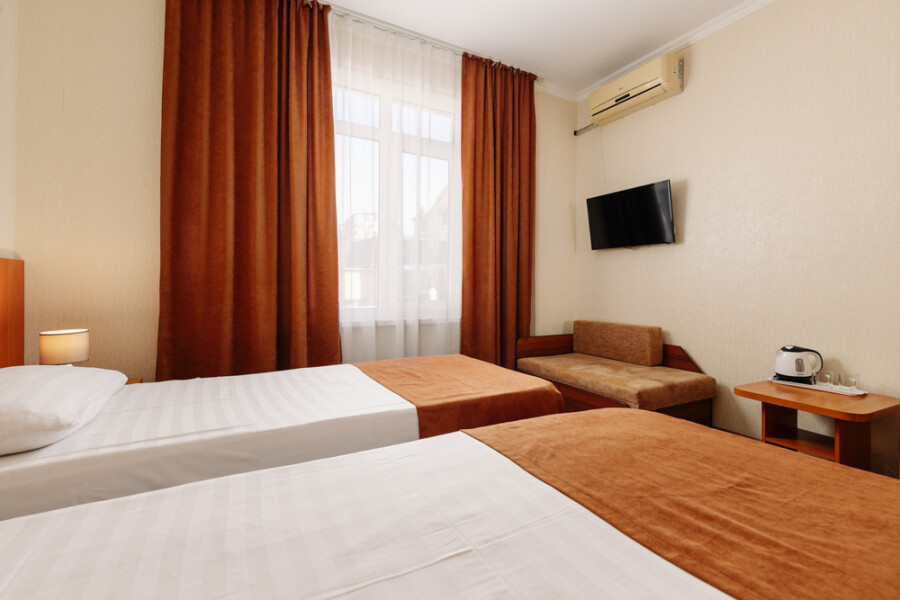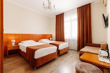В номере: зеркало, кресло-кровать, кровати односпальные, стол, столик журнальный, стулья, шкаф, кондиционер, телевизор ЖК, холодильник, электрочайник