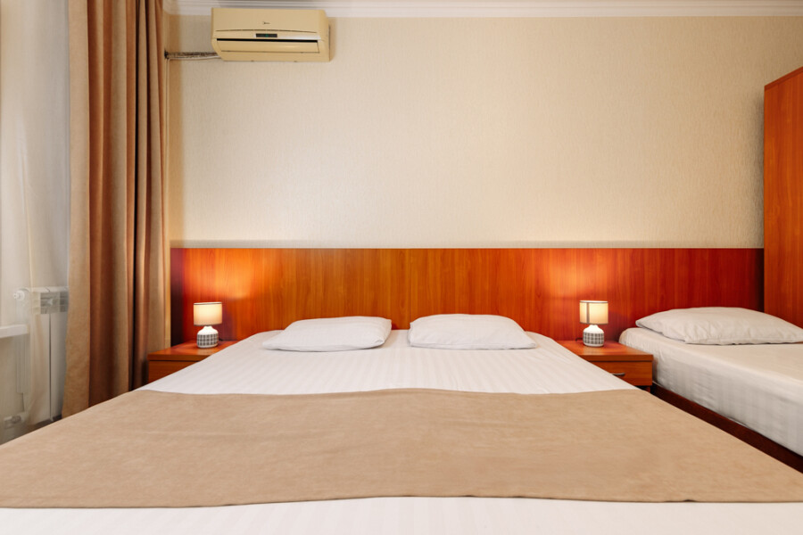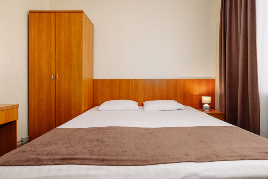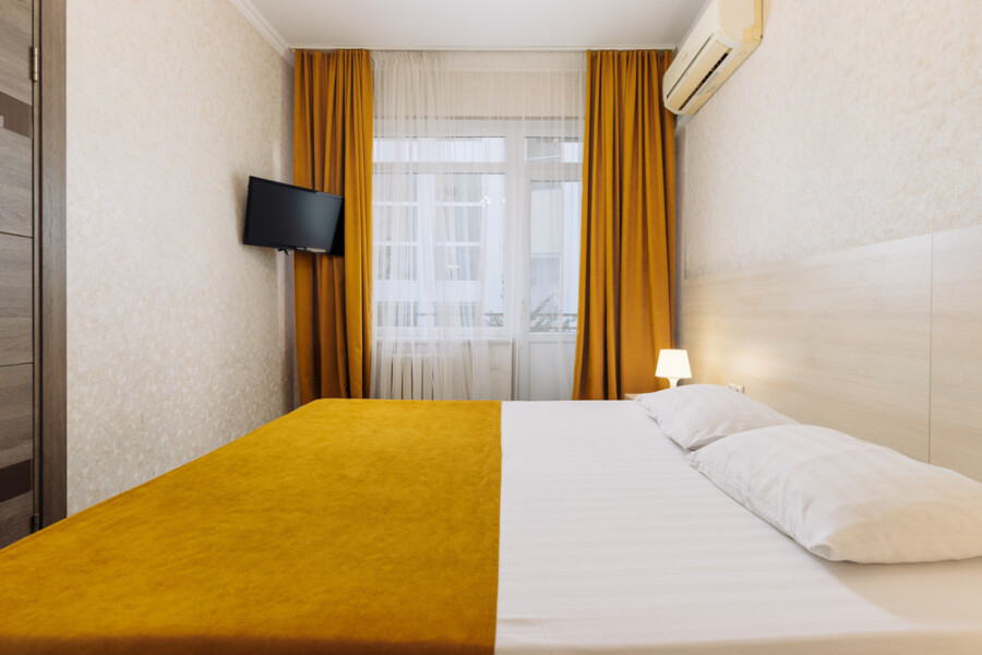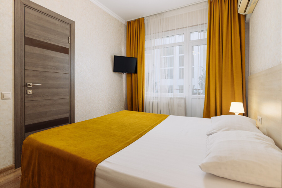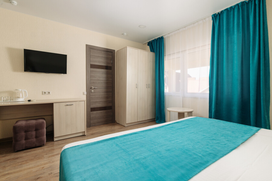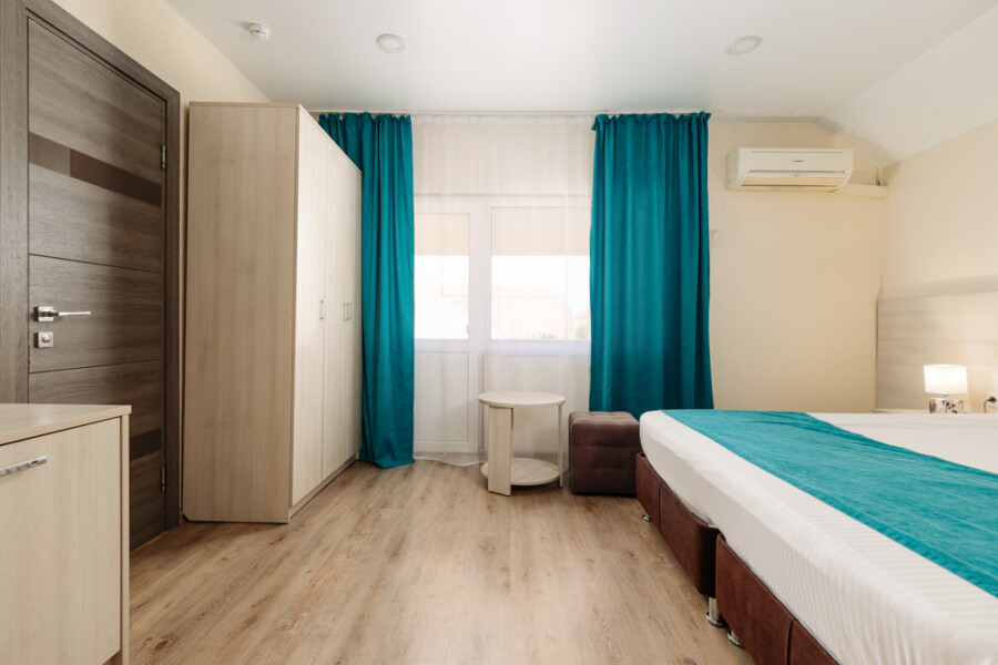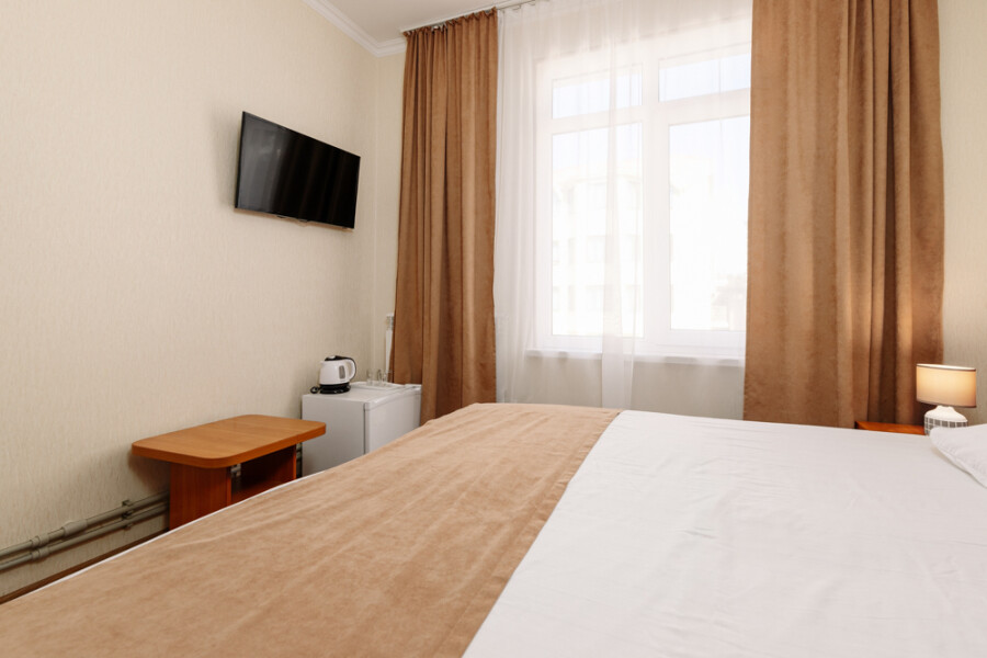 В номере: кровать двуспальная, прикроватные тумбочки, стол, стулья, шкаф, кондиционер, телевизор ЖК, холодильник, электрочайник