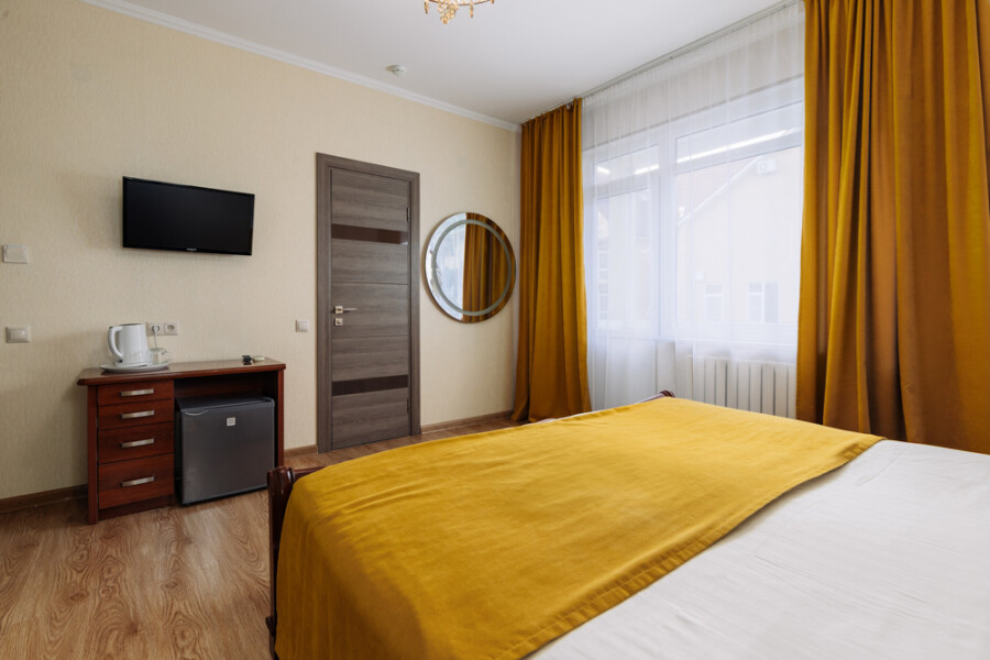 В номере: зеркало, кровать двуспальная, прикроватная тумбочка, стол, стулья, шкаф, кондиционер, телевизор ЖК, холодильник, электрочайник