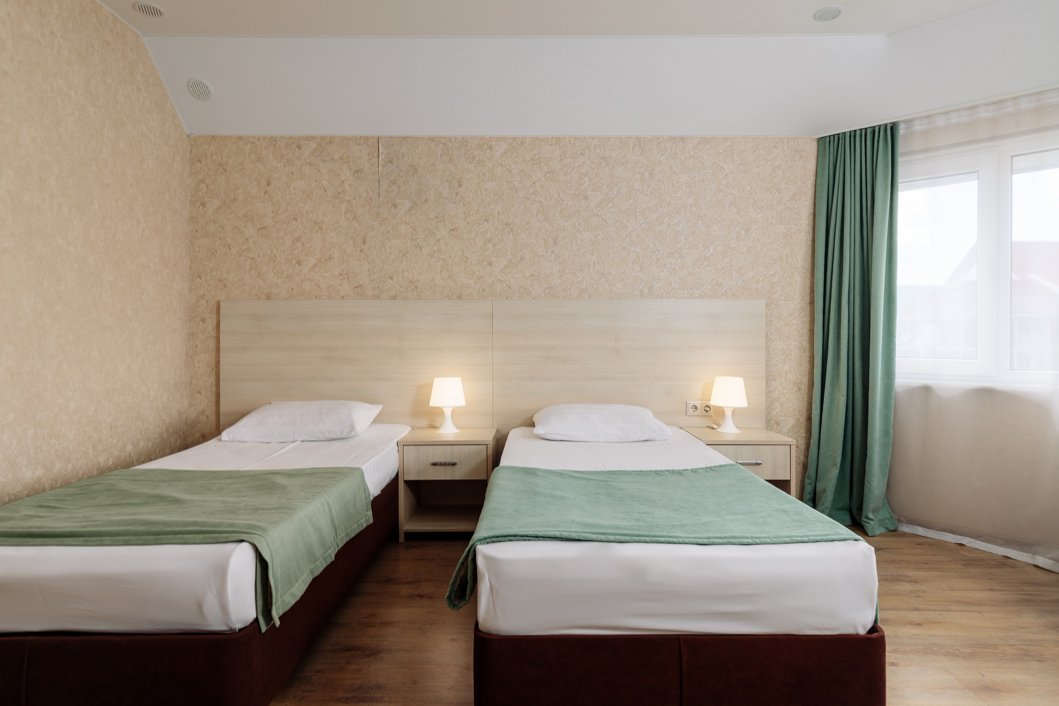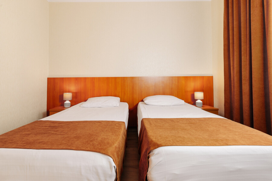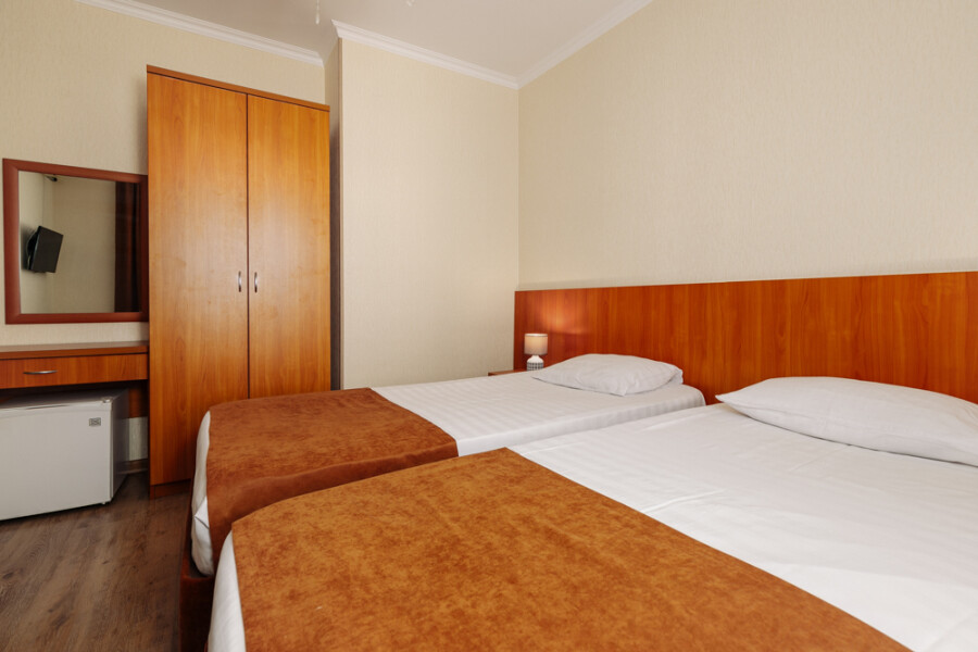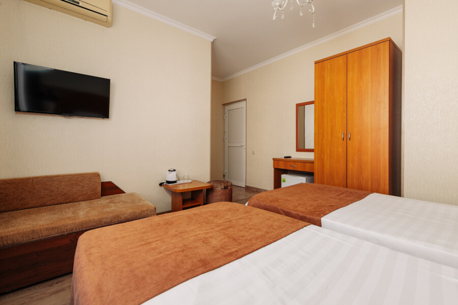 В номере: диван, зеркало, кровати односпальные, прикроватные тумбочки, стол, столик журнальный, стул, шкаф, кондиционер, телевизор ЖК, холодильник, электрочайник