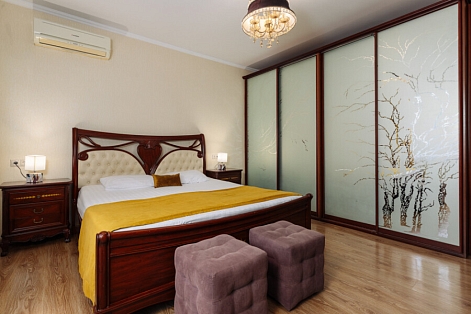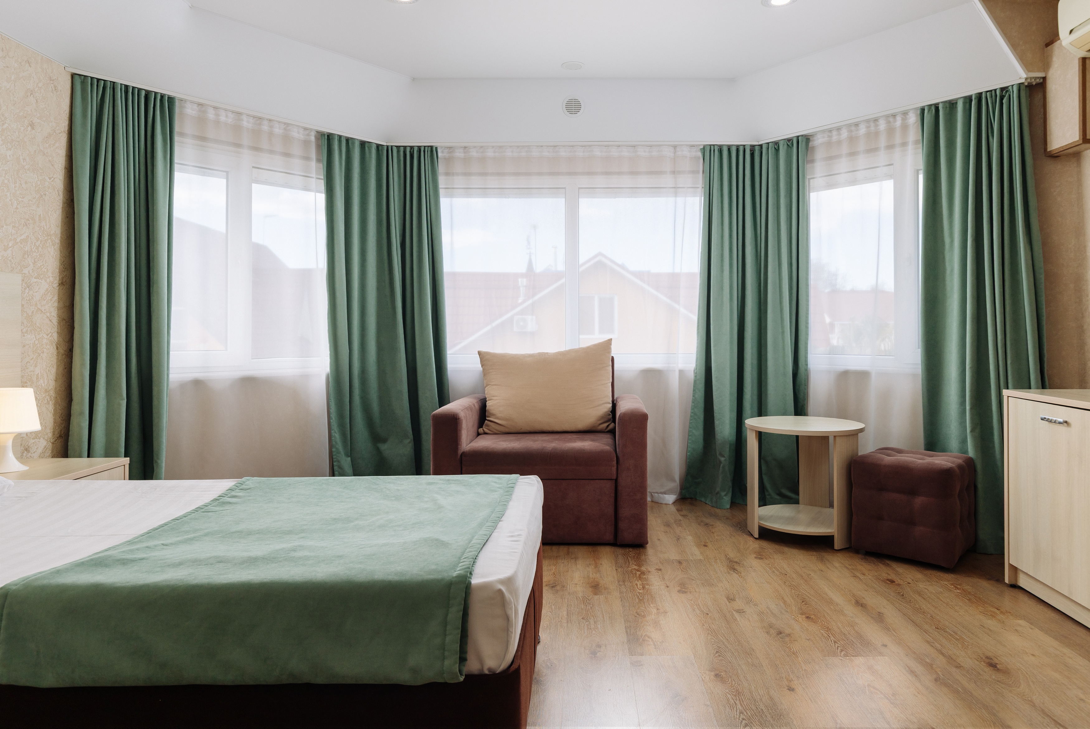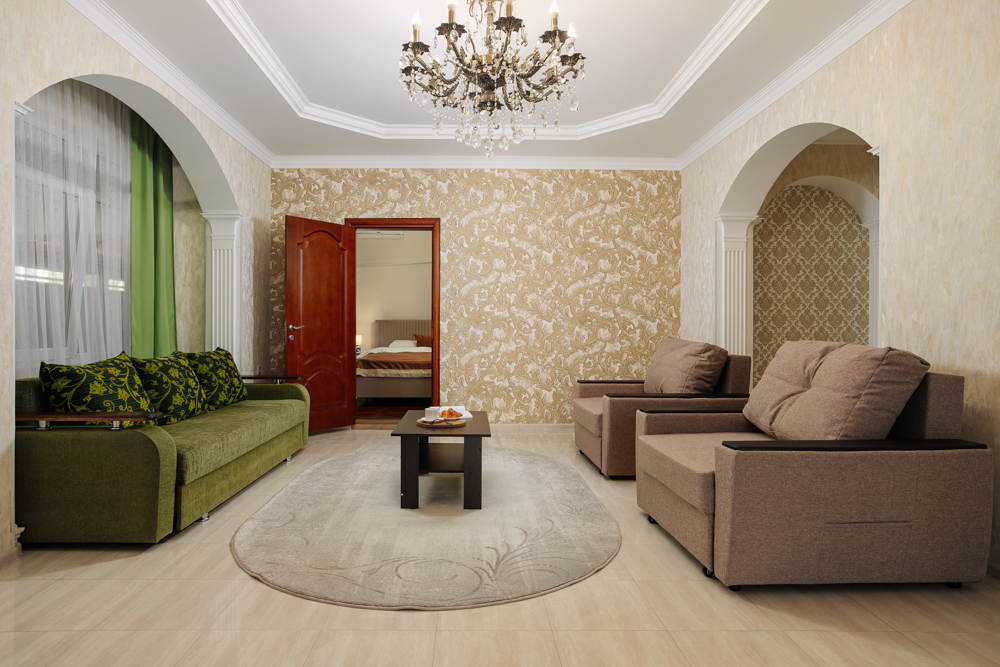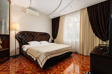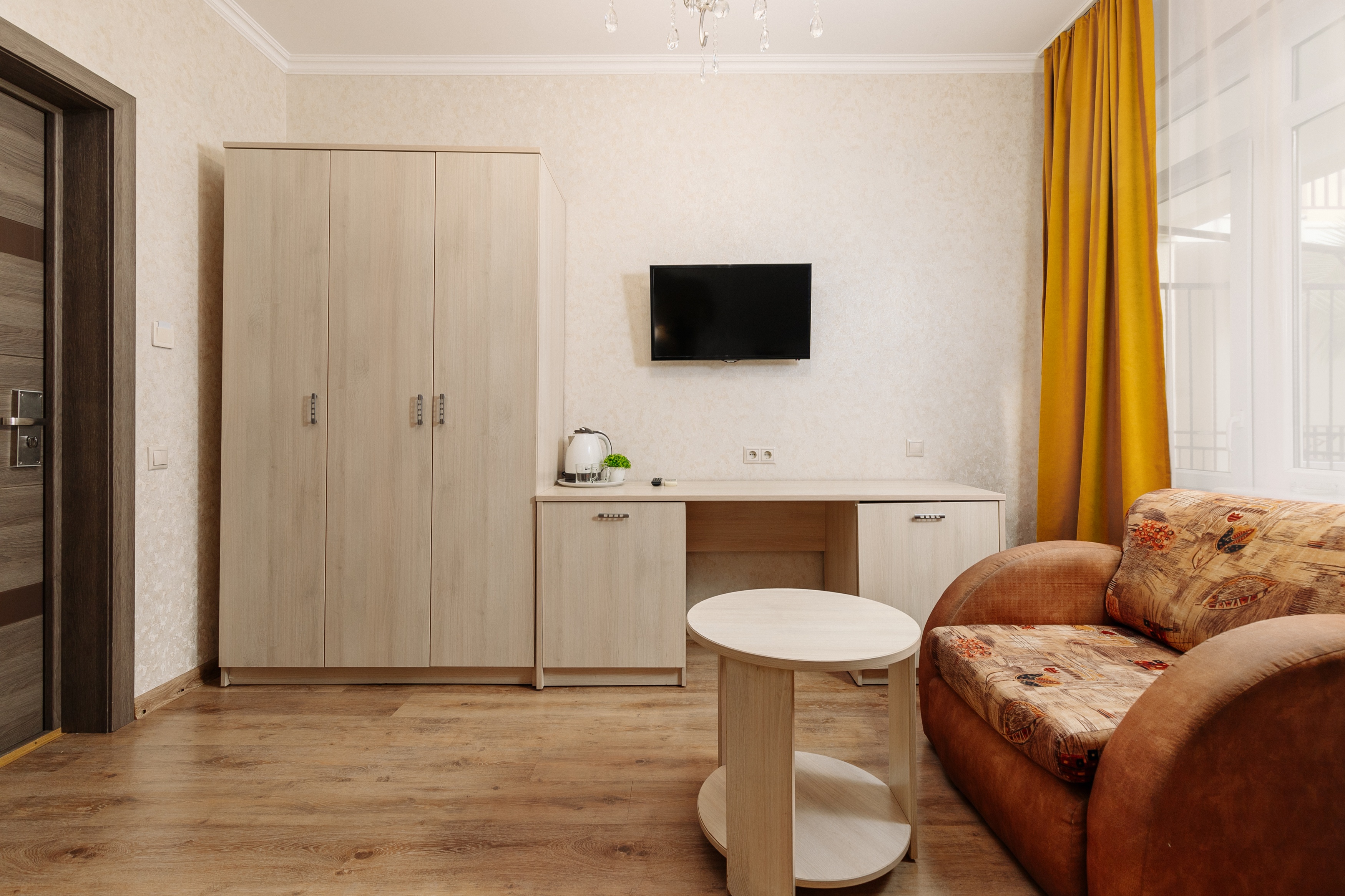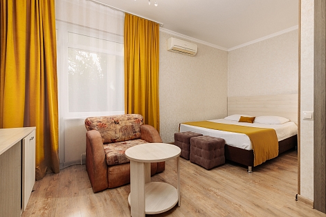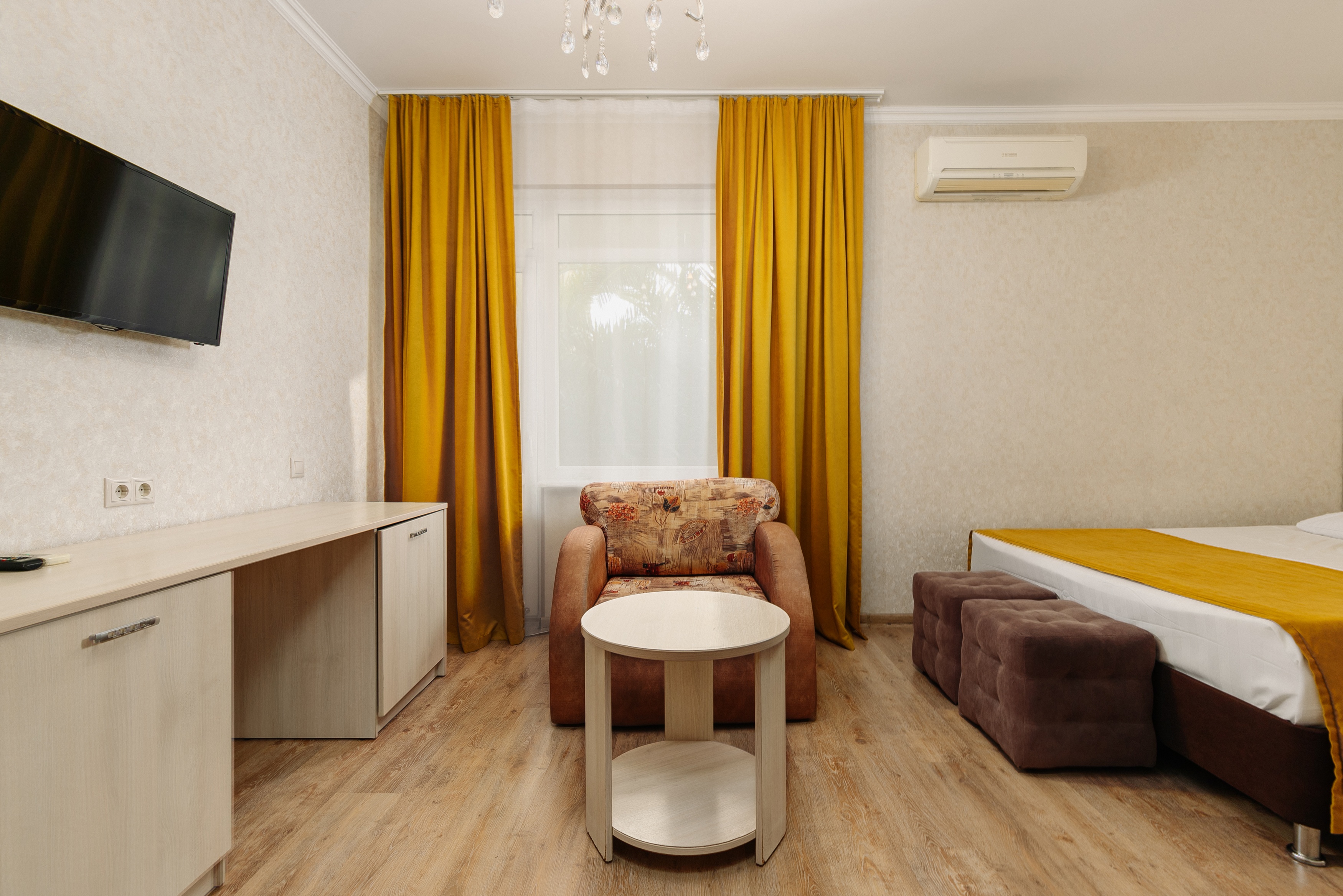 В номере: диван раскладной, зеркало, кресло-кровать, кровать двуспальная, стол, столик журнальный, стулья, шкаф, кондиционер, телевизор ЖК, холодильник, чайный набор посуды, электрочайник