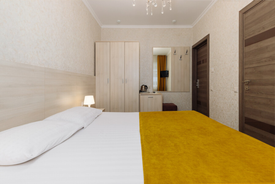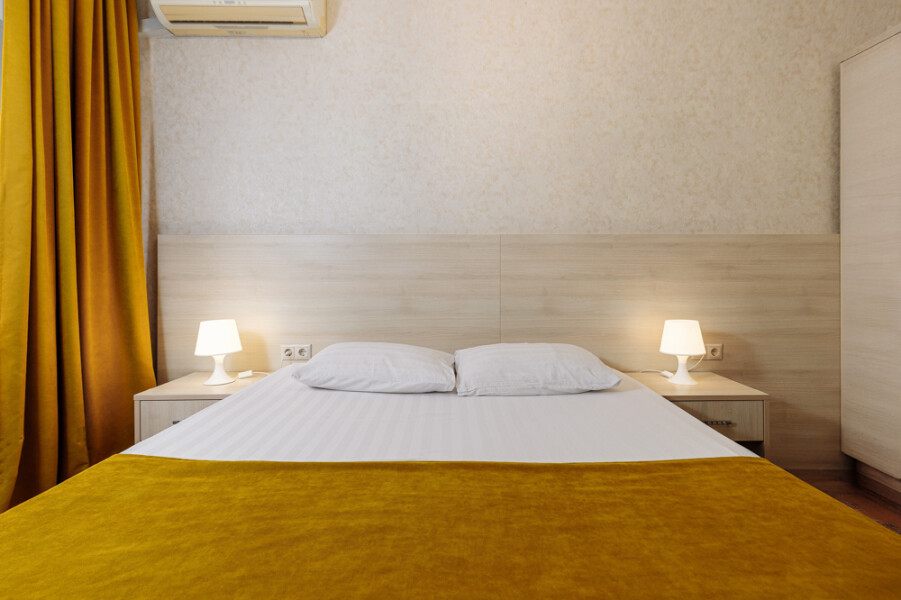 В номере: зеркало, кровать двуспальная, прикроватные тумбочки, стол, стулья, шкаф, кондиционер, телевизор ЖК, холодильник, электрочайник